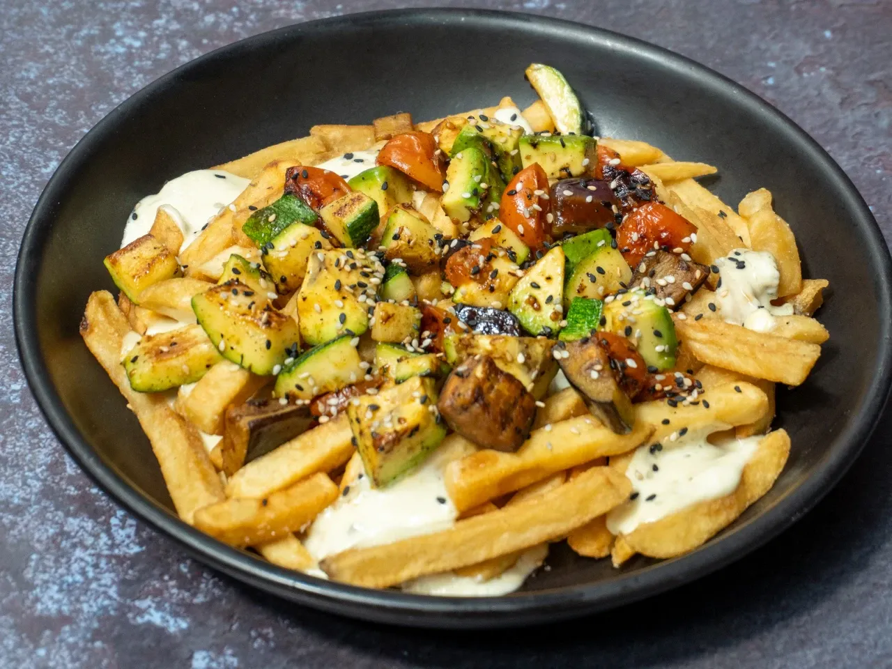 Papas fritas con berenjenas, tomates y zucchini salteados, palta asada, salsa de queso azul, mantequilla de ajo y ciboulette.