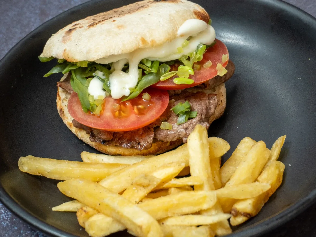 Churrasco a la plancha, palta hass, tomate fresco y mayo casera en pan artesanal hecho con masa de pizza y dorado en mantequilla.