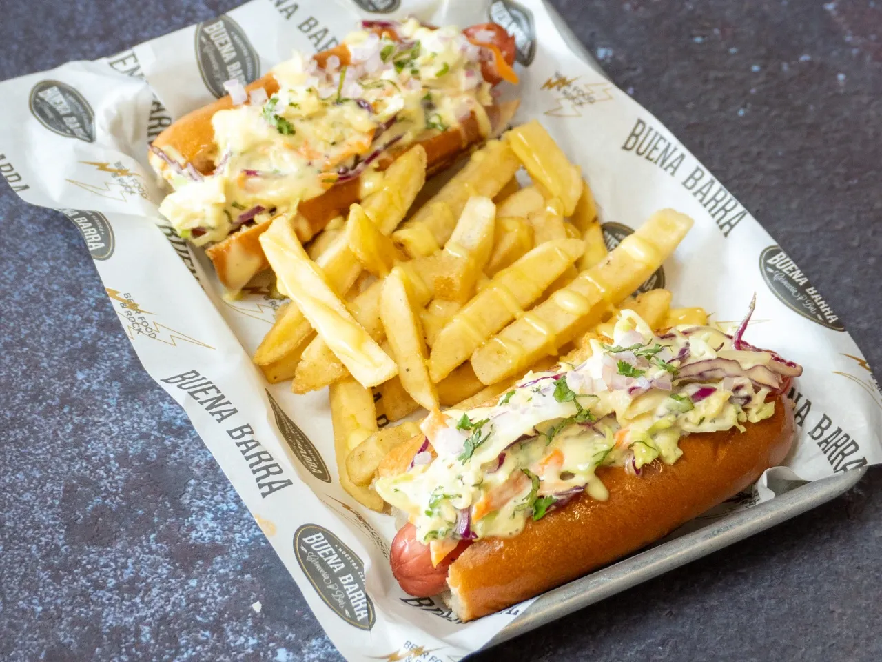 Bastones de congrio dorado en tempura con papas fritas, salsa tártara de pepinillos y limón asado.