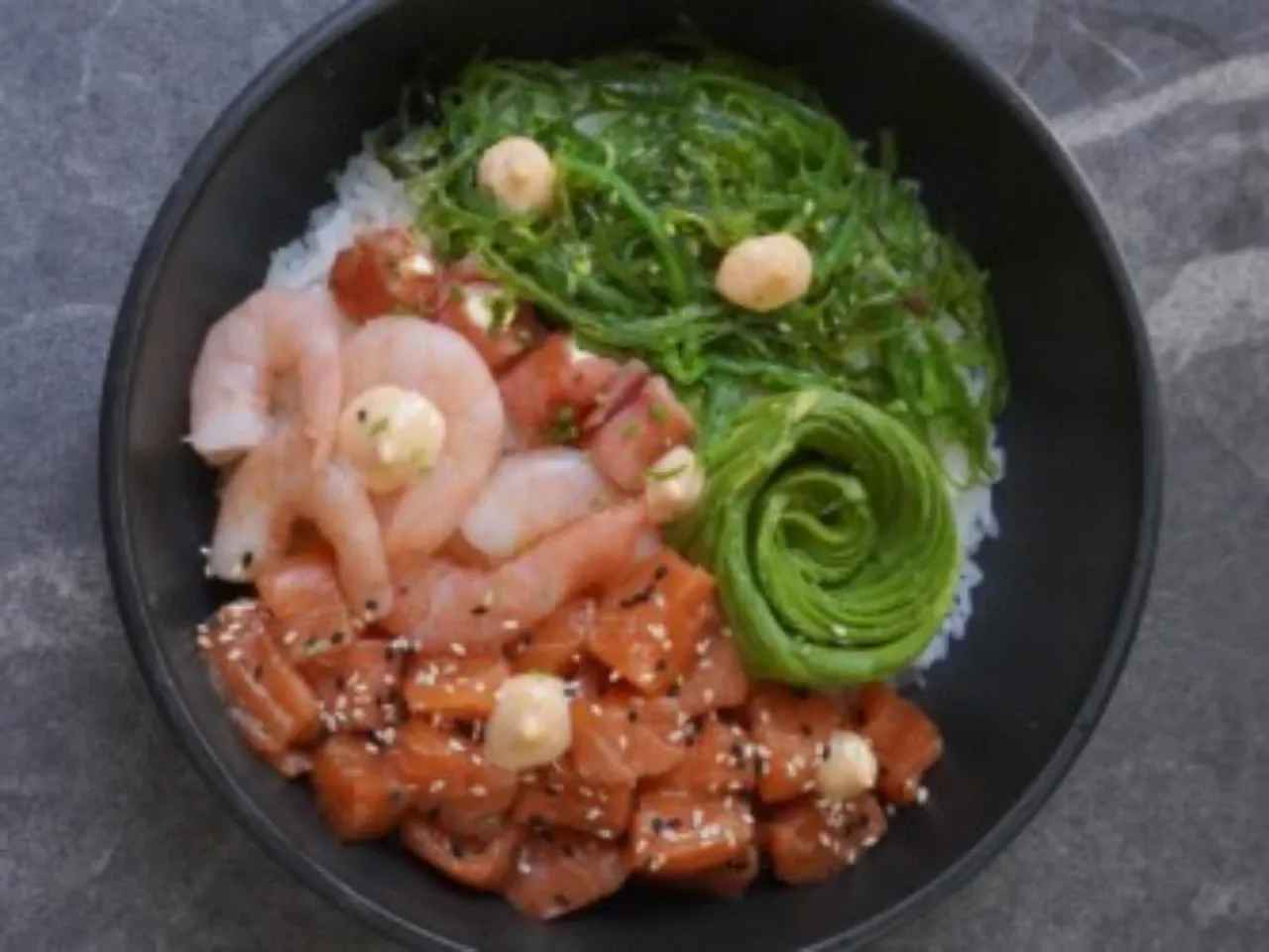 Camarón marinado, atún fresco, salmón, palta, wakame, queso crema y un toque de salsa spicy.