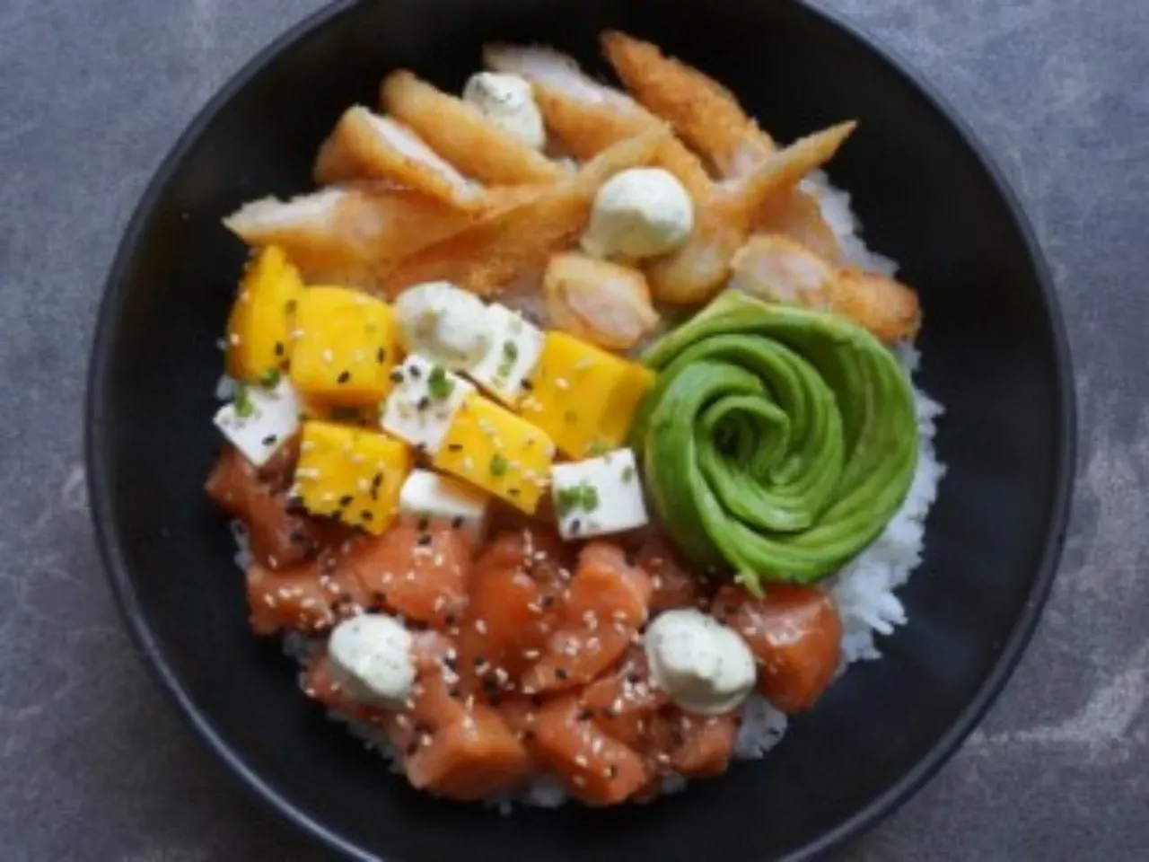 Camarón crocante y salmón fresco en trozos, combinados con queso crema, palta laminada, mango y un toque de salsa spicy.