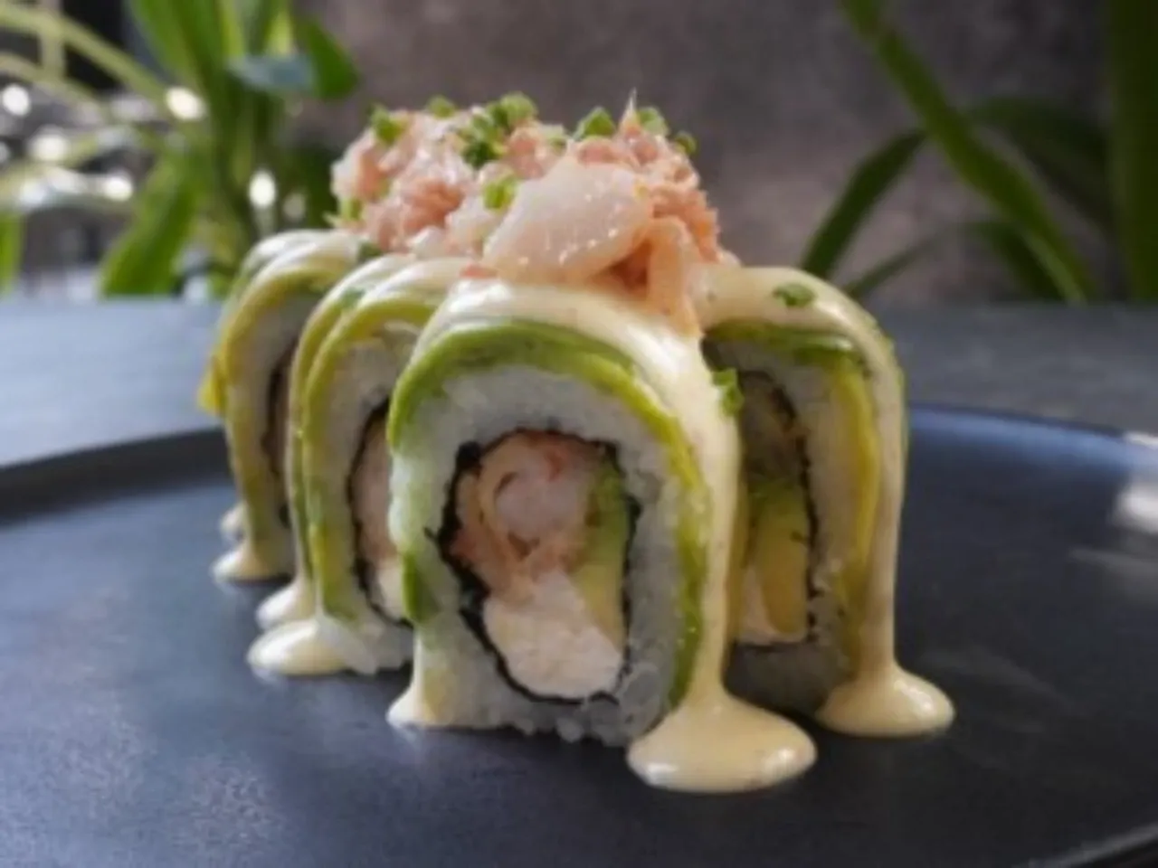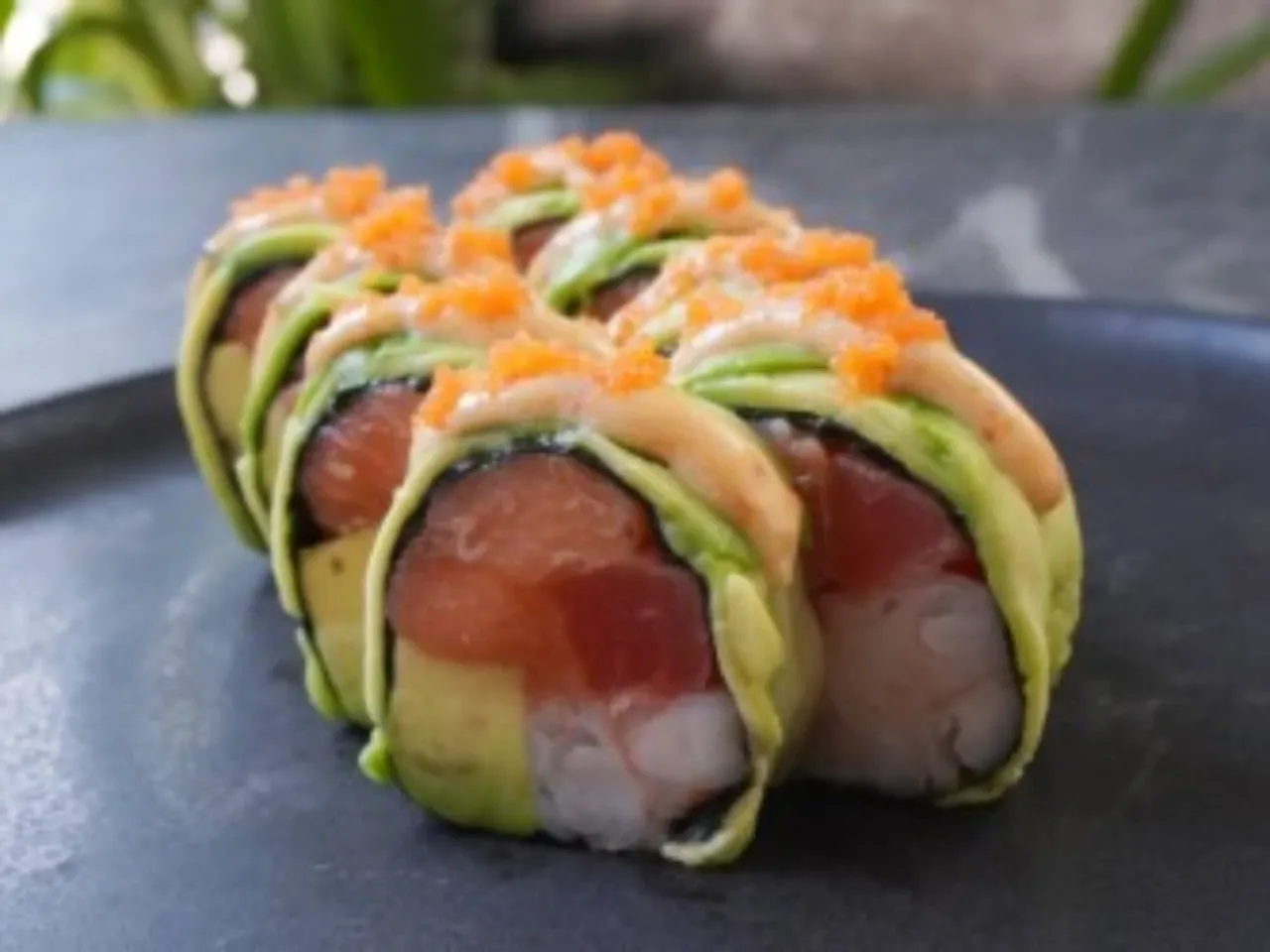 Salmón, camarón, atún y palta, envuelto en palta, salsa spicy, masago y un toque de shichimi togarashi.