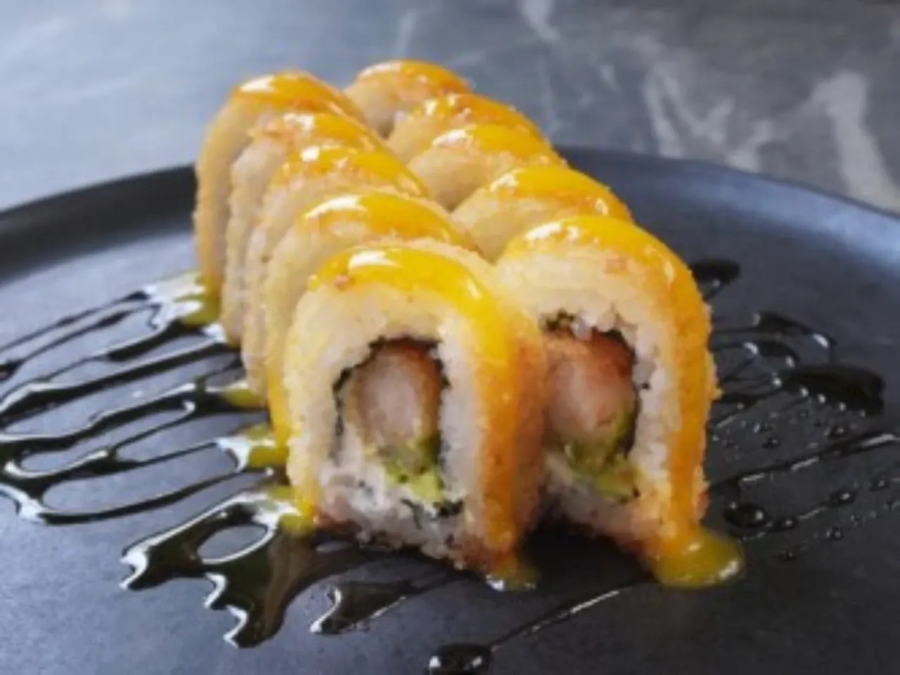 Camarón apanado, queso crema y palta, cubierto en panko crocante frito y un gloss de teriyaki y salsa de mango.