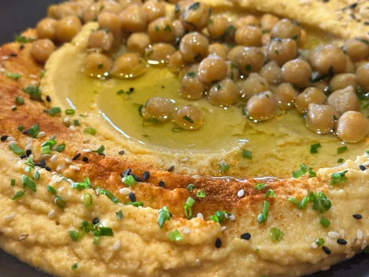 Pure de garbanzos sazonado con aceite de sésamo, oliva, jengibre y limón. Acompañado de ensalada tibia de granos salteados con finas hierbas, sésamo negro y pan pita casero tostado.