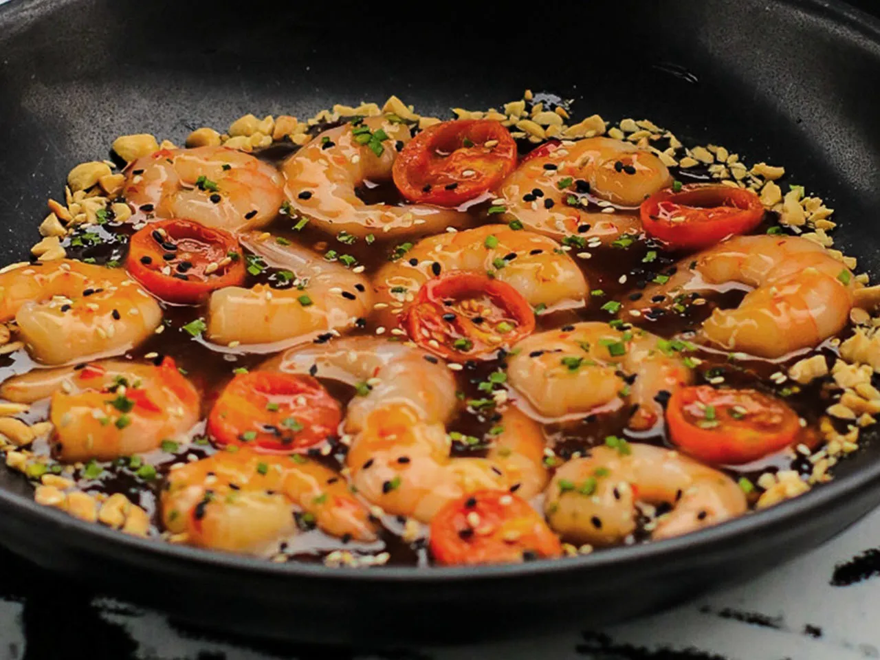 Camarones asados salteados en salsa agridulce estilo spring roll, acompañados con tomate cherry asado, mani tostado, ciboulette y un toque de aceite de jengibre.