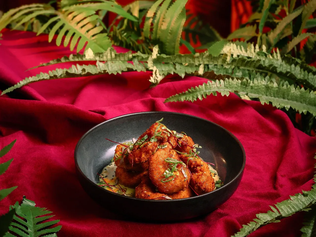 Camarones apanados, acompañados de leche de tigre verde y salsa de aji amarillo.