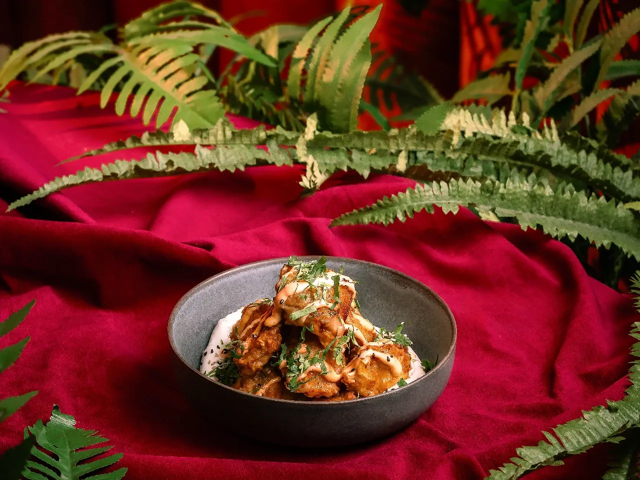 Falafel especiado al estilo caoba, acompañado de crema acida y guasacaca.