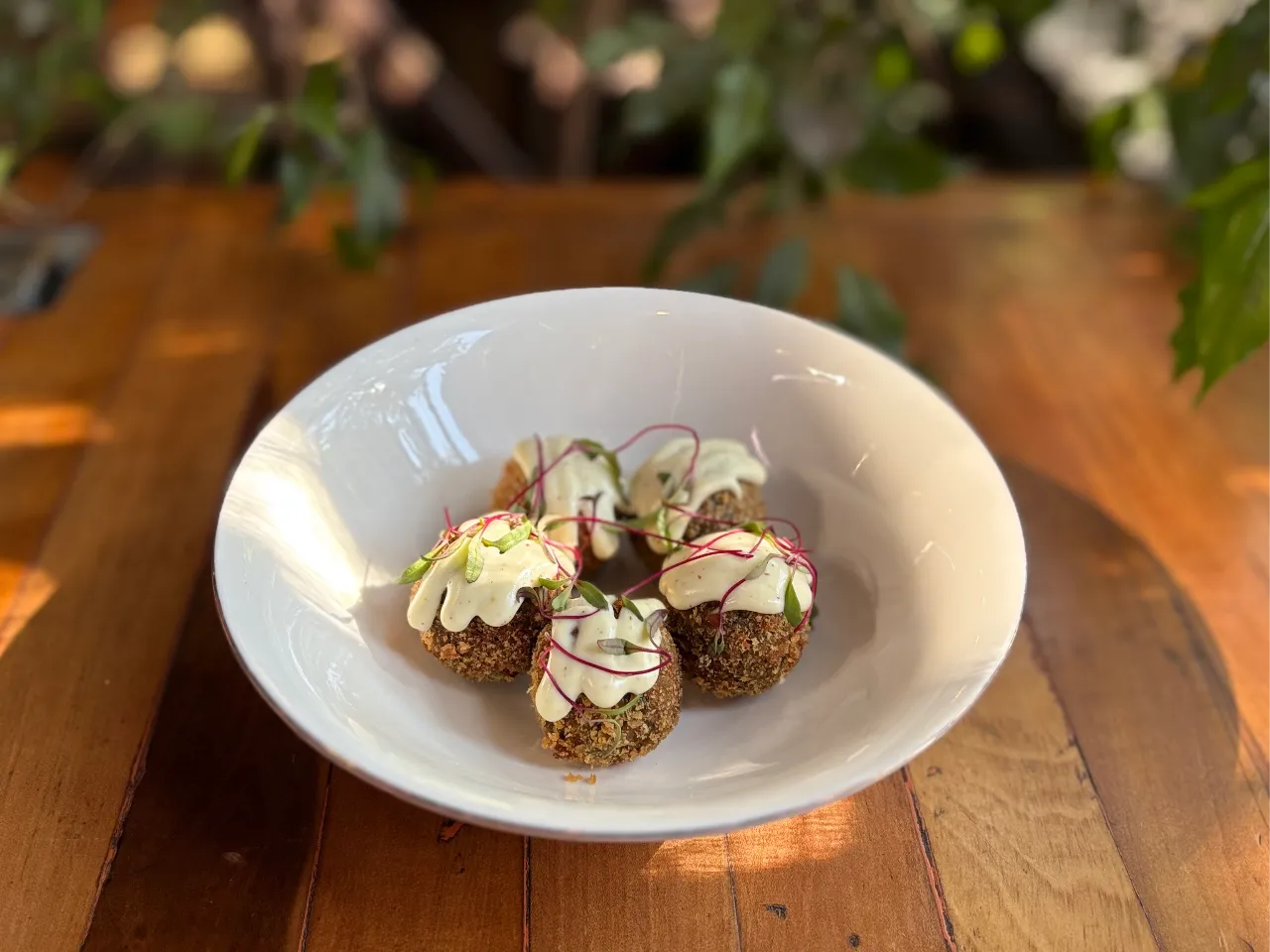 Croqueta de risotto de hongos y queso mantecoso en el centro con alioli trufada.