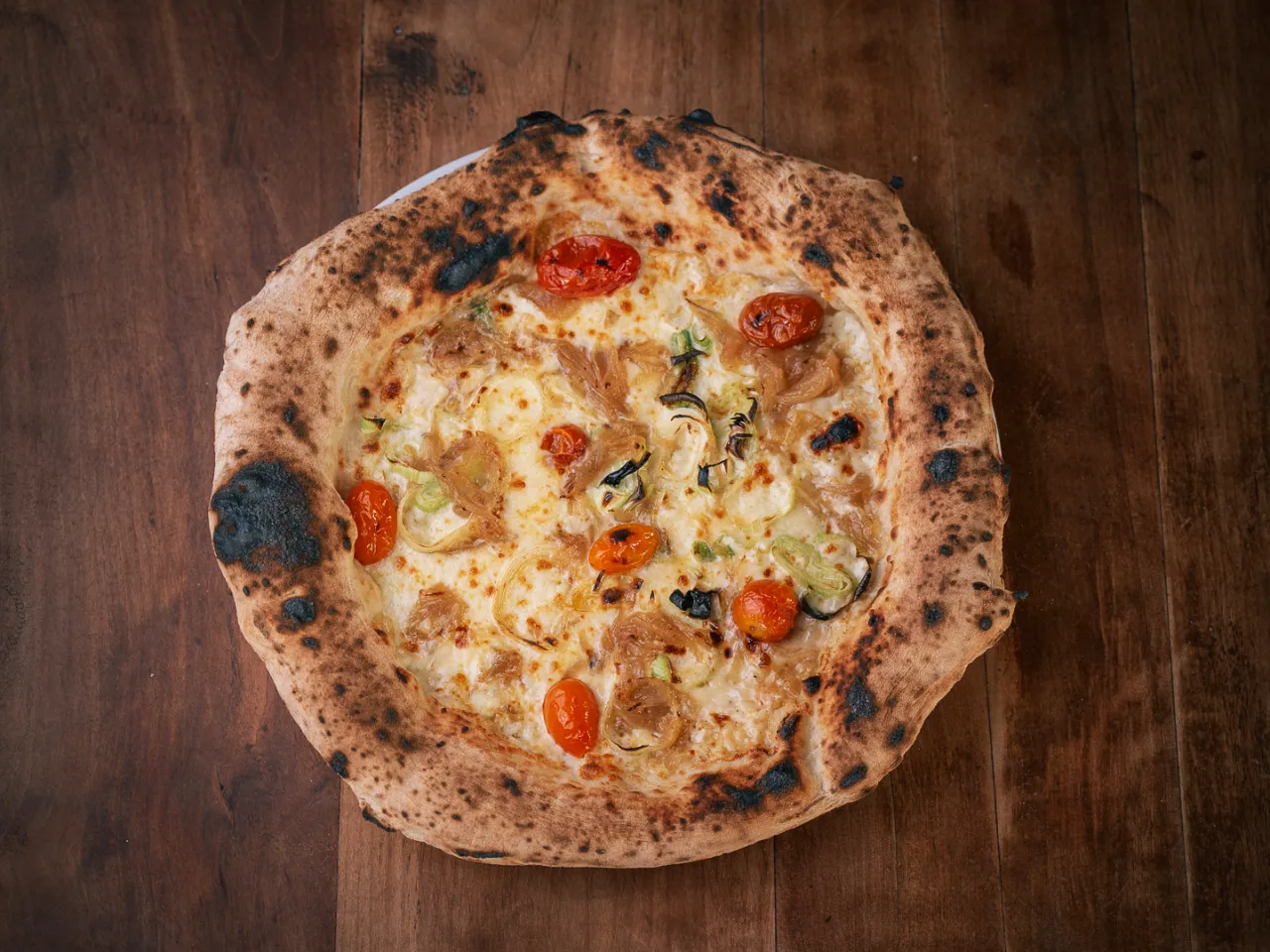 Base de fondue de queso parmesano Grana Padano (Italia), mozzarella, puerros salteados, cebolla caramelizada, tomates cherry confitados en oliva
