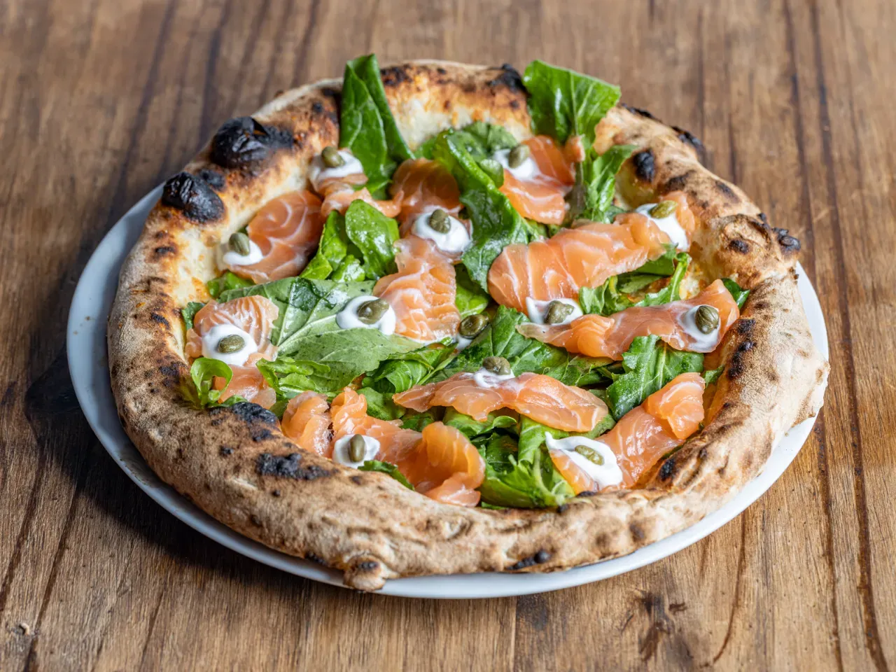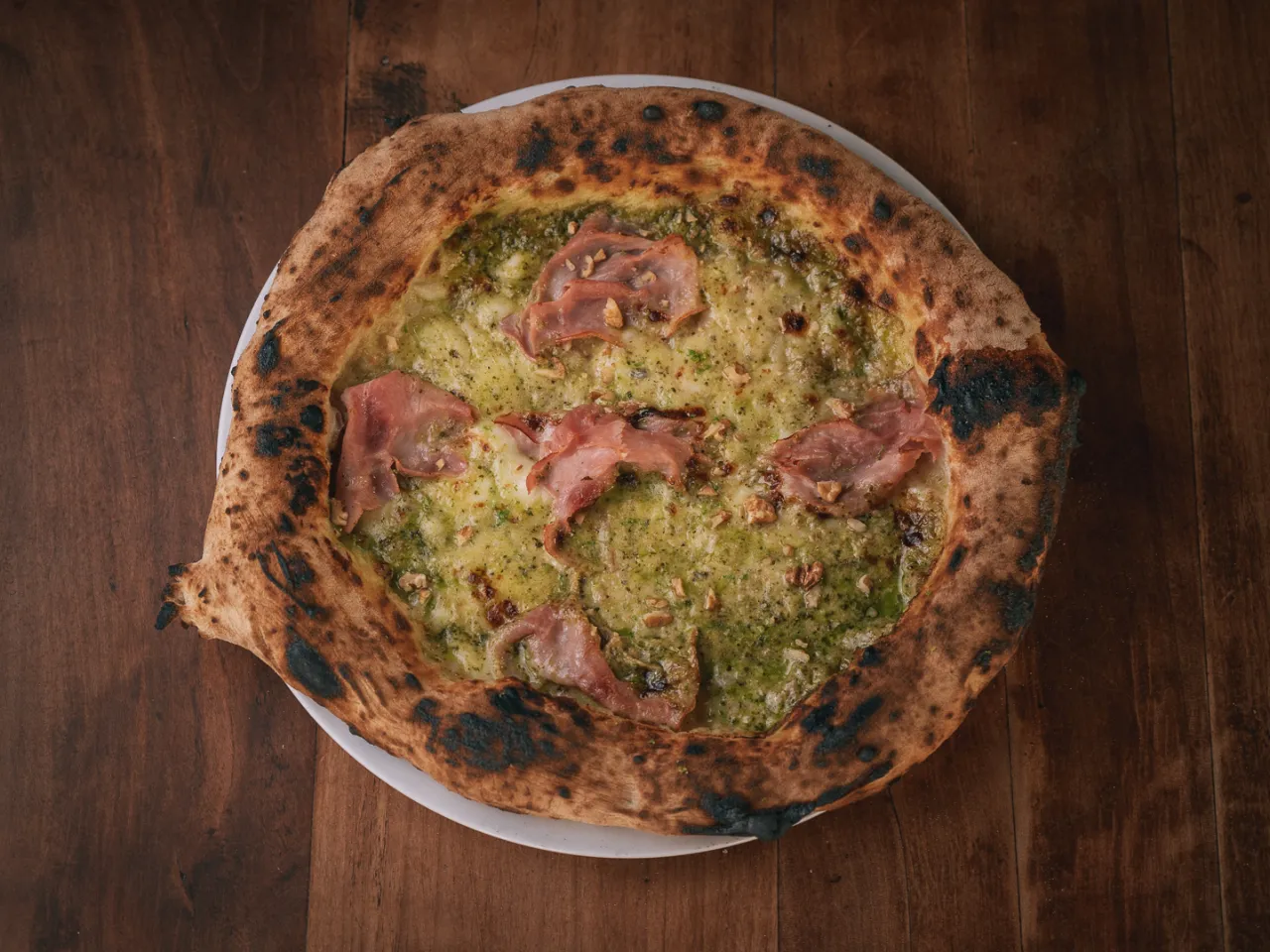 Base de suave crema y pesto Alla Genovese, mozzarella Fior di Latte (Italia), prosciutto Cotto (Jamón selección), toques de pistaccio, toques de Limón