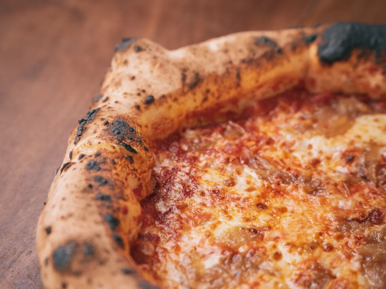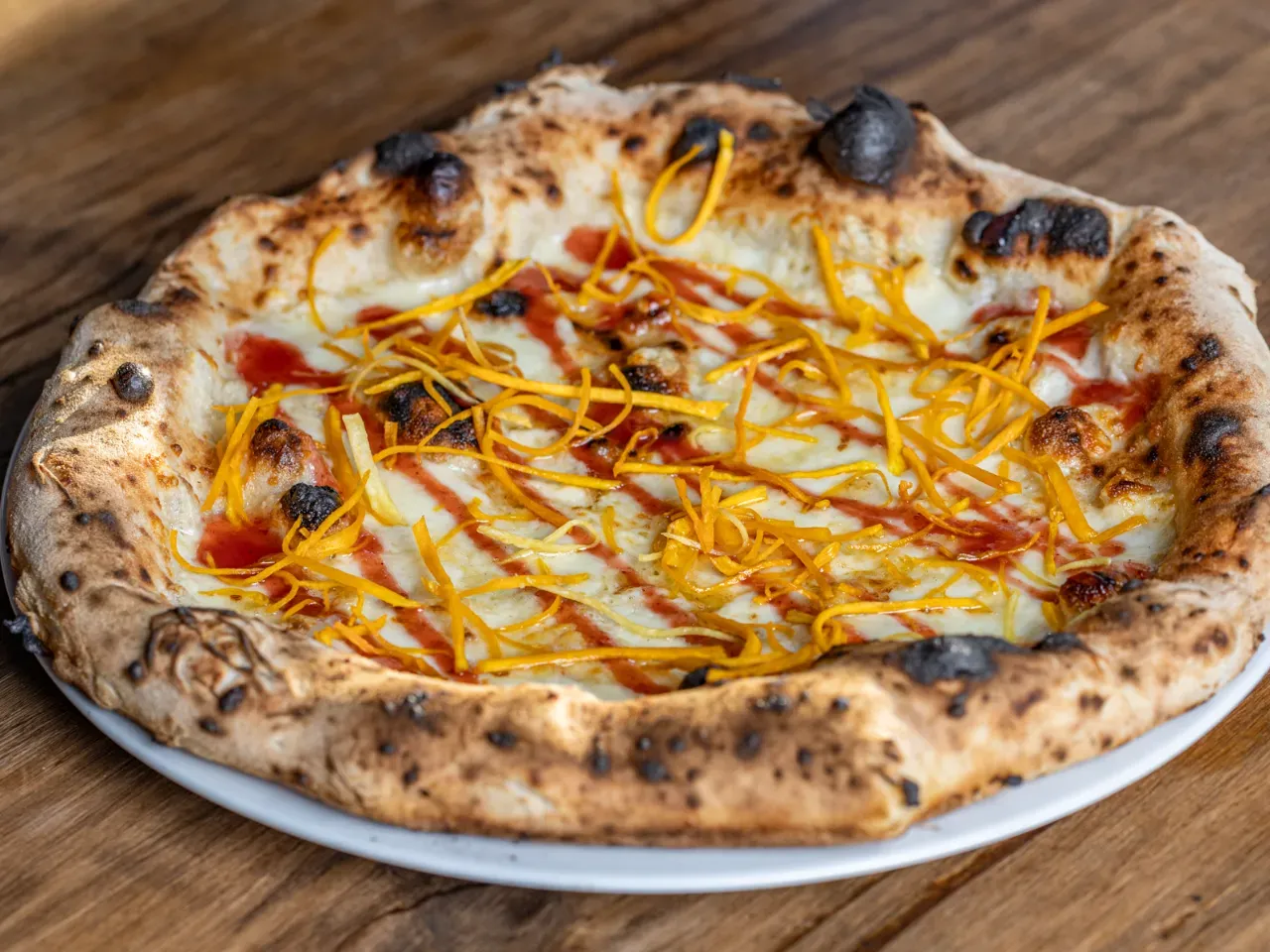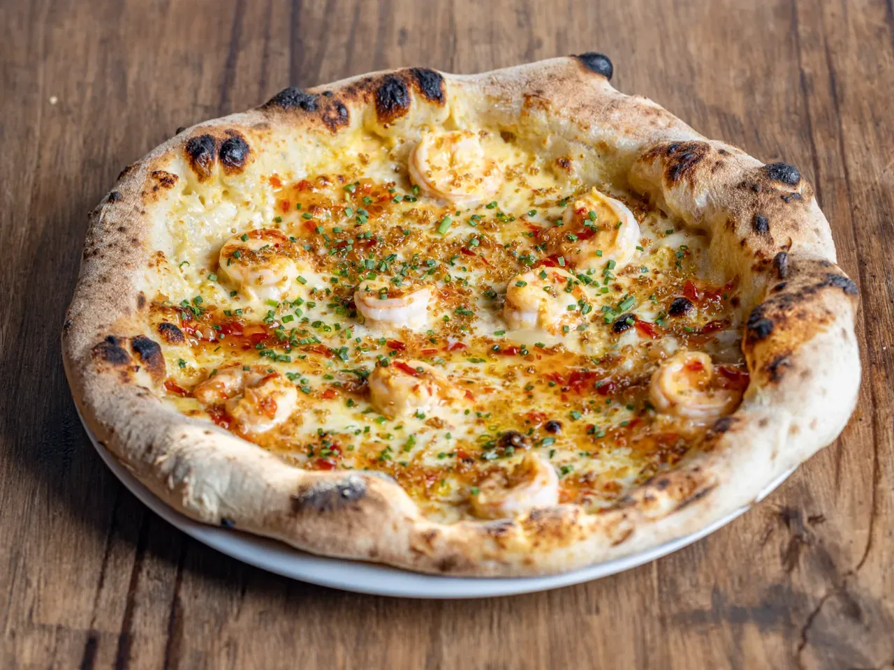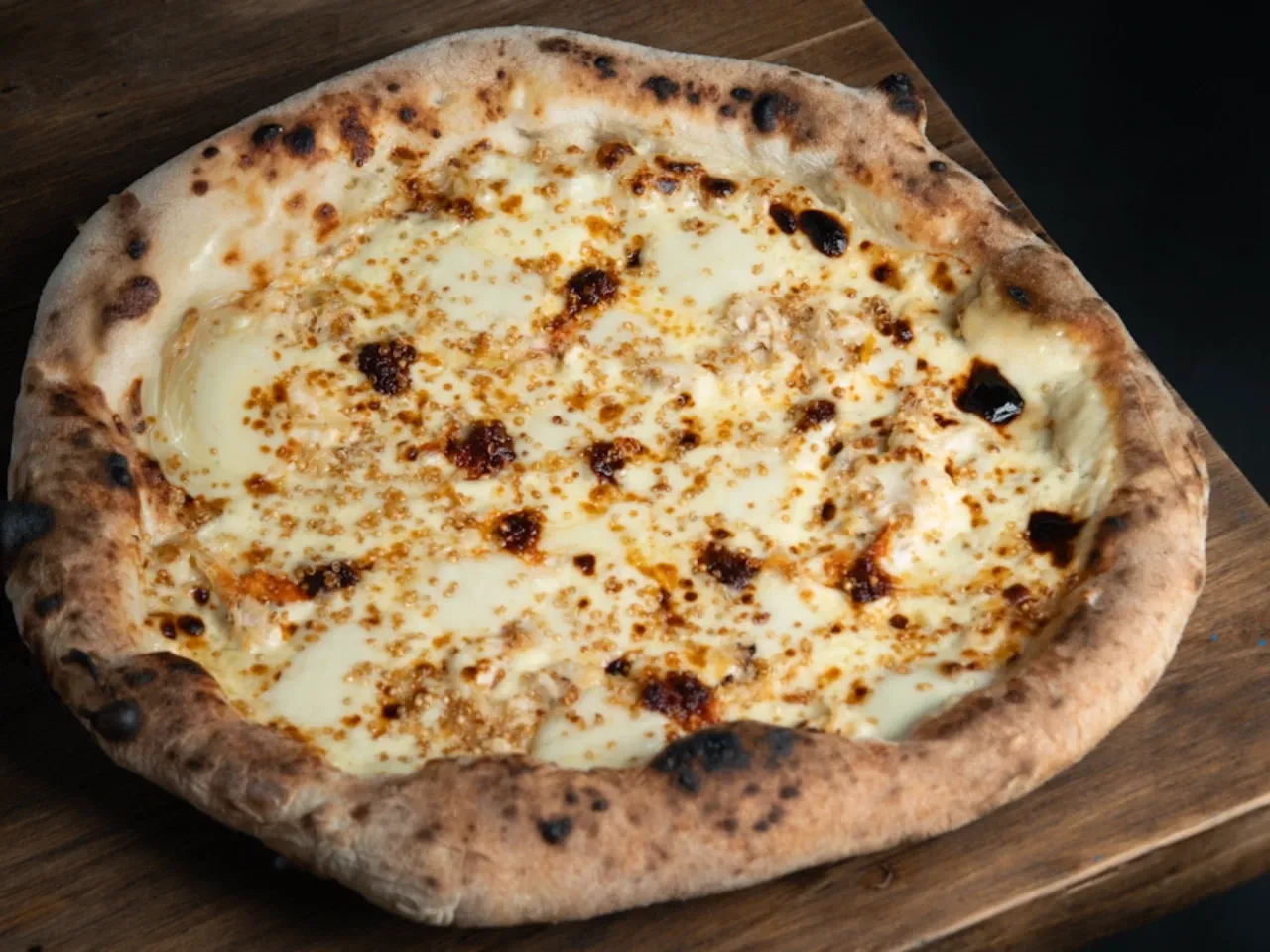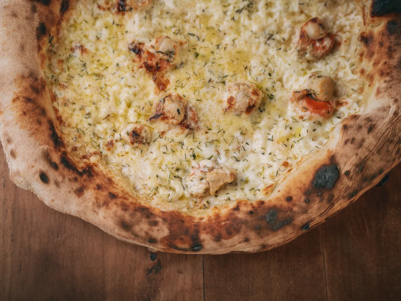 Pizza con base de Fondu de queso parmesano Grana Padano (Italia), Queso provolone, Queso Mozzarella, Jaiba , Nduja, Quinoa Crocante y Vino Blanco