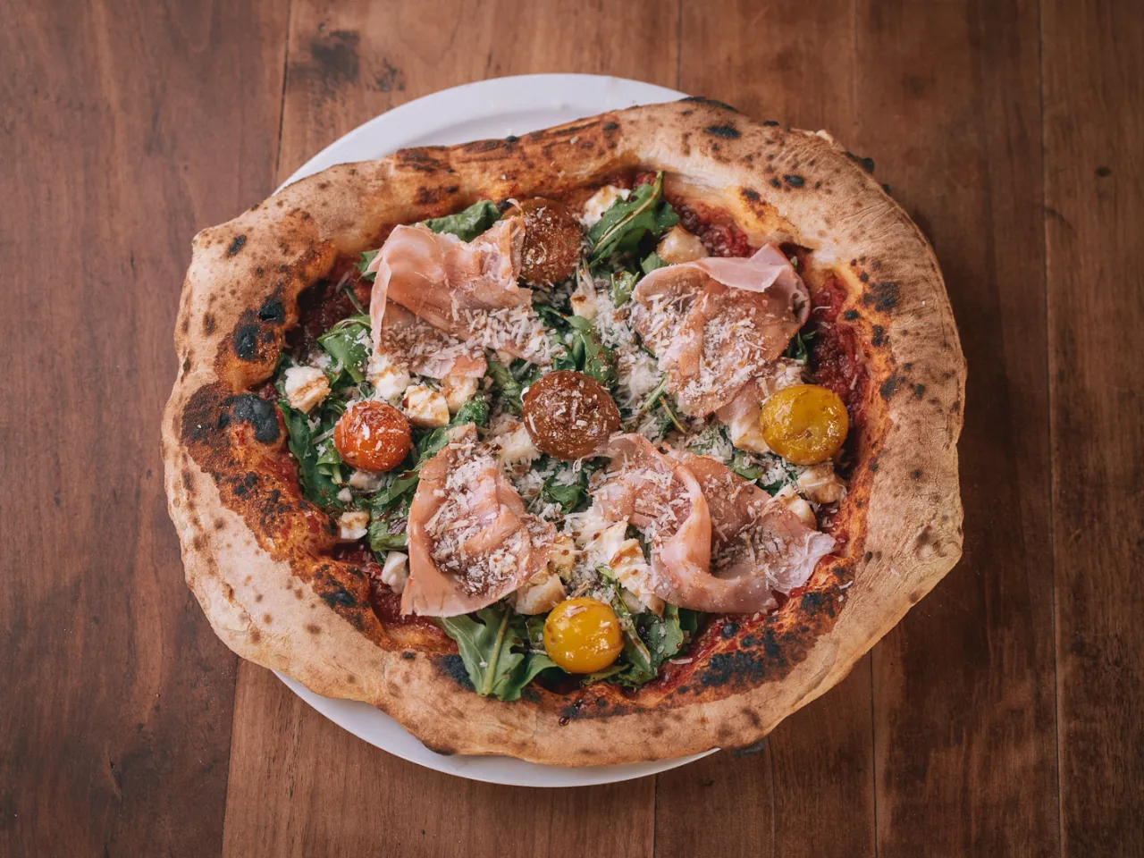 ¡Pizza fresca! Base de Pomodoro (Italia), mozzarella Fior di Latte (Italia), rúcula, tomate cherry, prosciutto cotto (jamón selección) y glass de ceto balsámico