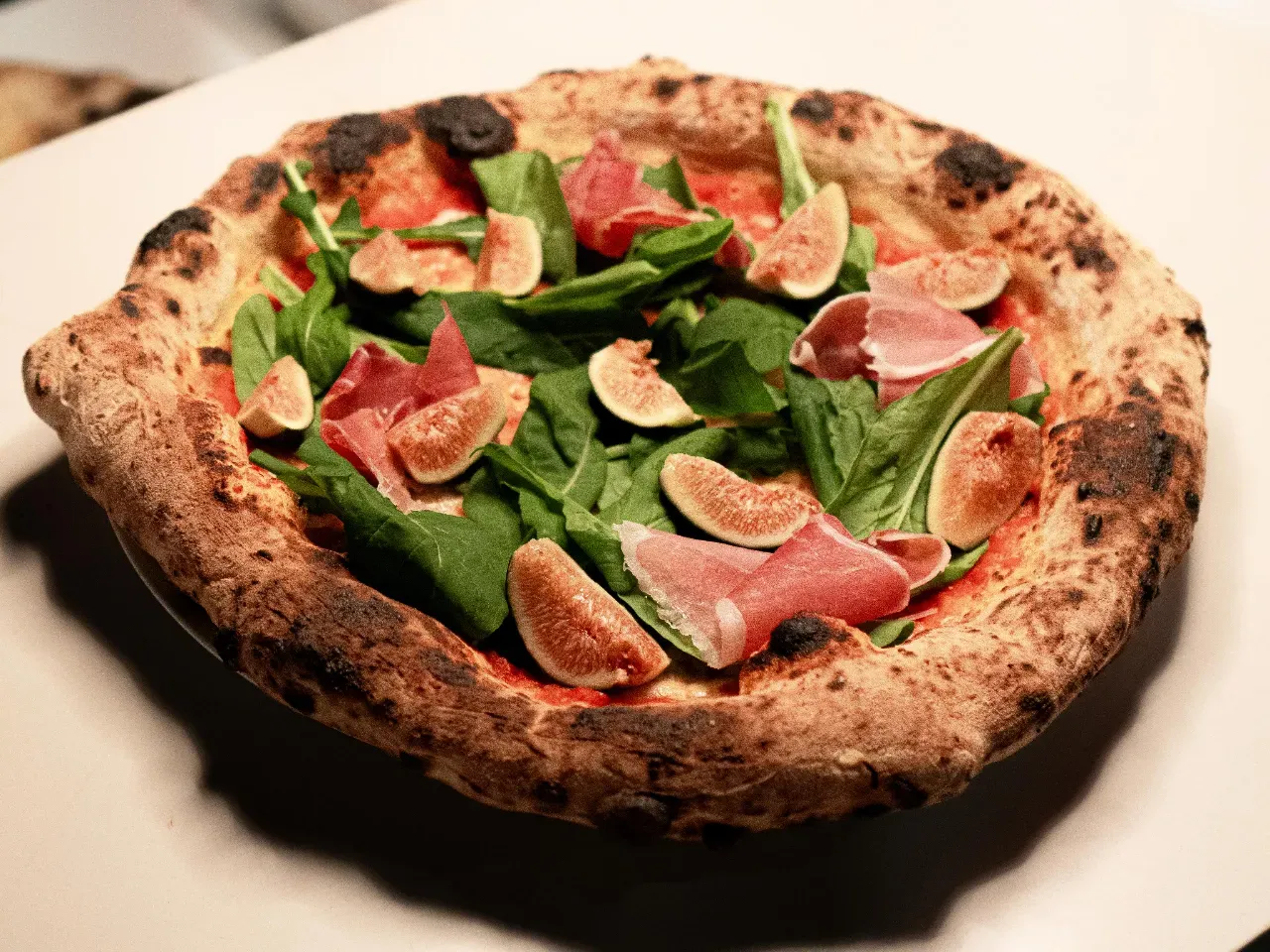 Pizza de Pomodoro, Mozzarella, Queso Azul, Prosciutto (Jamón crudo importado de Italia), Higos frescos y Rúcula. Pizza de la estación Enero a Abril.