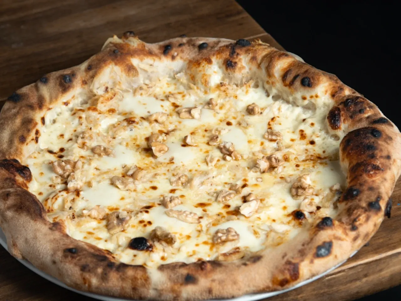 Pizza con base de Fondu de queso parmesano Grana Padano (Italia), Queso provolone, Queso Mozzarella, Jaiba , Nueces y Vino Blanco