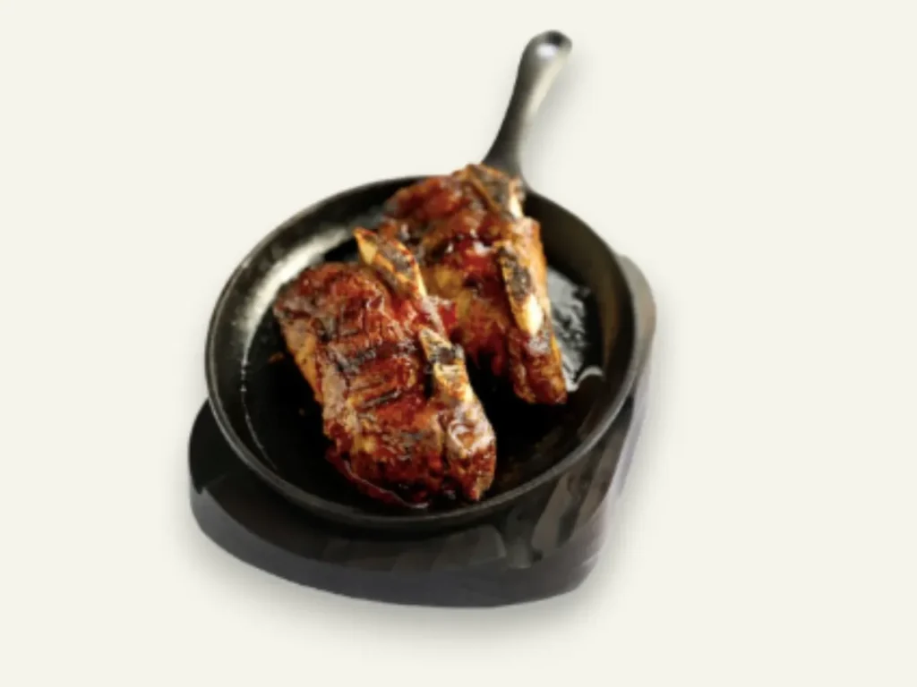 Costillar de cerdo glaseado en salsa BBQ de arándanos acompañado de puré rustico de papa bruja.