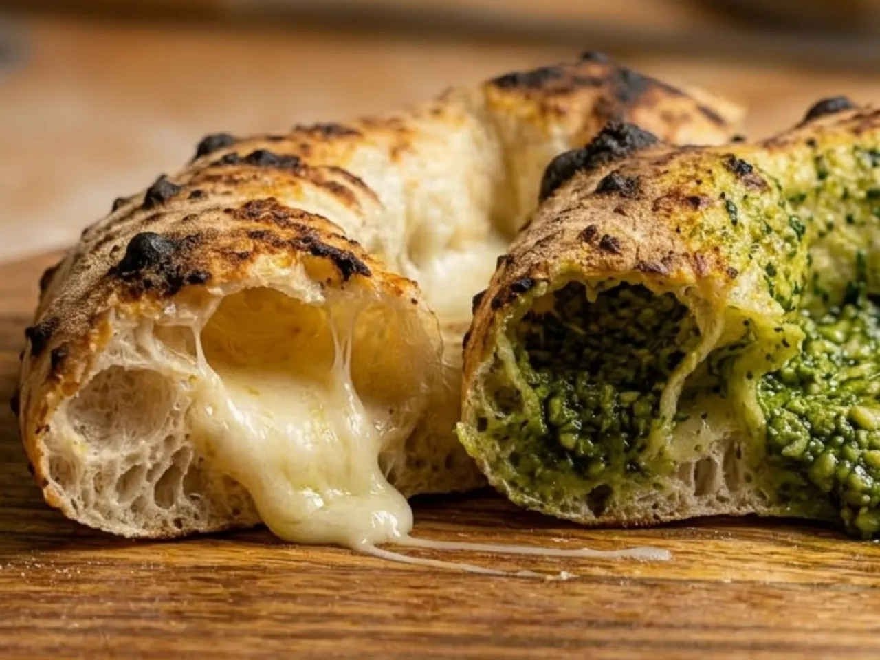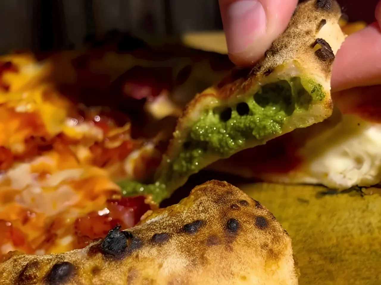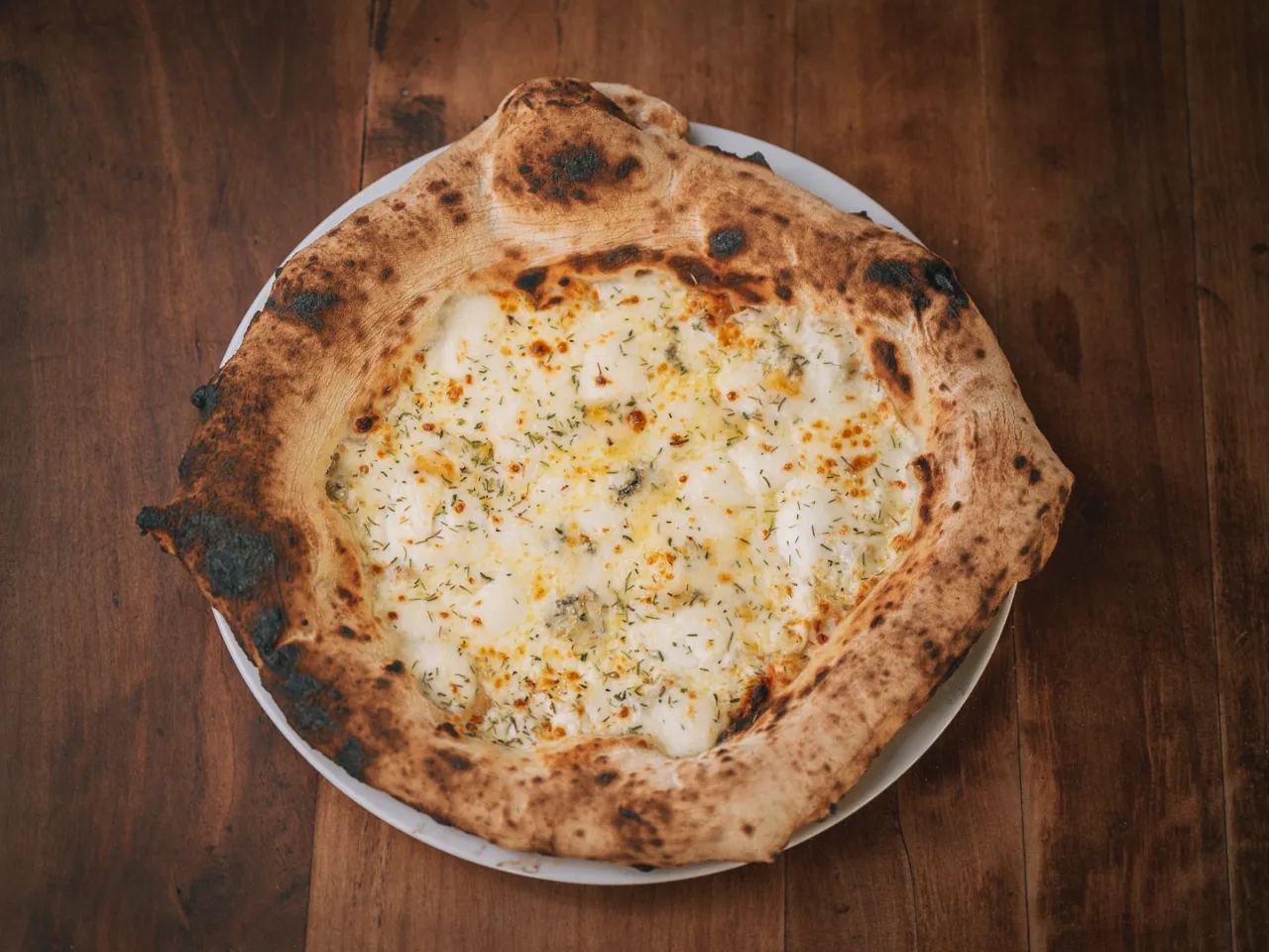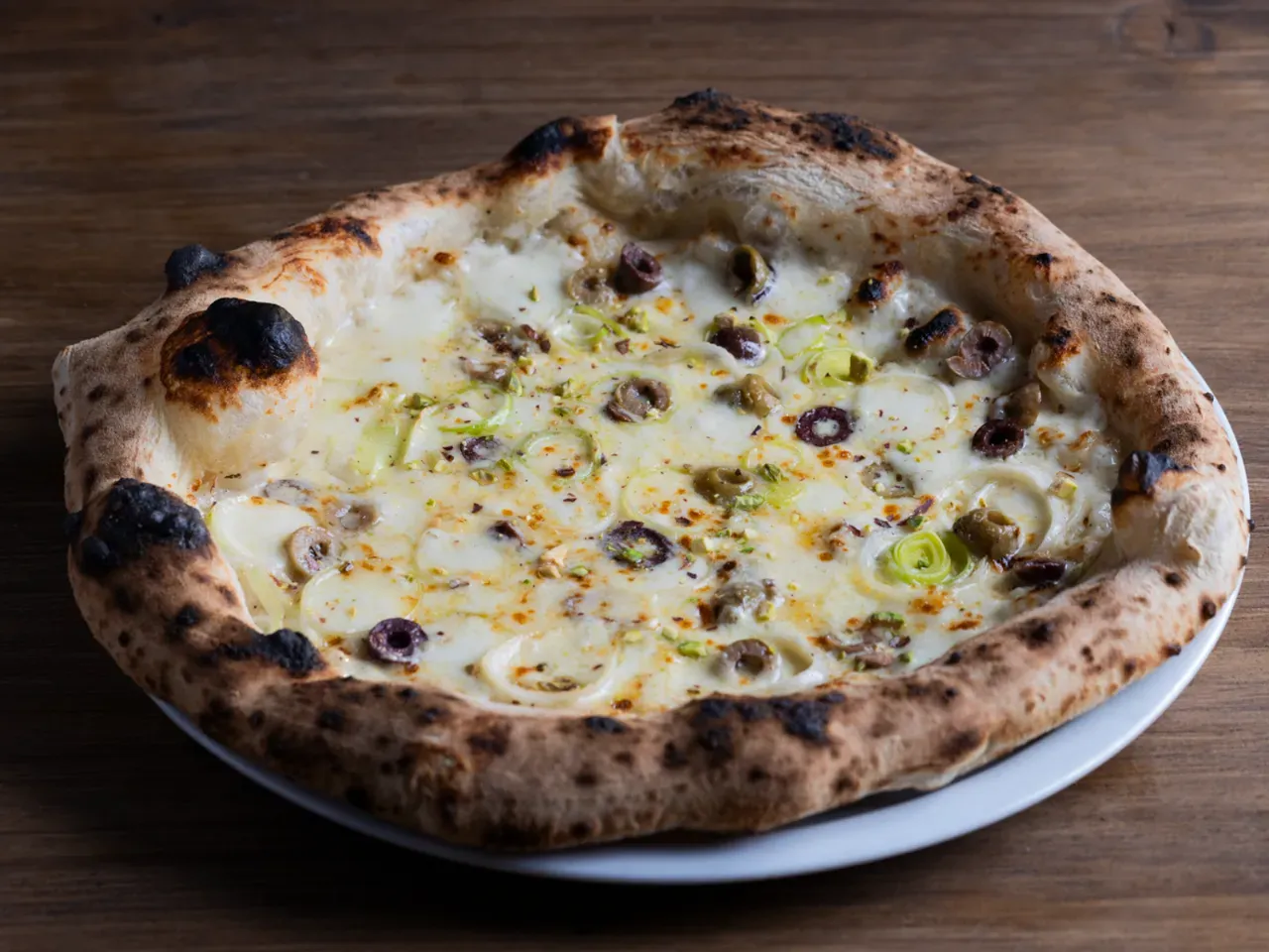 Pizza de Provoleta a la Argentina: Base blanca, queso Provolone, queso Mozzarella, Aceituna Tre Sappore (Italia), Toques de ciboulette y Pistaccios