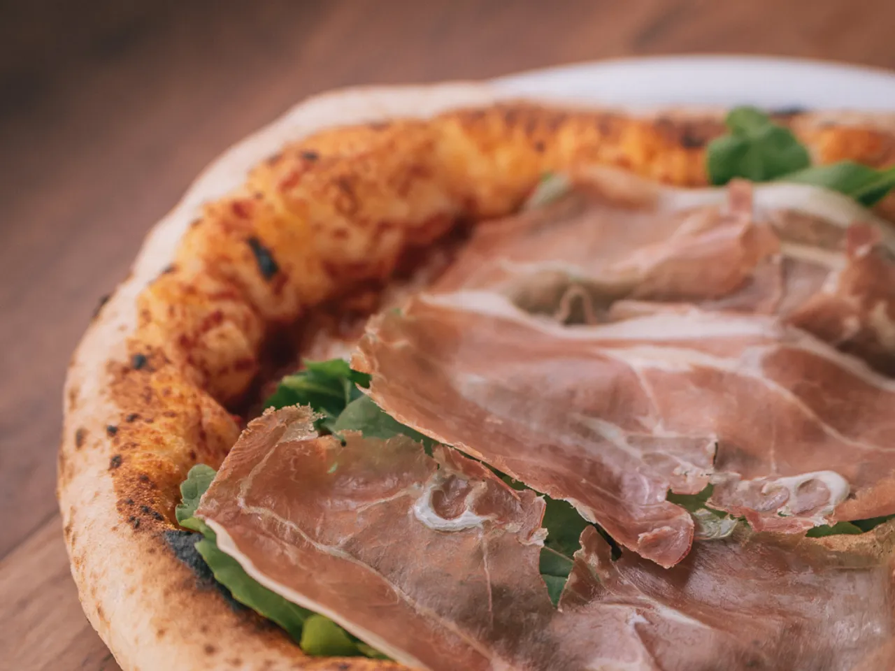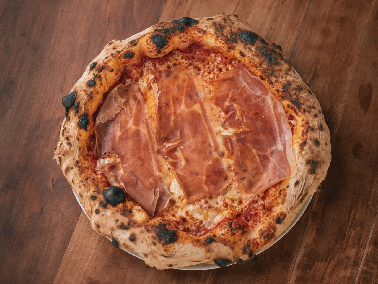Pomodoro (Italia), mozzarella, queso azul, prosciutto (Jamón curado importado de Italia) y rúcula.