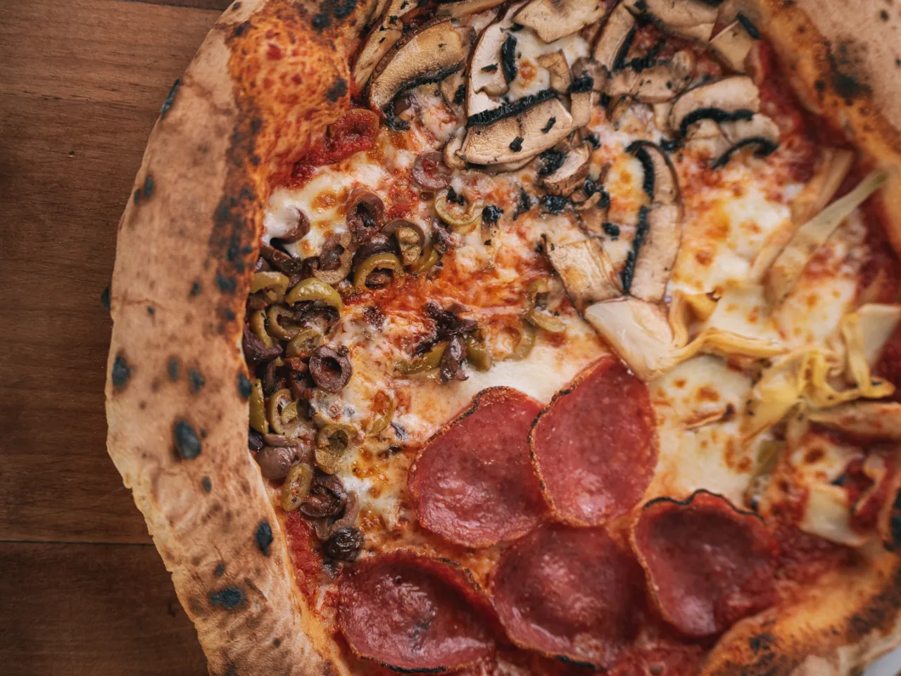 Pomodoro (Italia), mozzarella, alcachofas al olivo, salame tostado, aceitunas tre sappore (mix de aceitunas importadas de Italia), champiñón Portobello