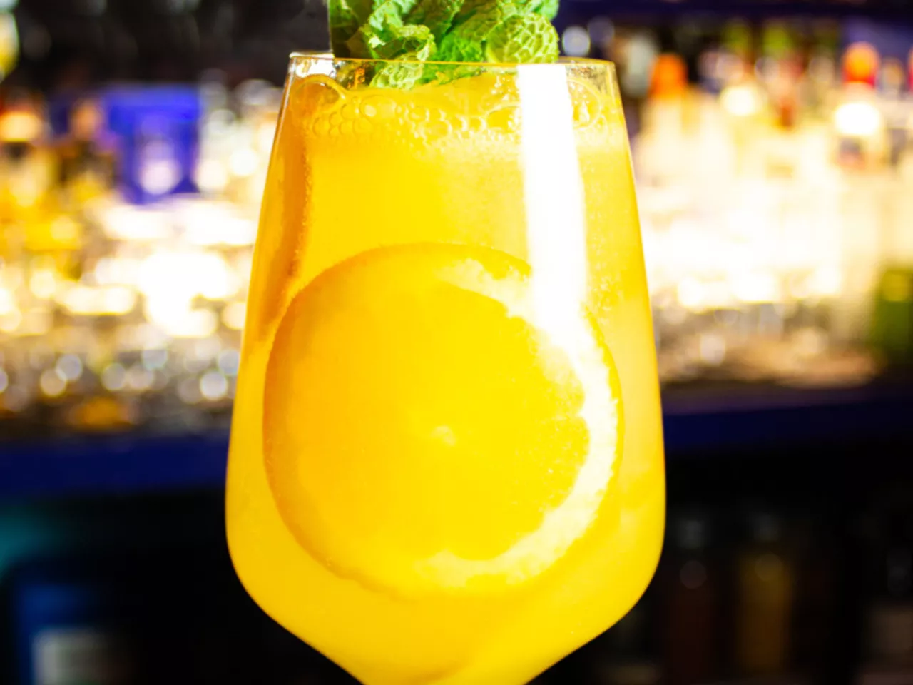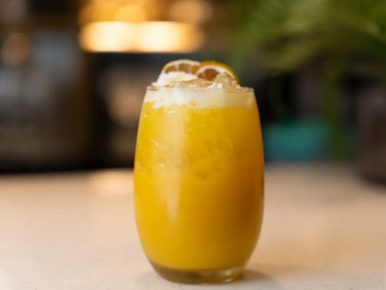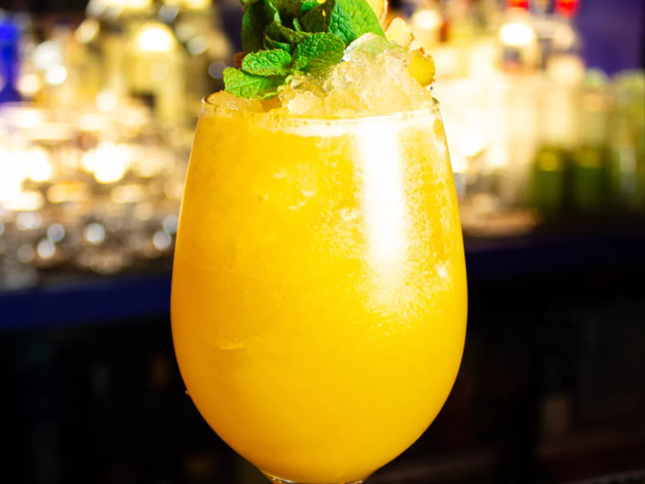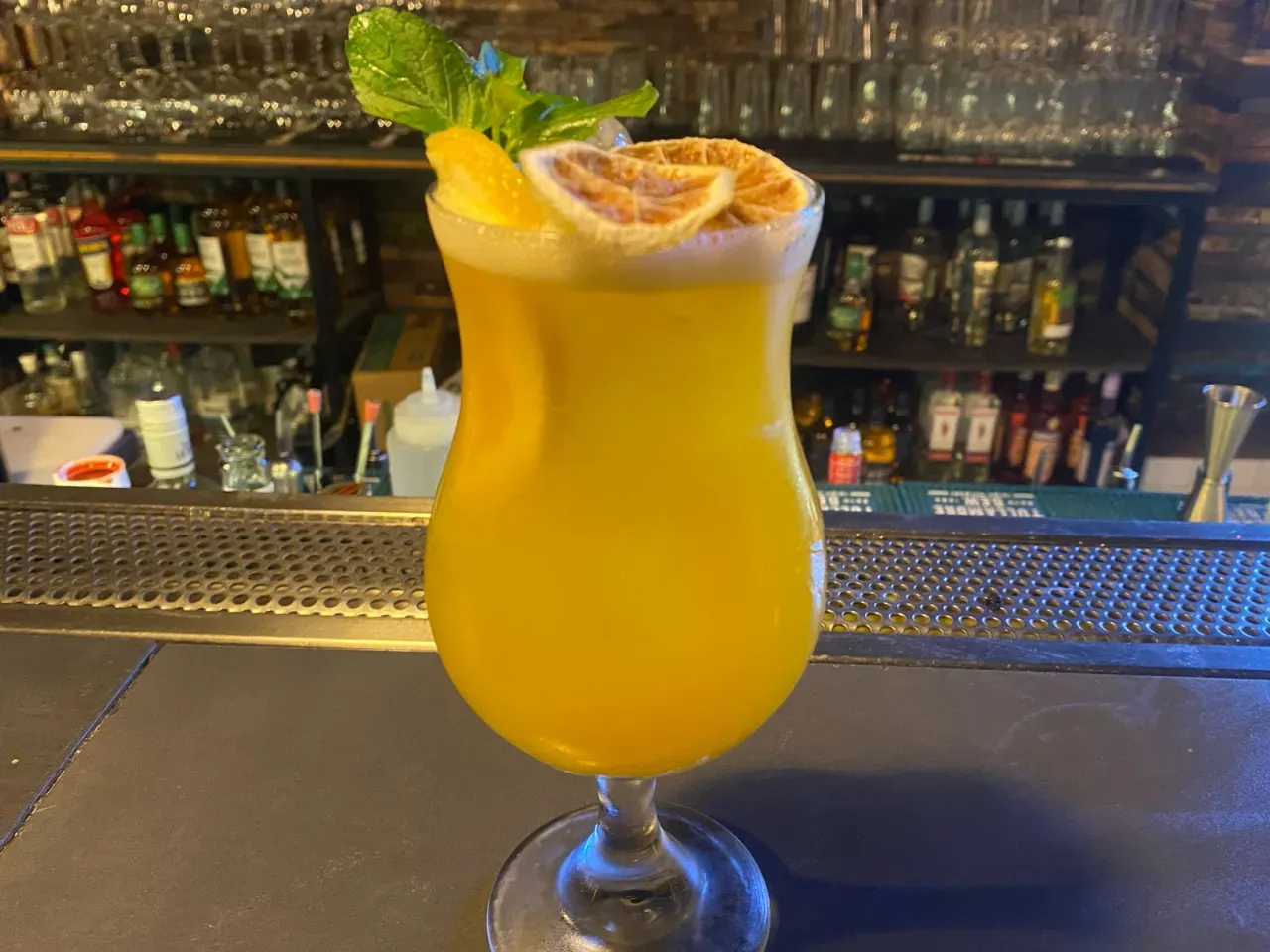 Vodka 14 Inkas, mango-maracuyá, tintura de huacatay, jugo de naranja y jarabe de goma
