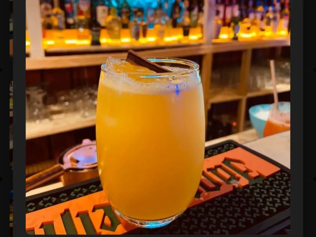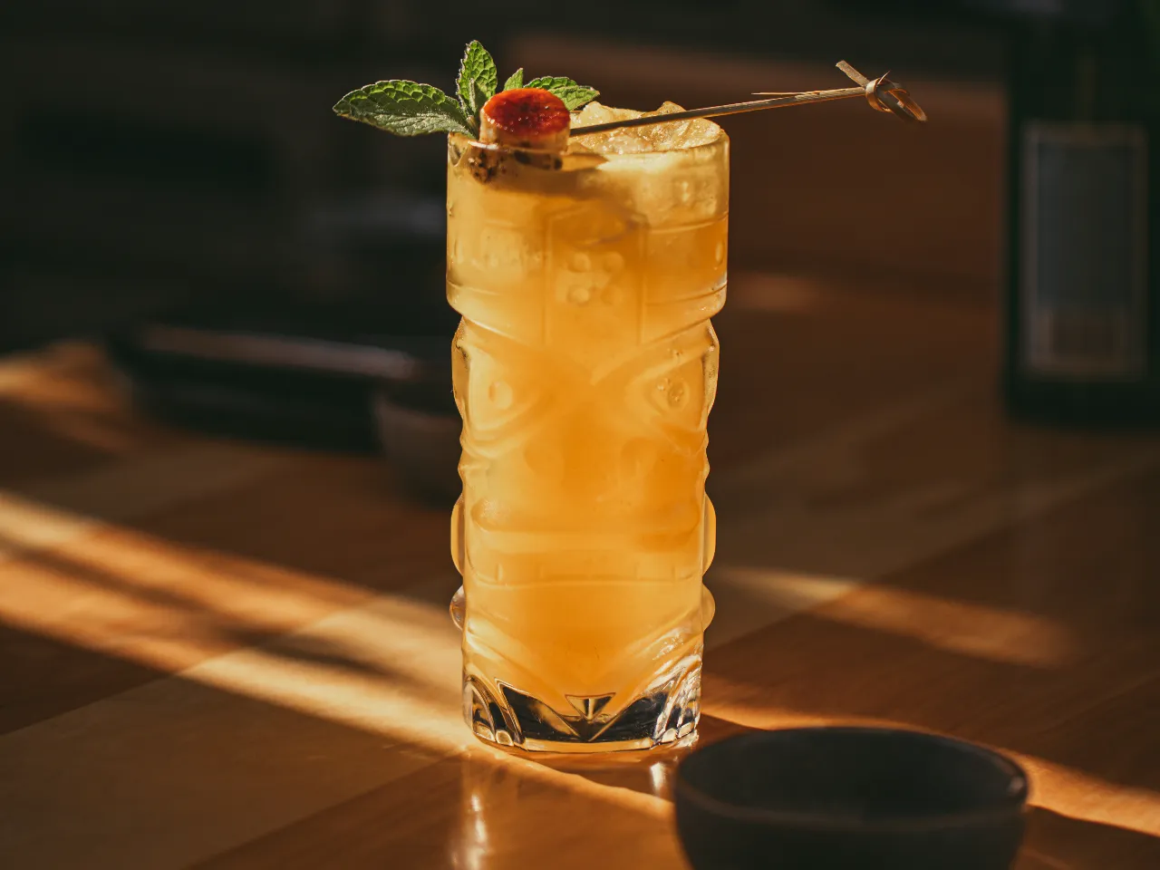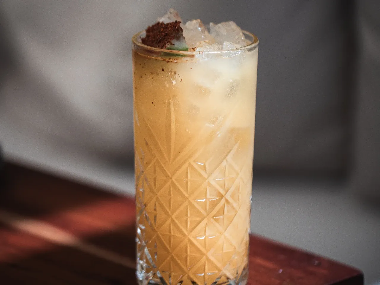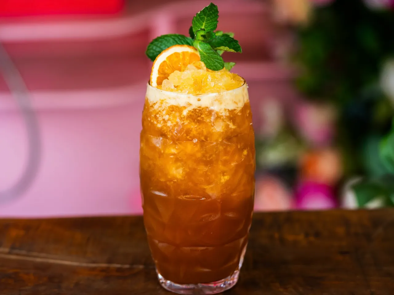Coctel enfocado en la coctelería tiki a base de pisco, ron, miel de papaya, kuyper de mango, zumo de naranja, zumo de limon.