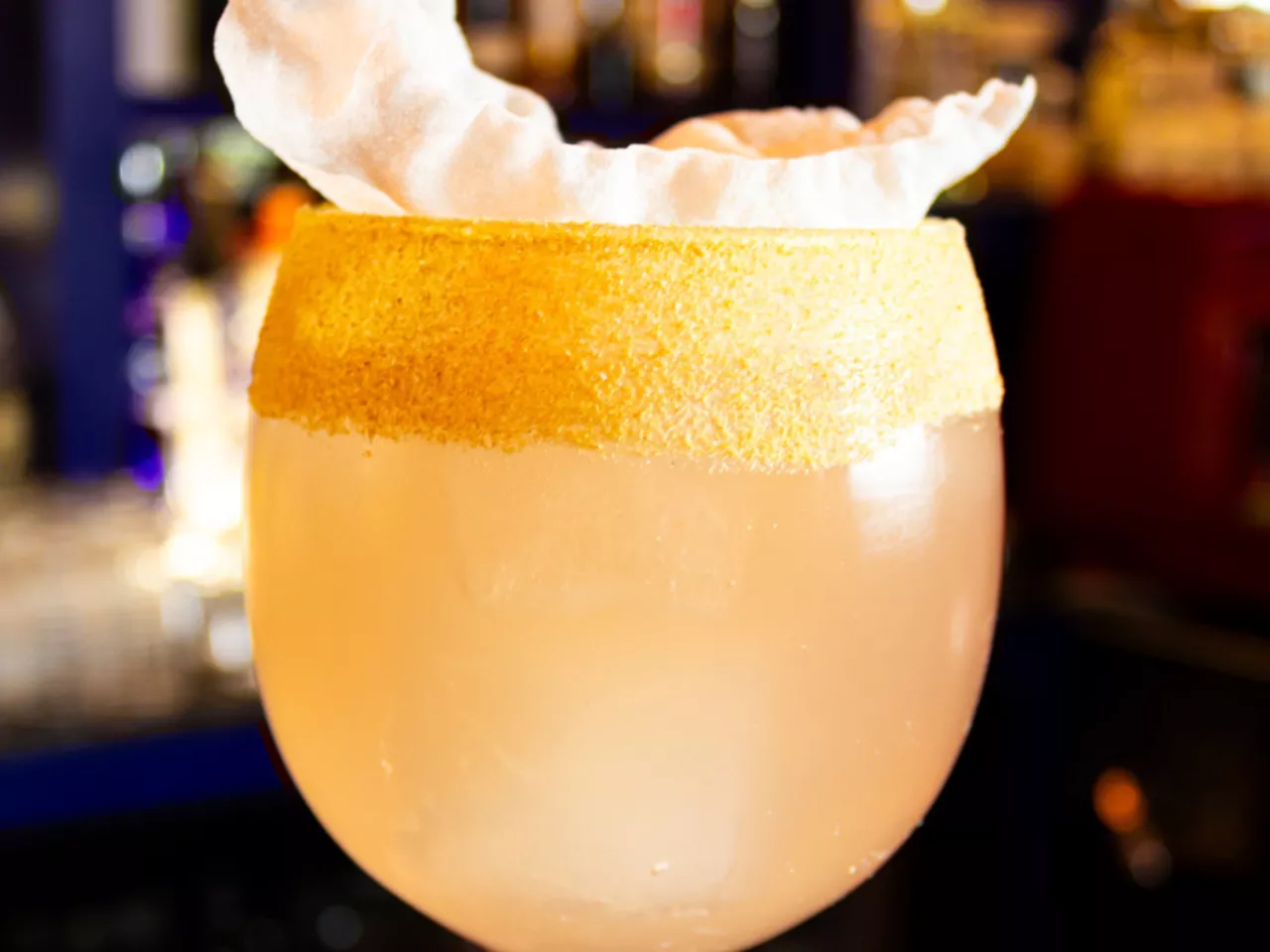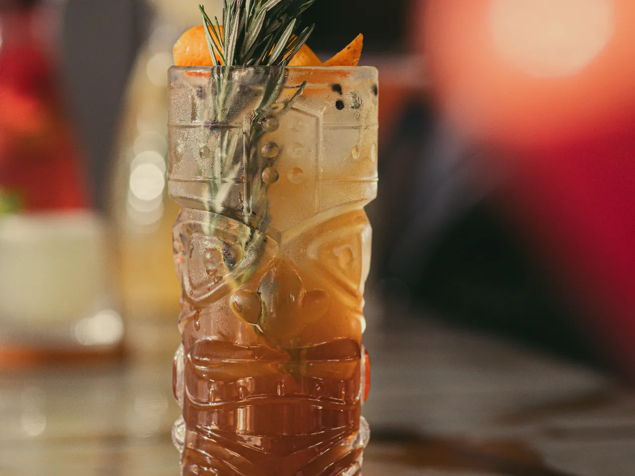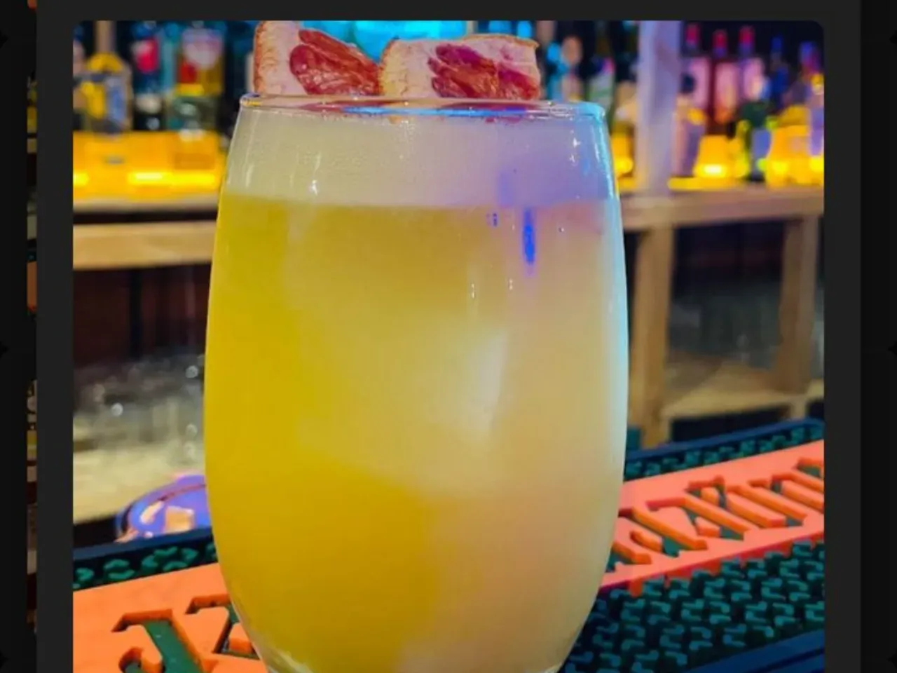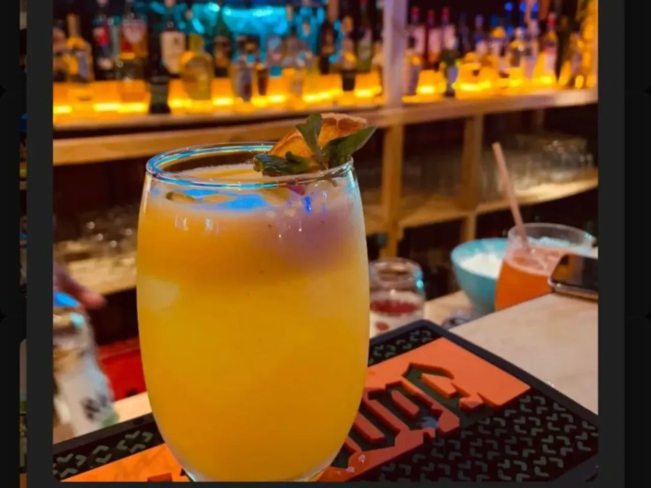 Coctel enfocado en la coctelería tiki a base de pisco, ron, miel de papaya, kuyper de mango, zumo de naranja, zumo de limon.