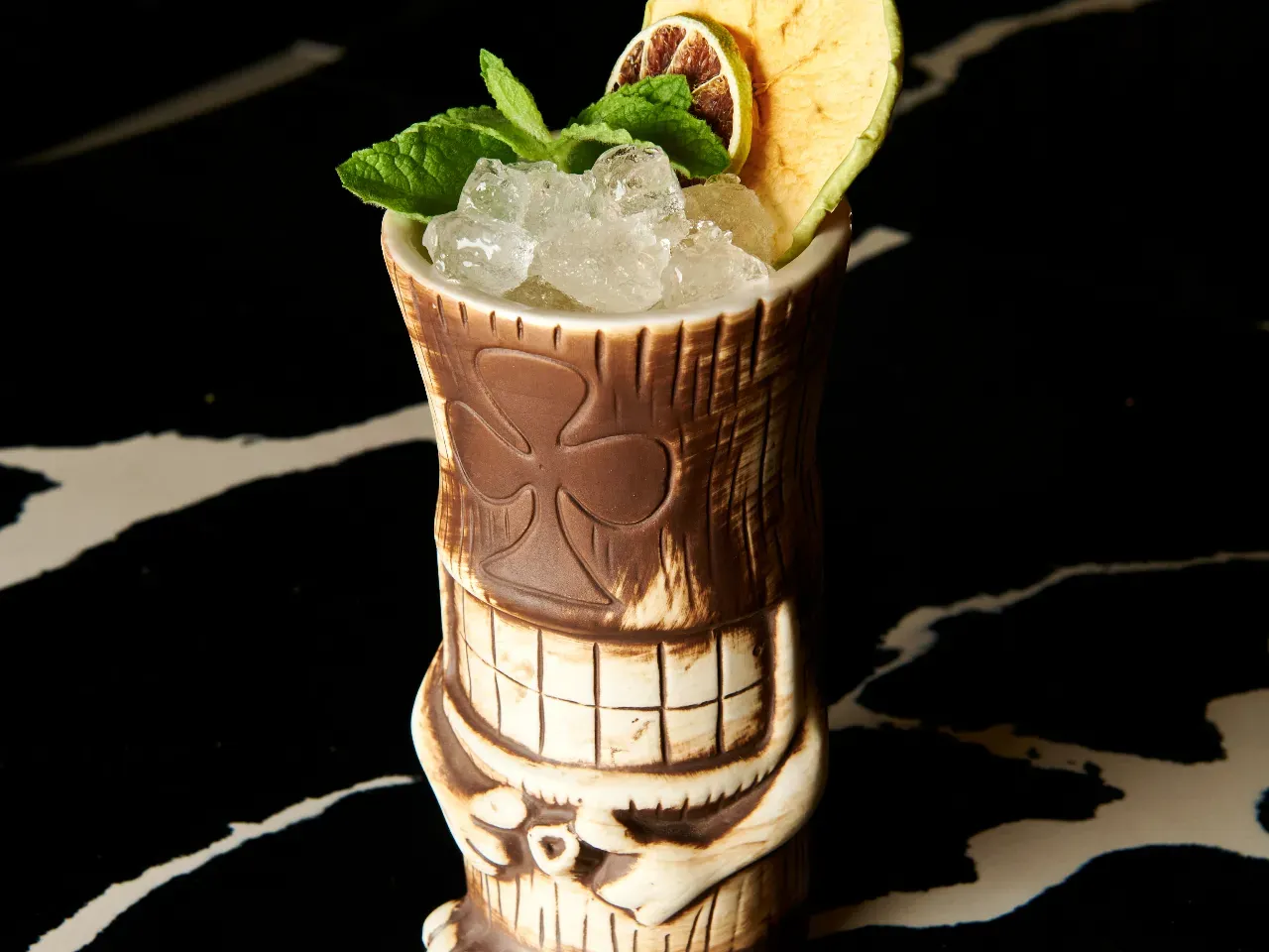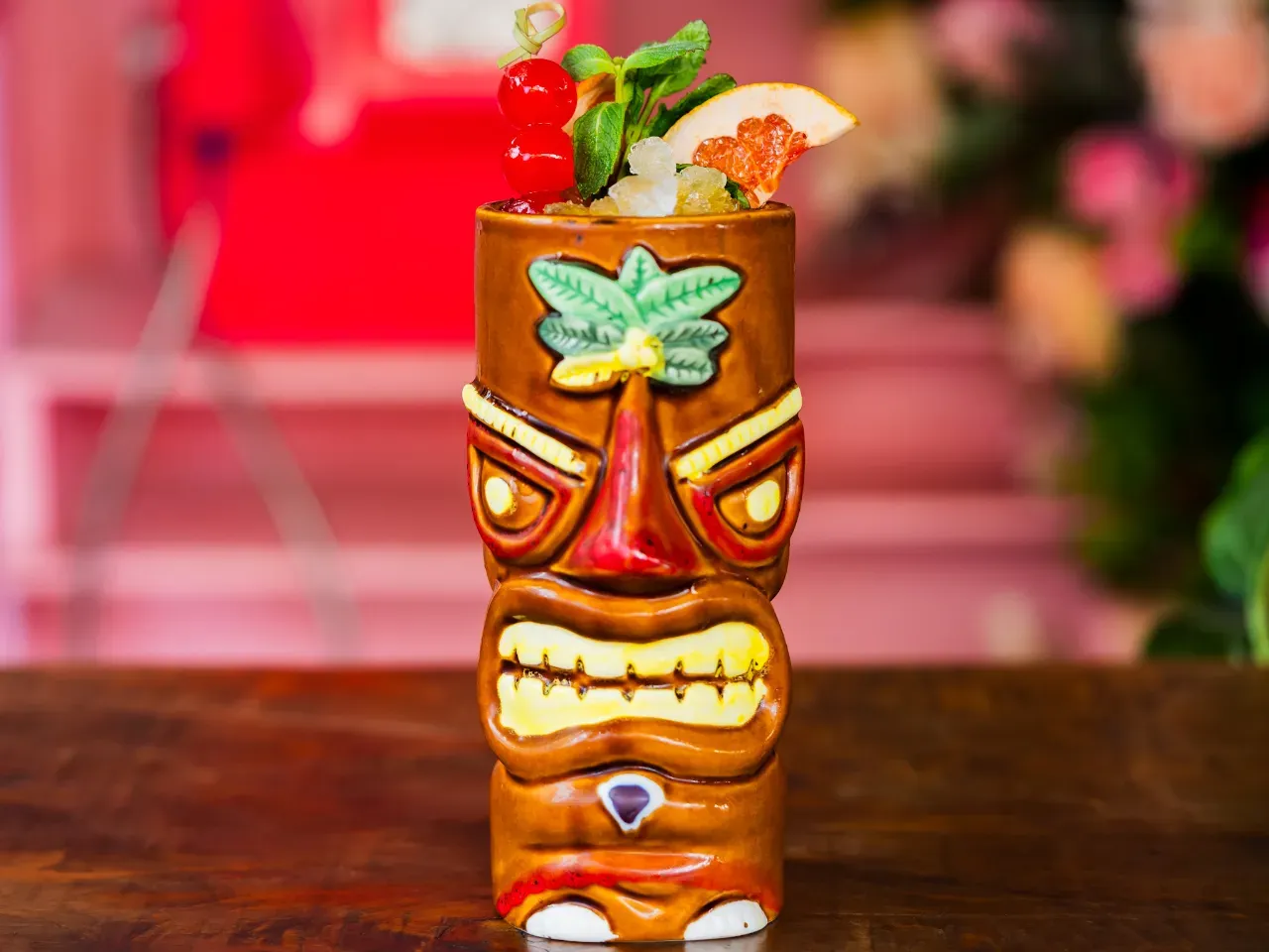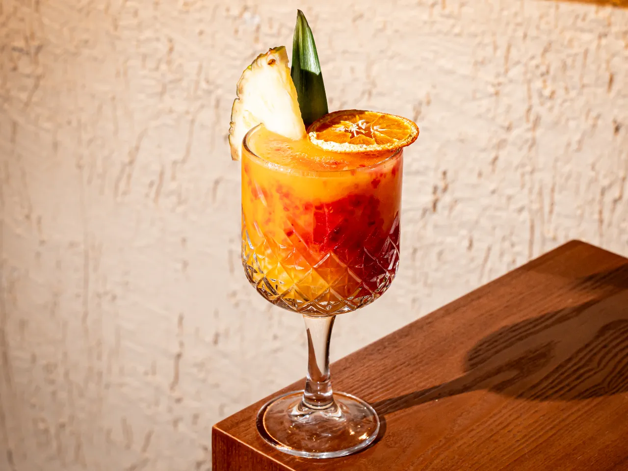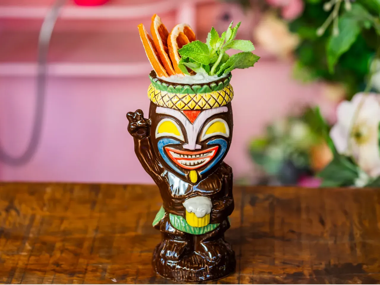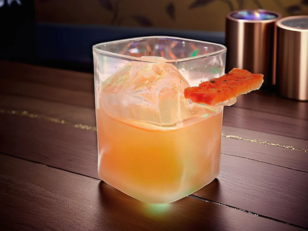 Coctel enfocado en la coctelería tiki a base de pisco, ron, miel de papaya, kuyper de mango, zumo de naranja, zumo de limon.