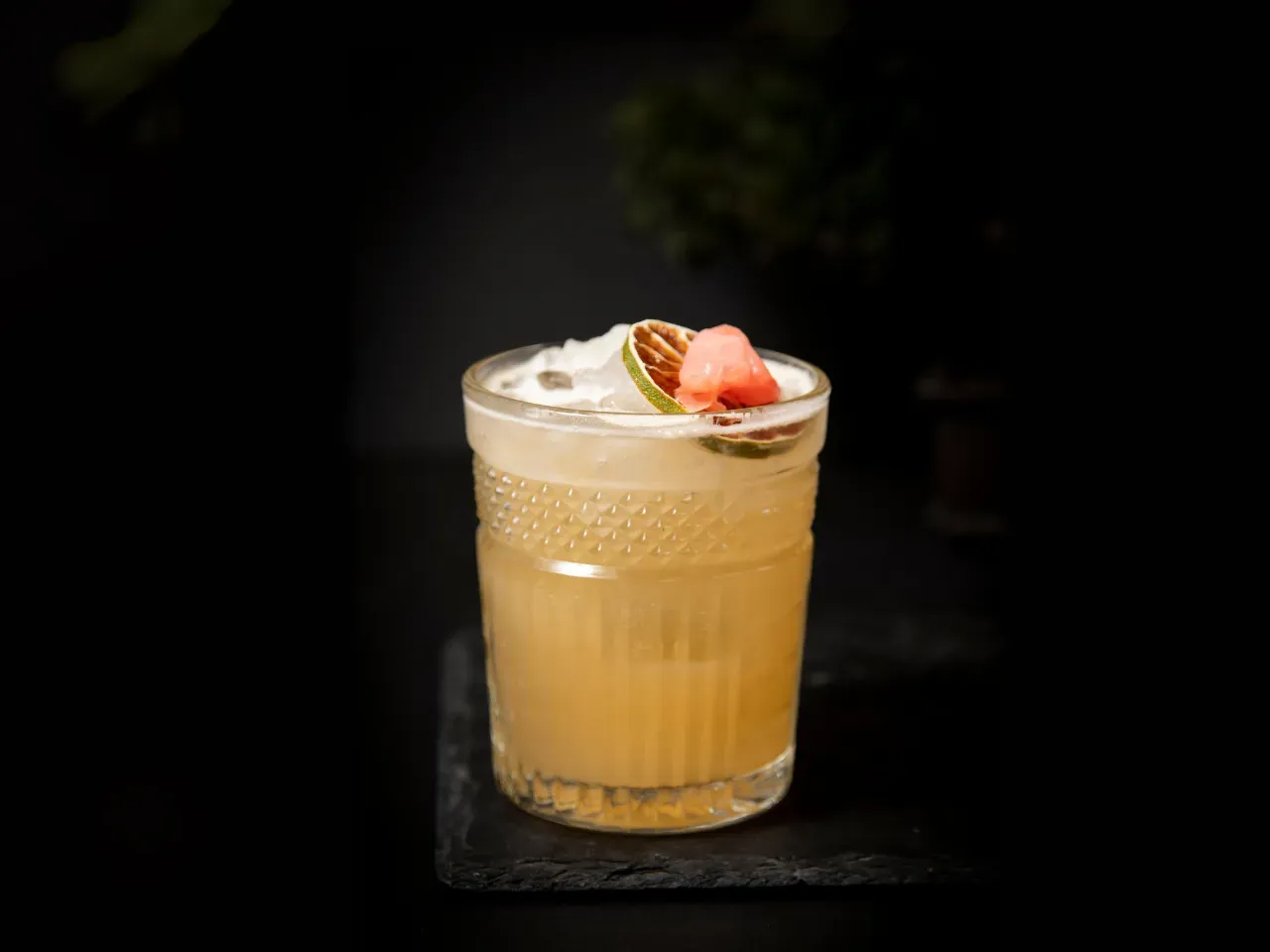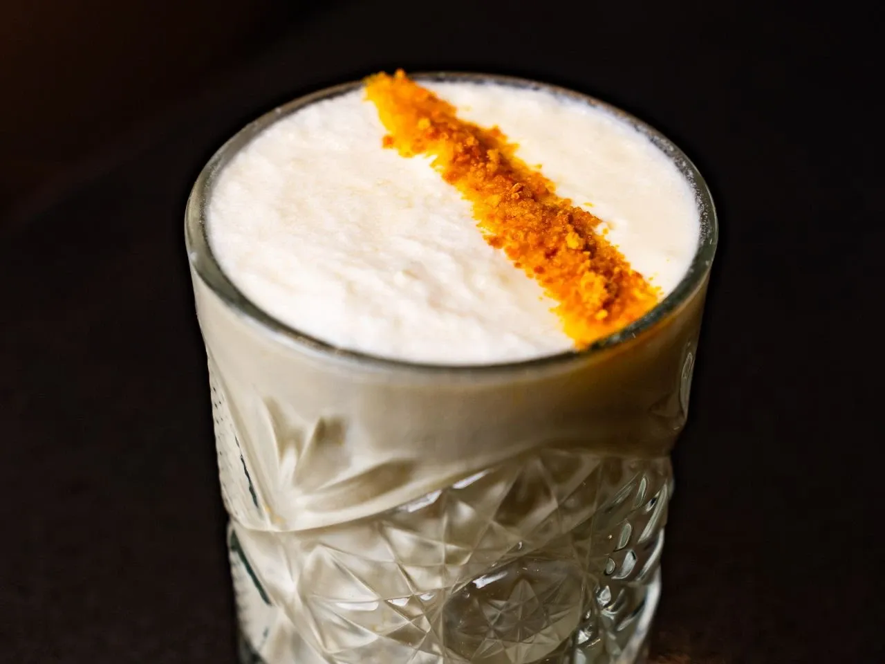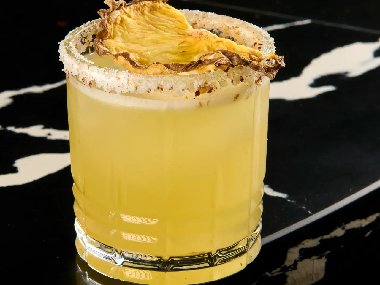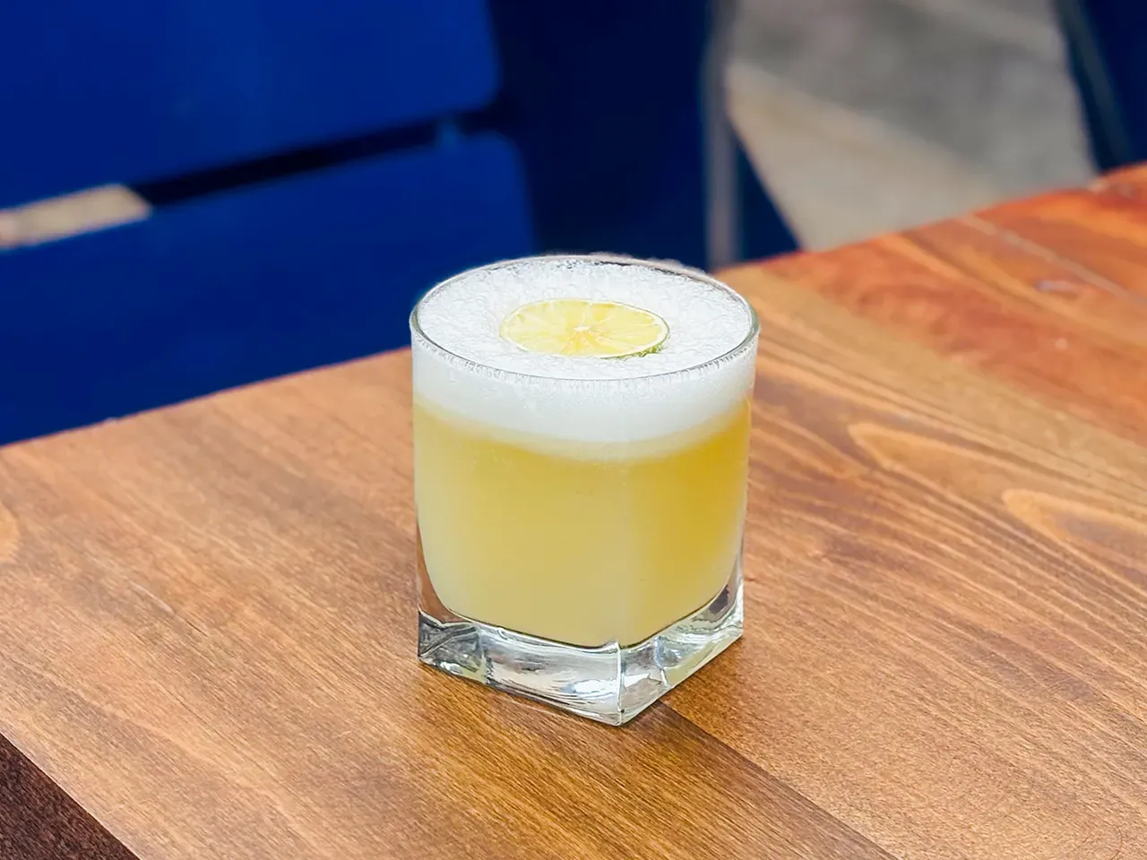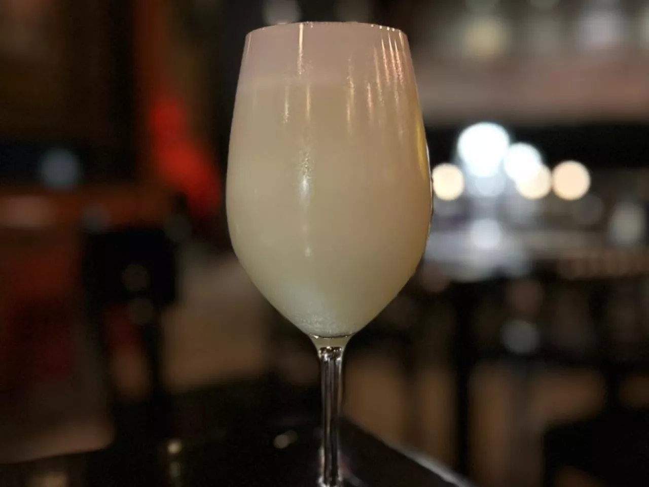 Pisco blanco con una maceración en piña fresca durante 10 días, hecho sour.