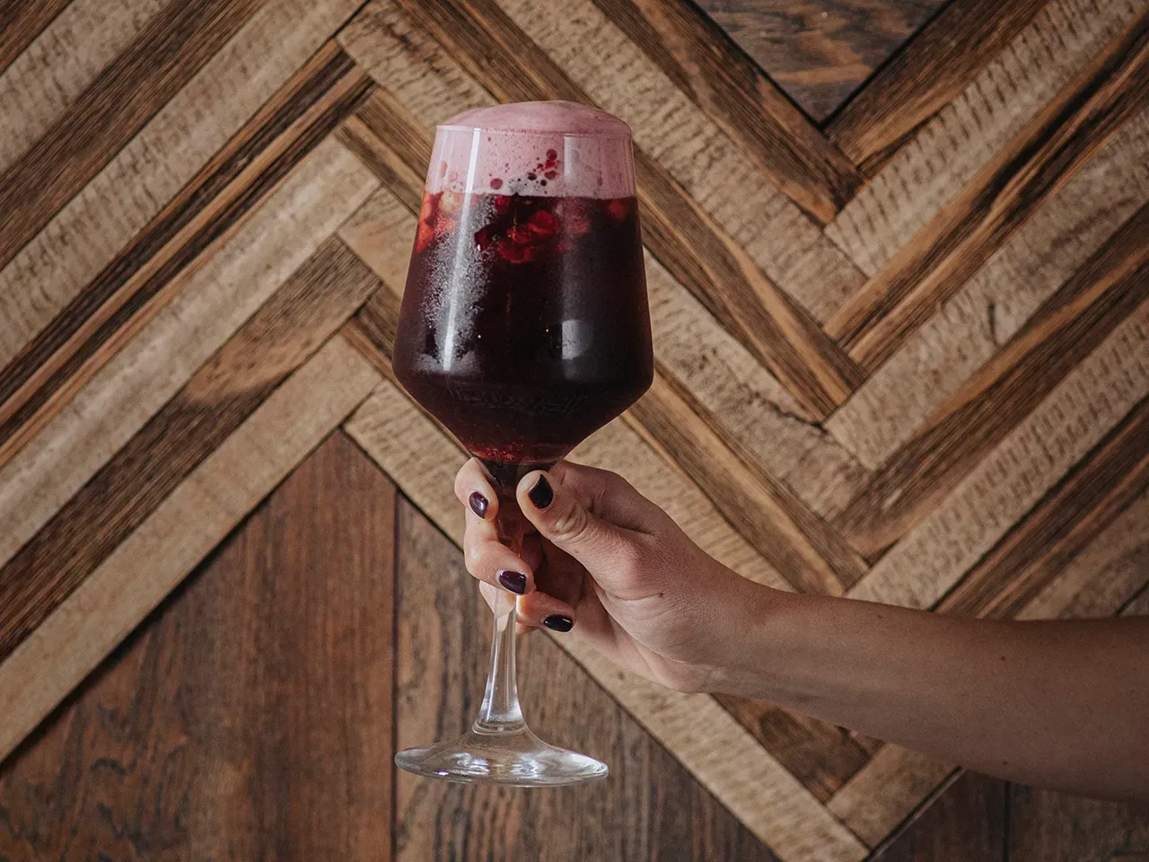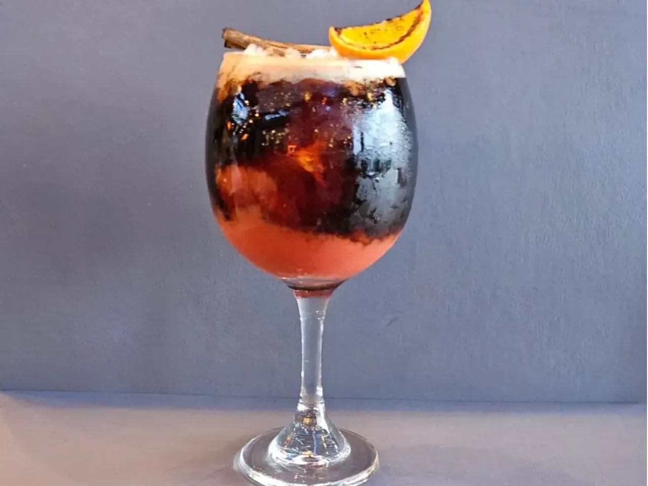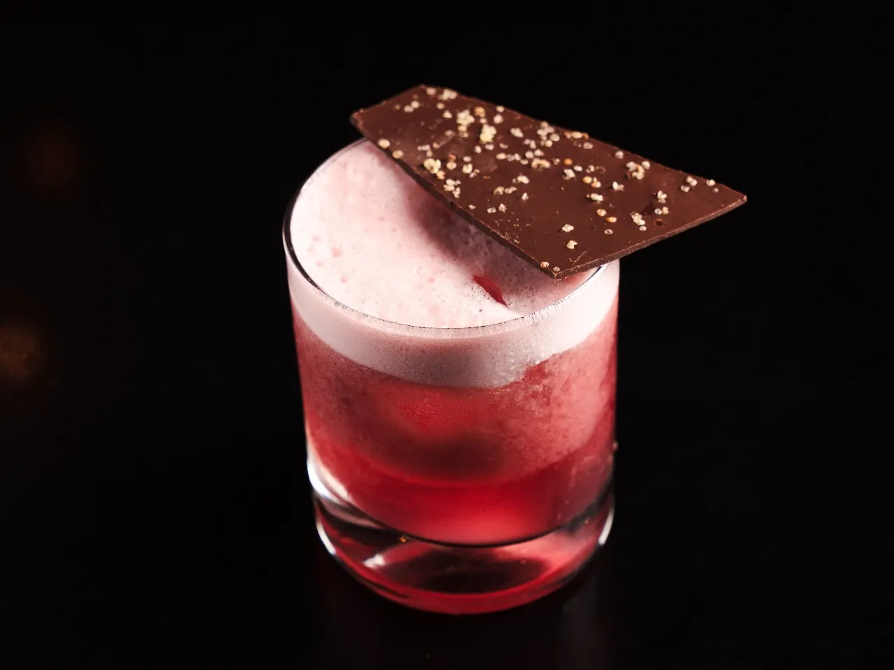 A base de vino Cabernet Sauvignon, syrup de chocolate casero, Chambord, syrup de syrah, jugo de limón, jugo de naranja y Cognac