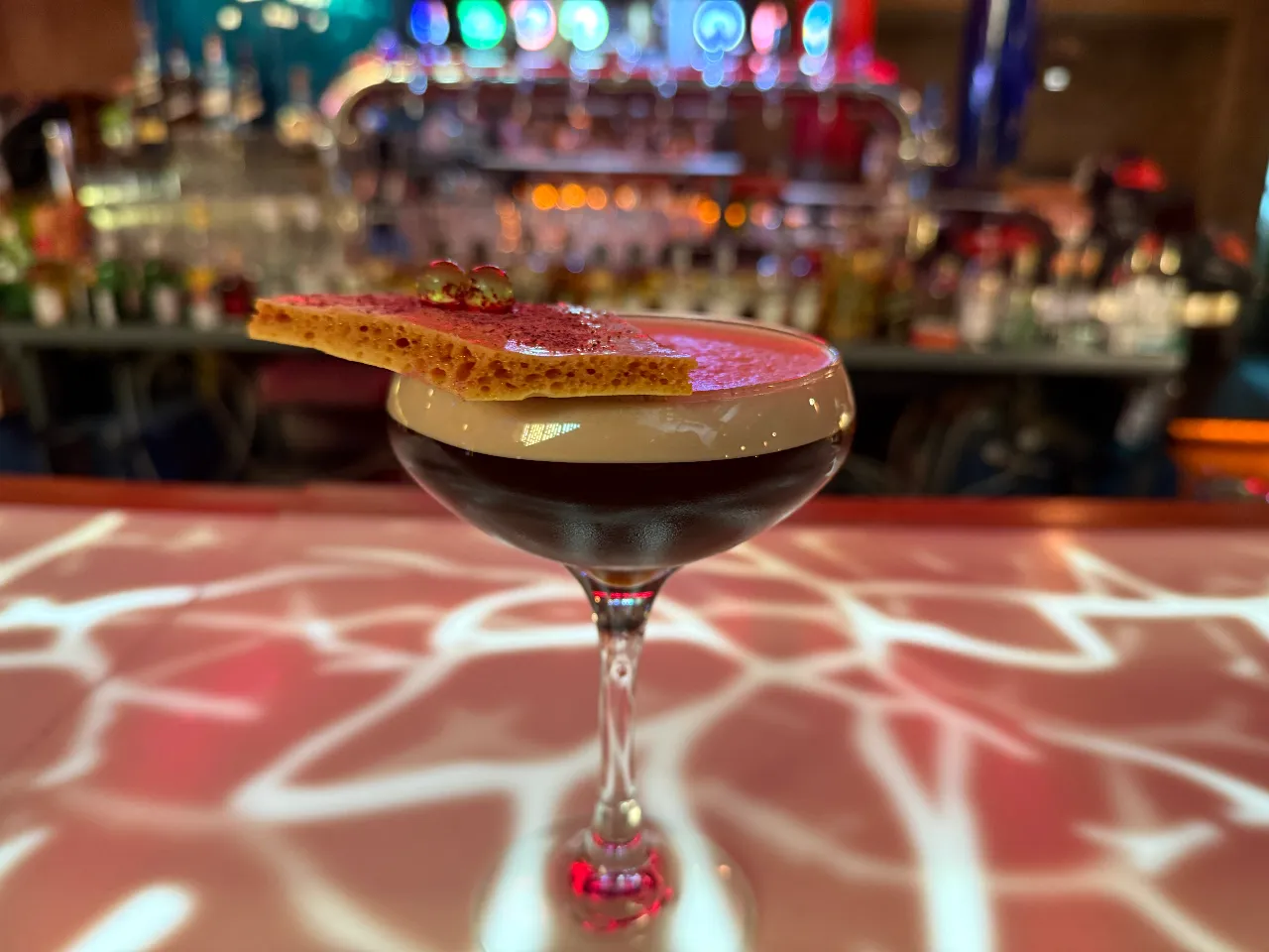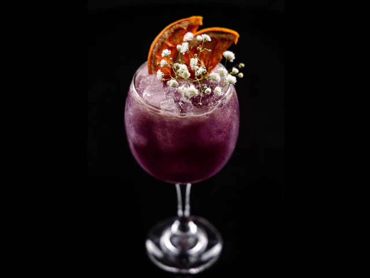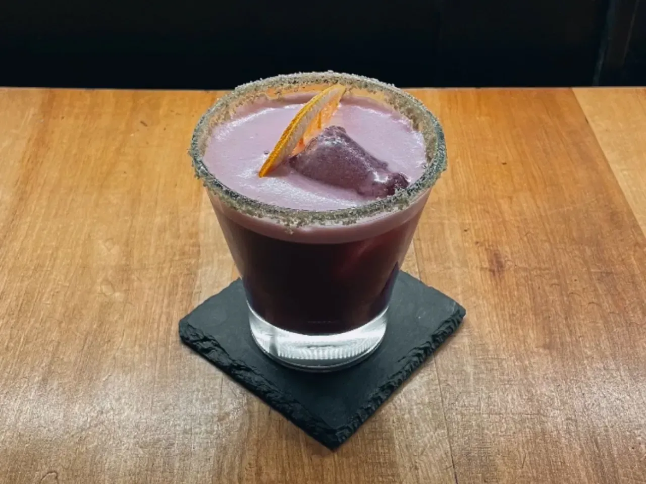 A base de vino Cabernet Sauvignon, syrup de chocolate casero, Chambord, syrup de syrah, jugo de limón, jugo de naranja y Cognac