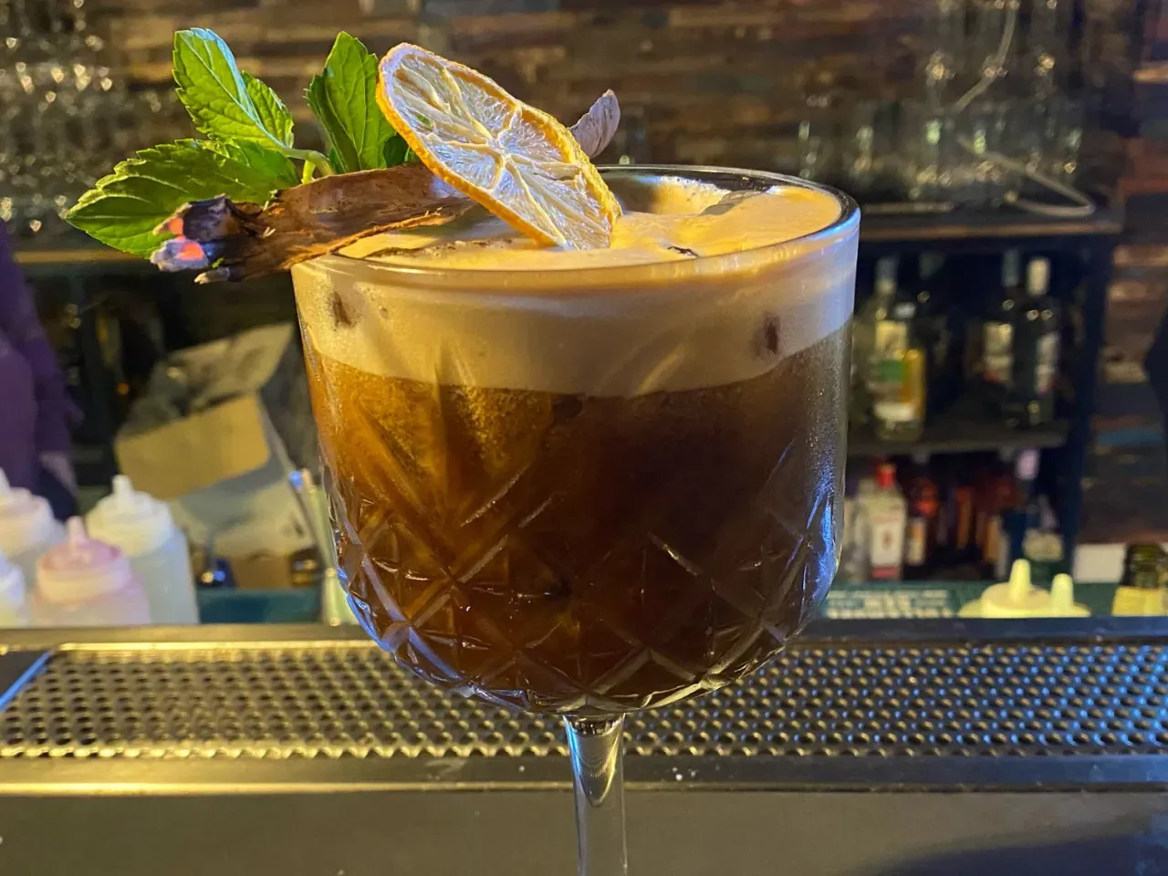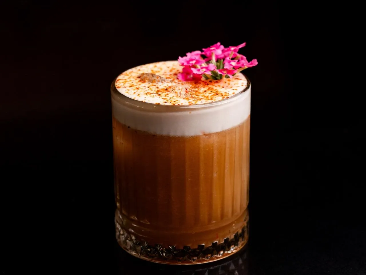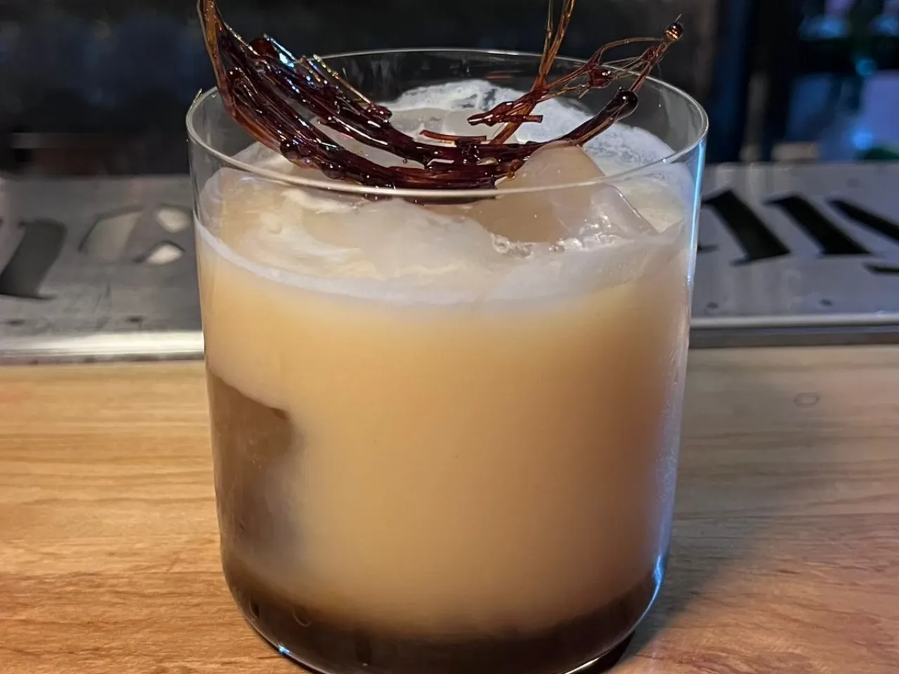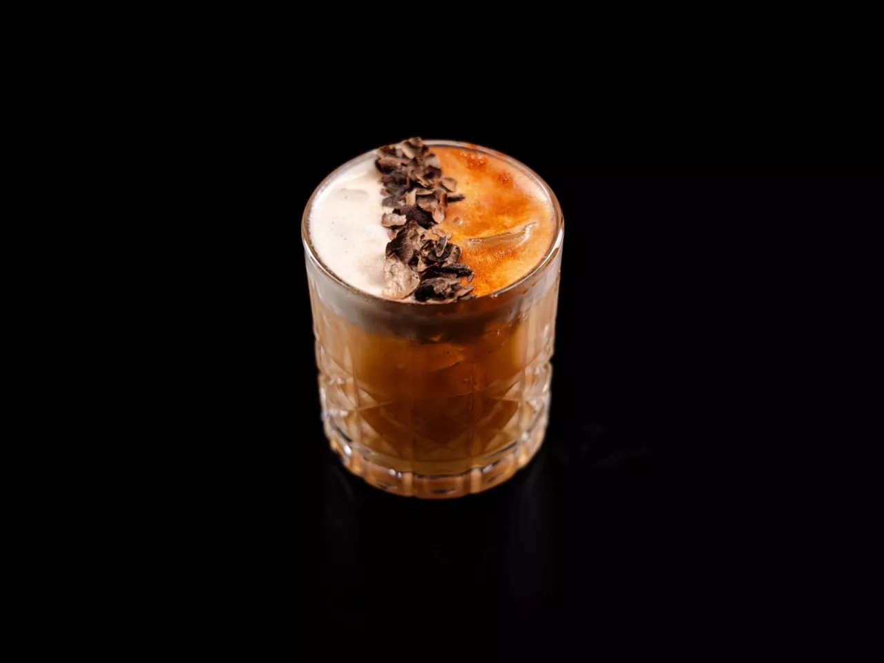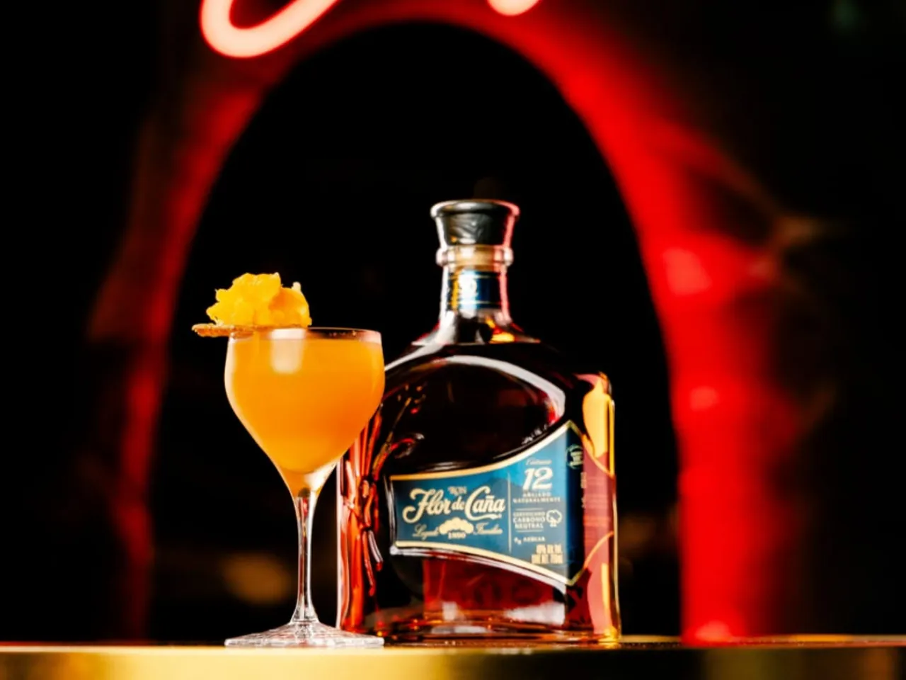 A base de Flor de caña 12 años, Licor artesanal de café, cordial de naranja, solución salina.