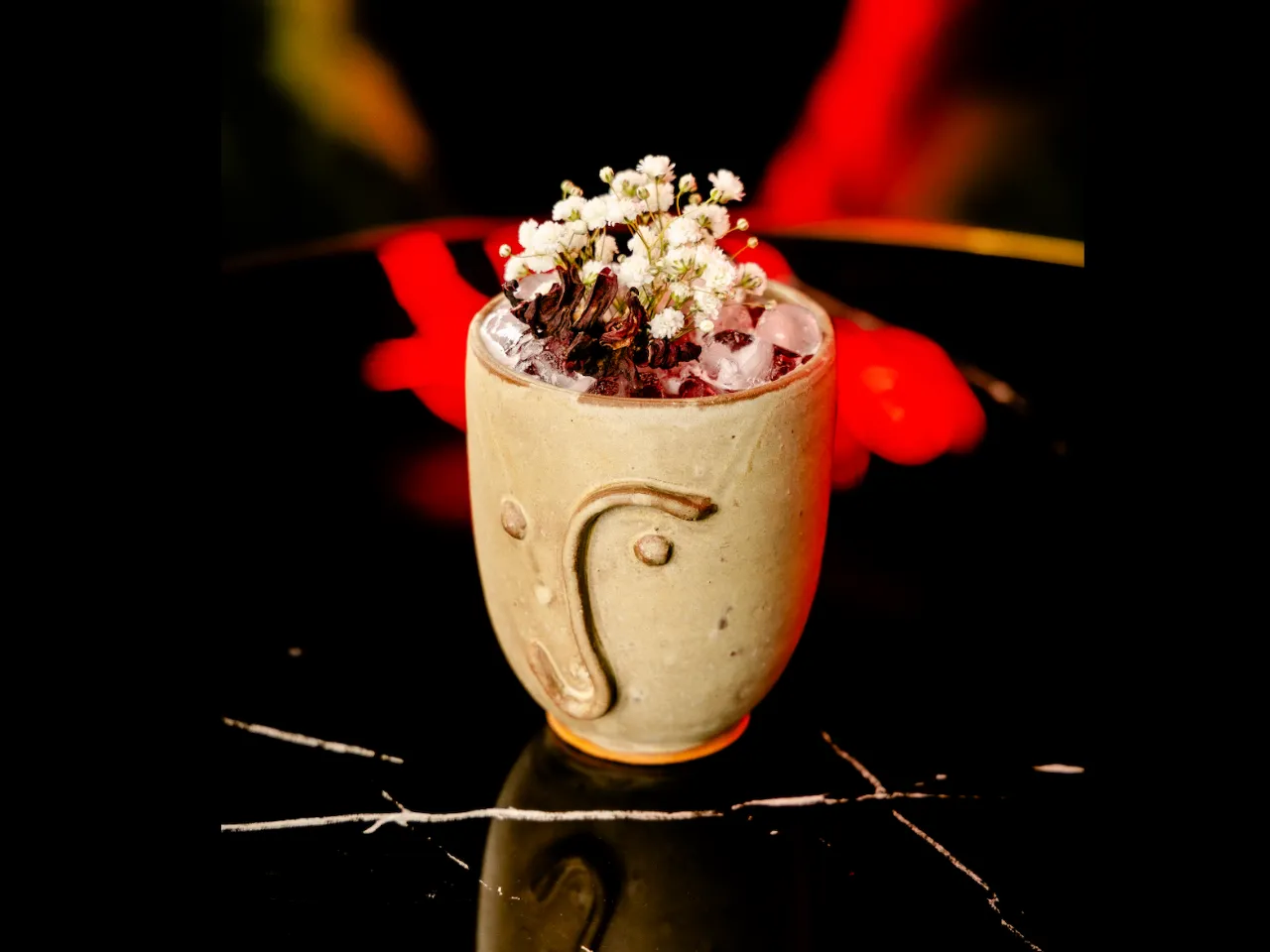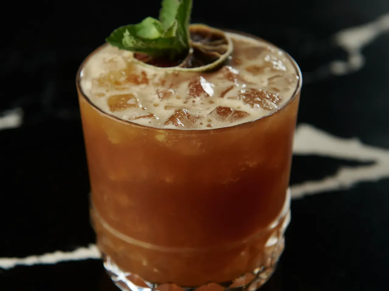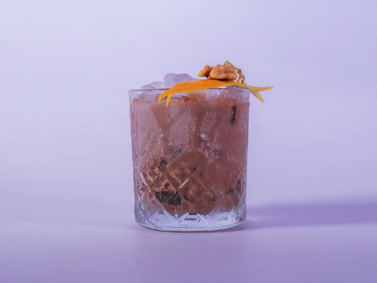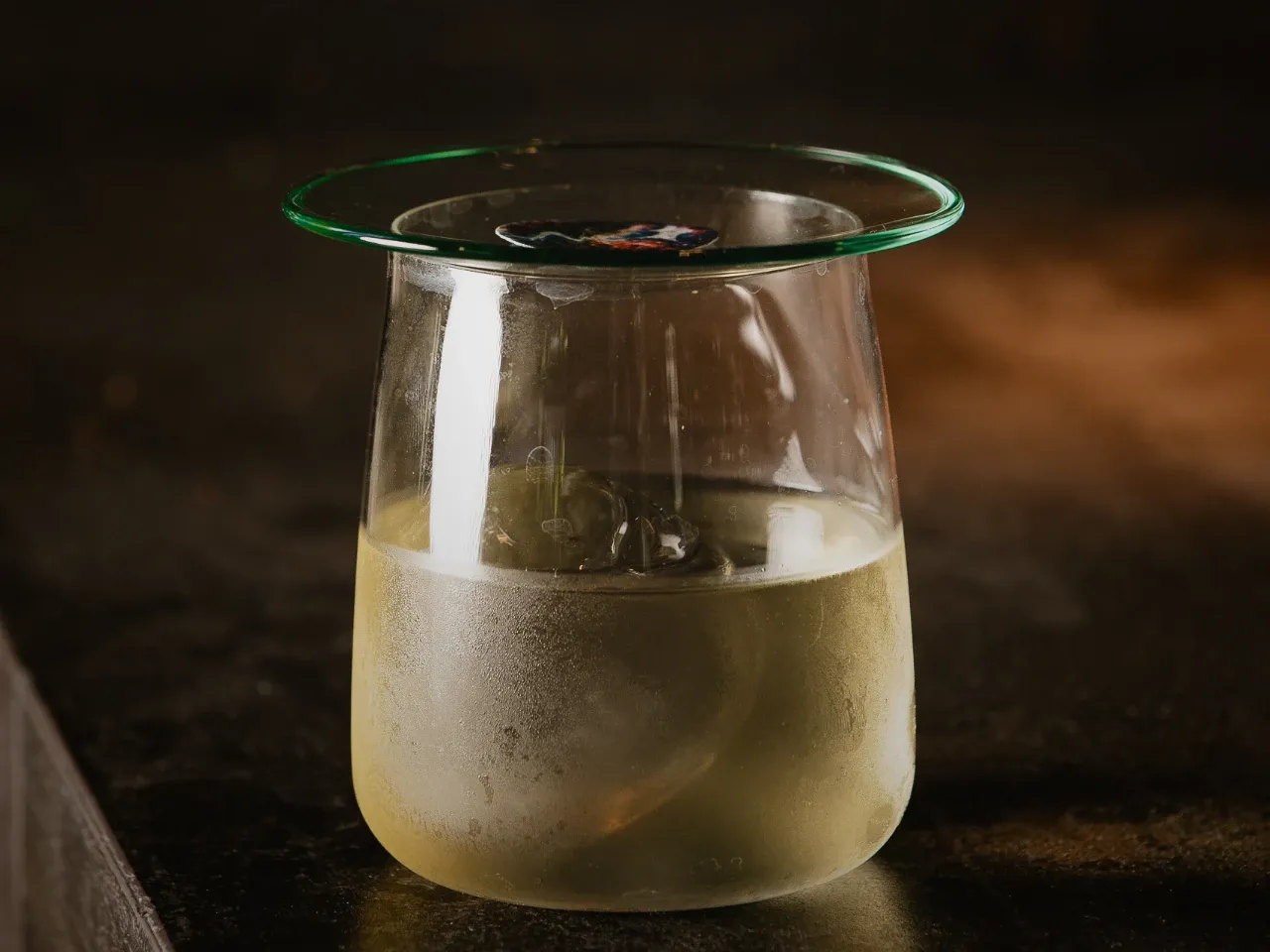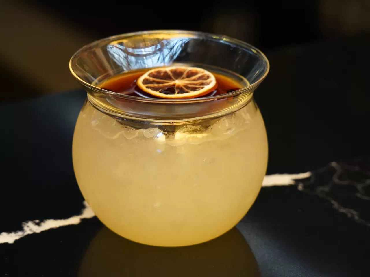 A base de Flor de caña 12 años, Licor artesanal de café, cordial de naranja, solución salina.