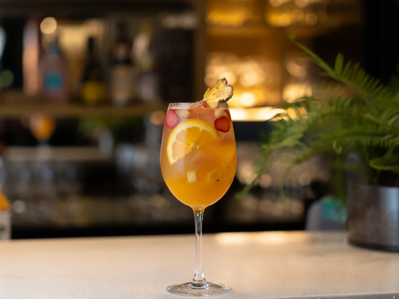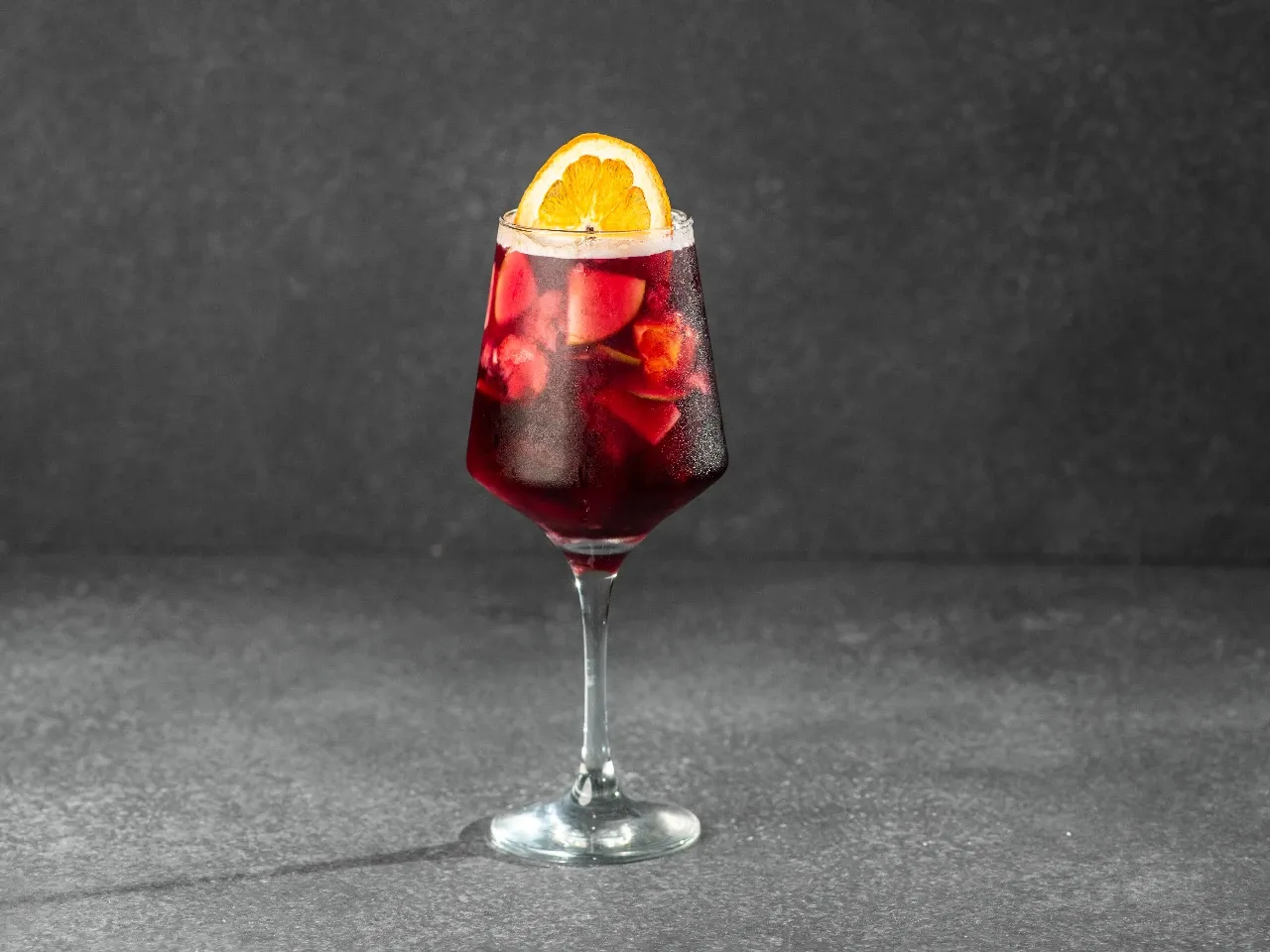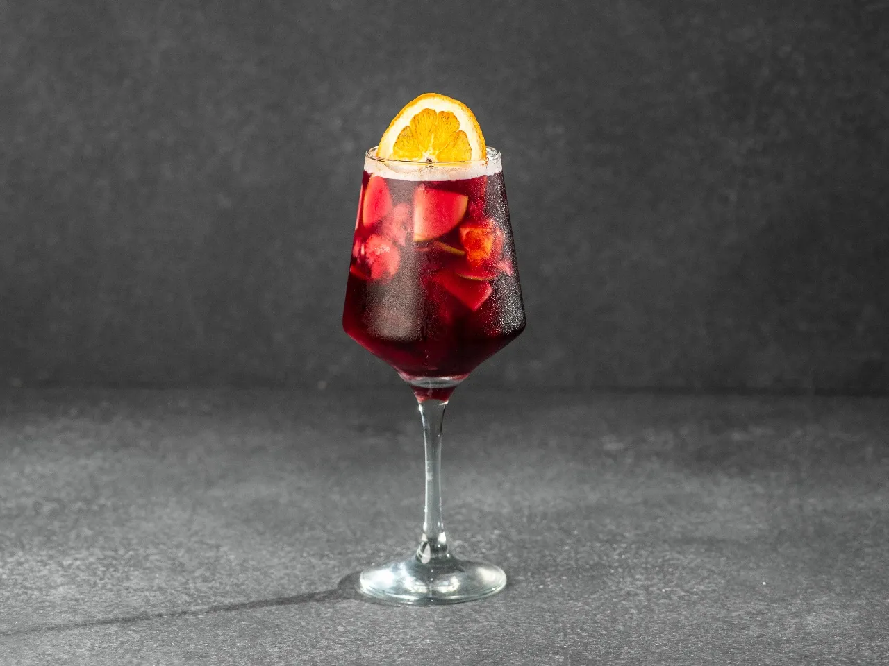 Manzana roja, limón amarillo y naranja macerado en Carménère, jugo de naranja, pisco y un top de tónica Thomas Henry (Dulce y Fresco)