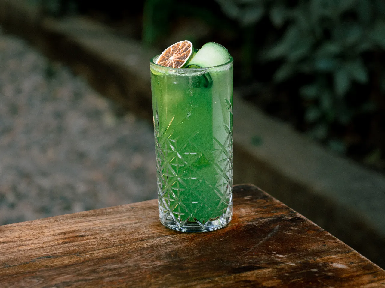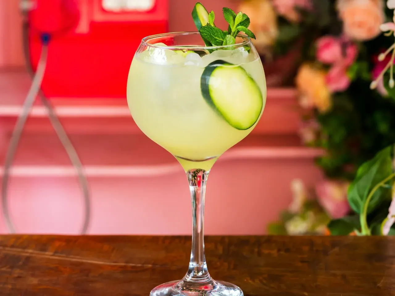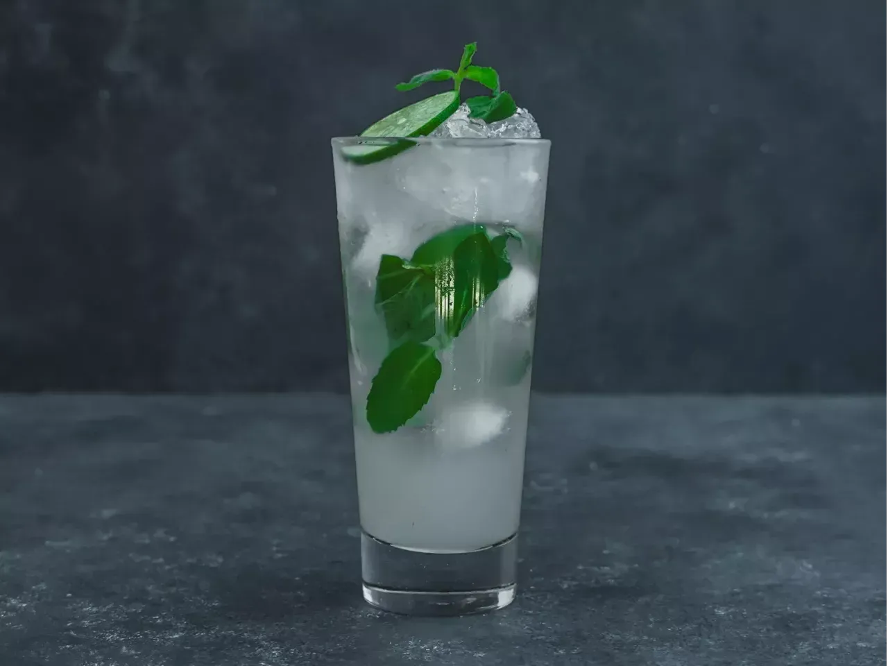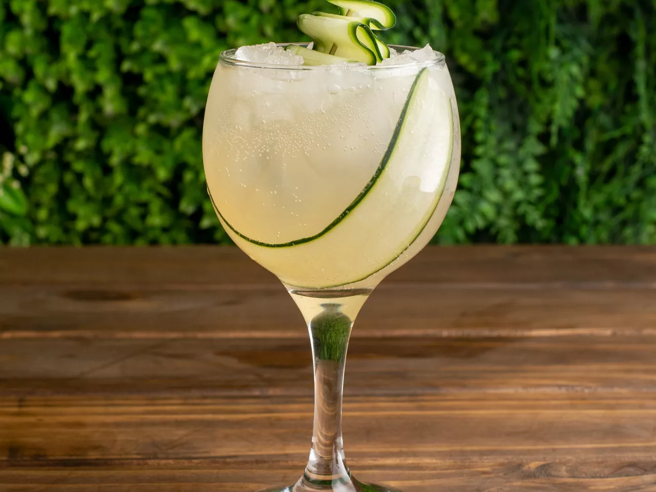 Gin, menta, limón, jengibre, lámina de pepino y soda.