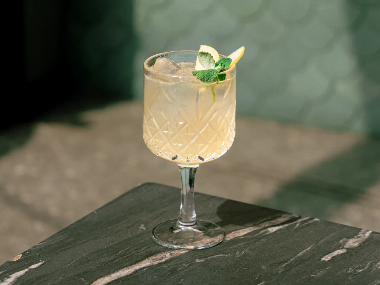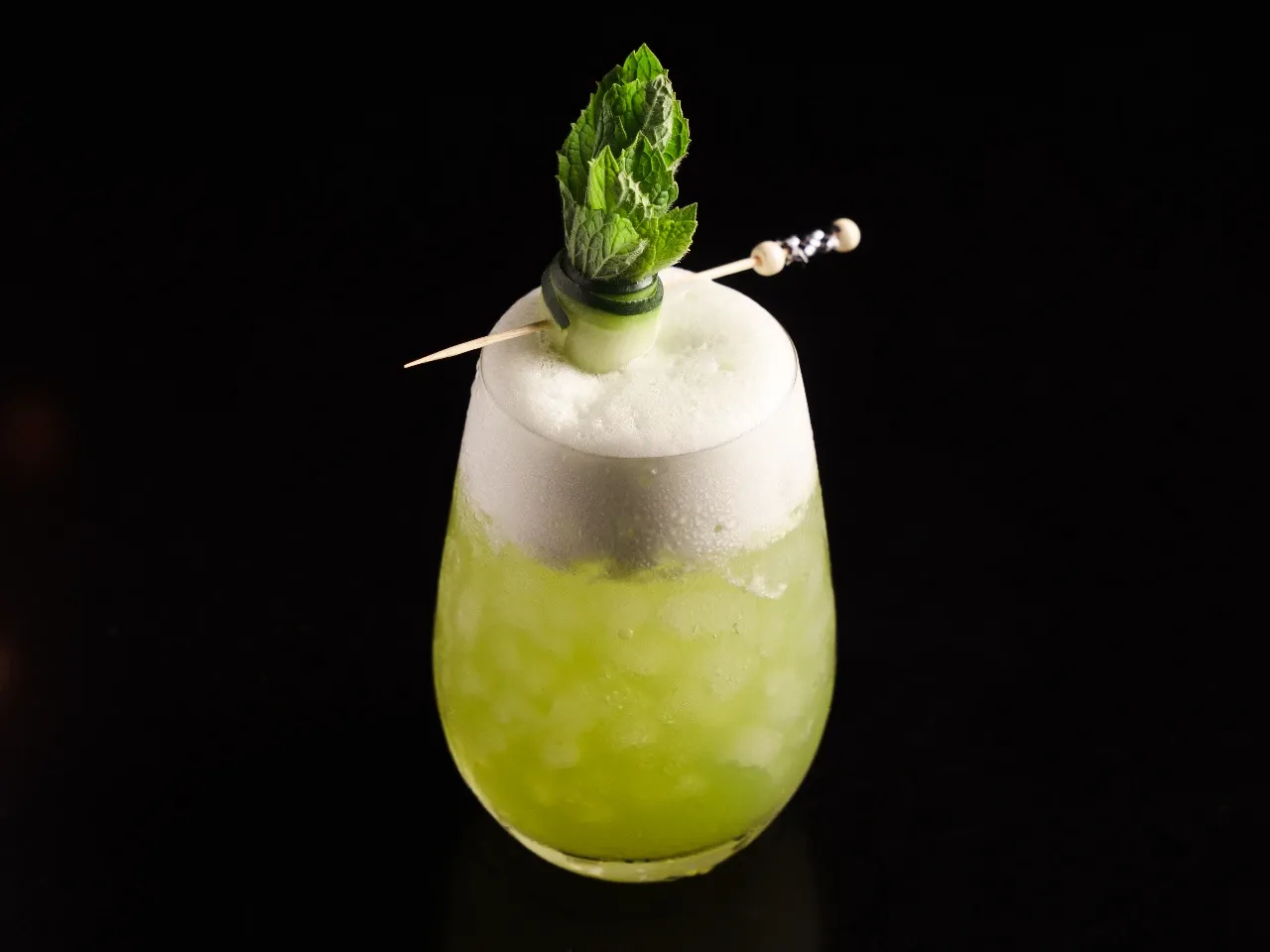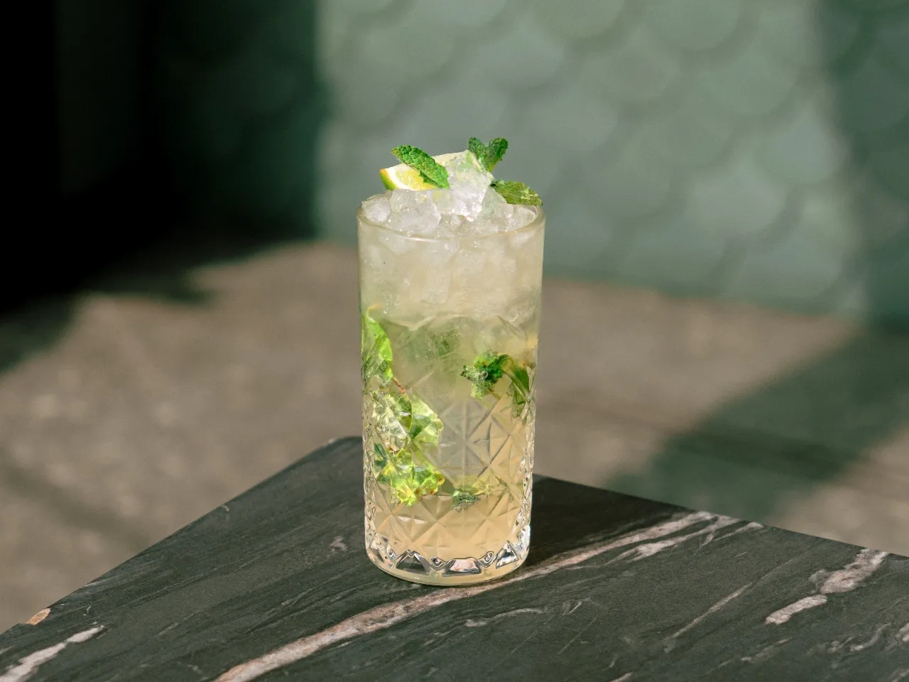 Gin, menta, limón, jengibre, lámina de pepino y soda.