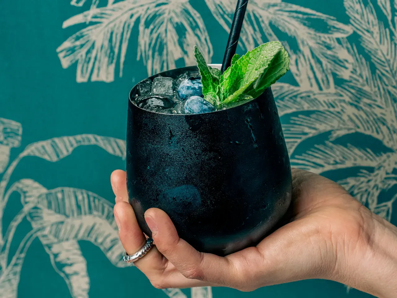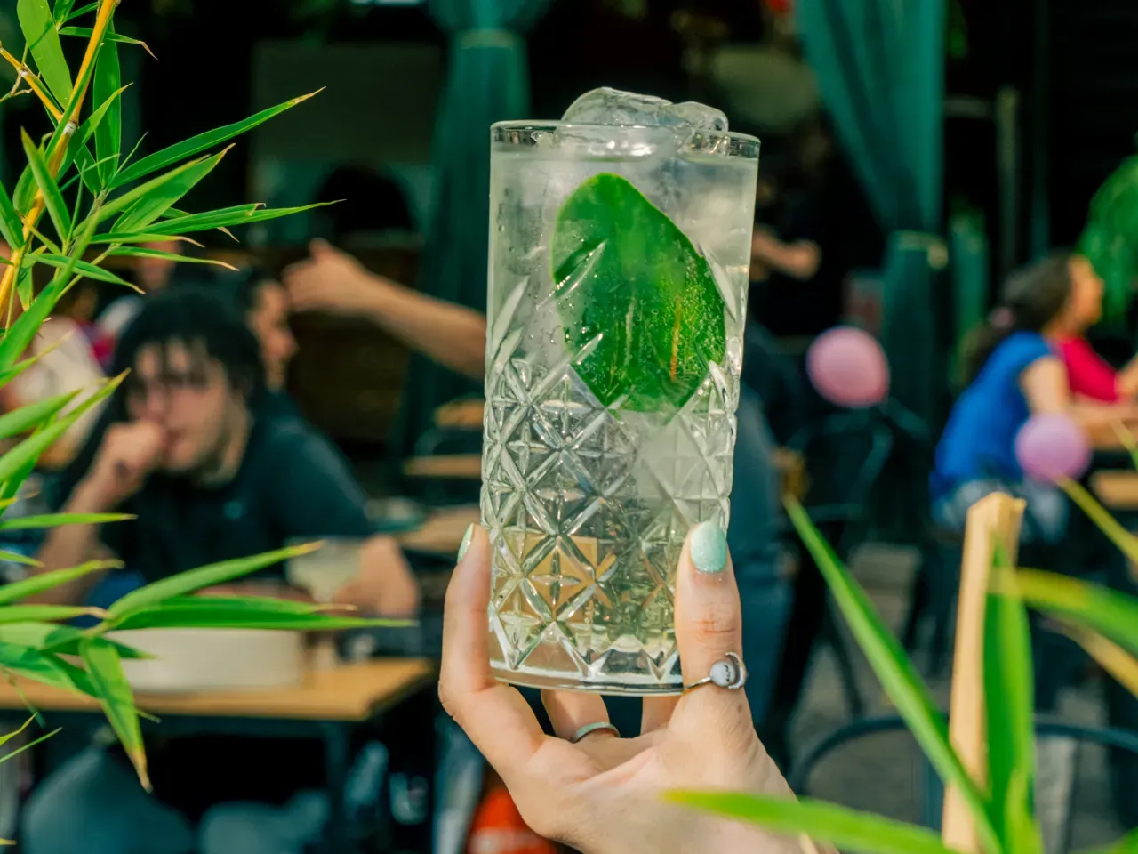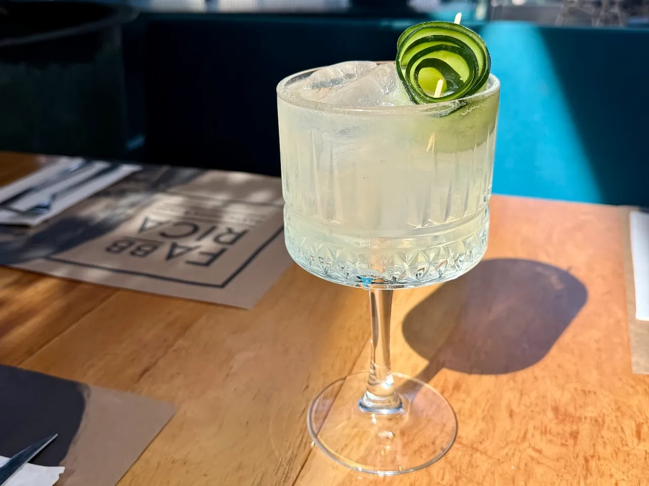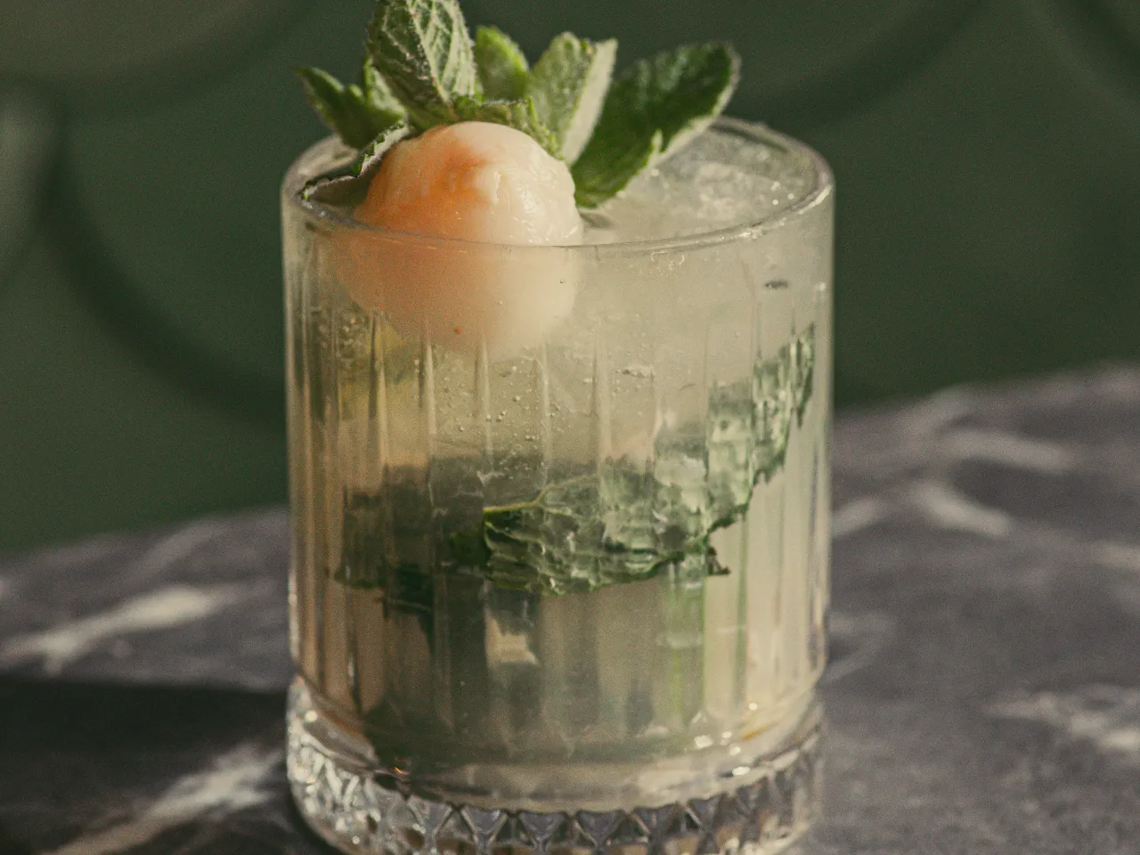 Gin, menta, limón, jengibre, lámina de pepino y soda.
