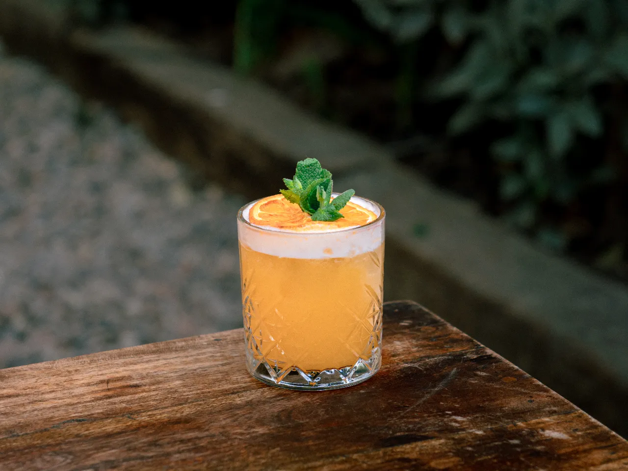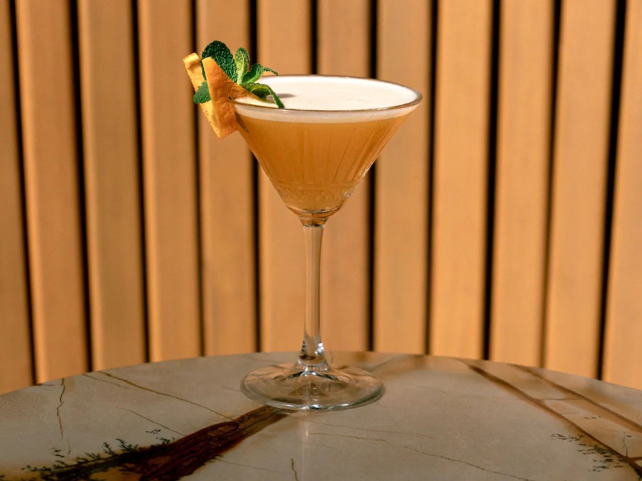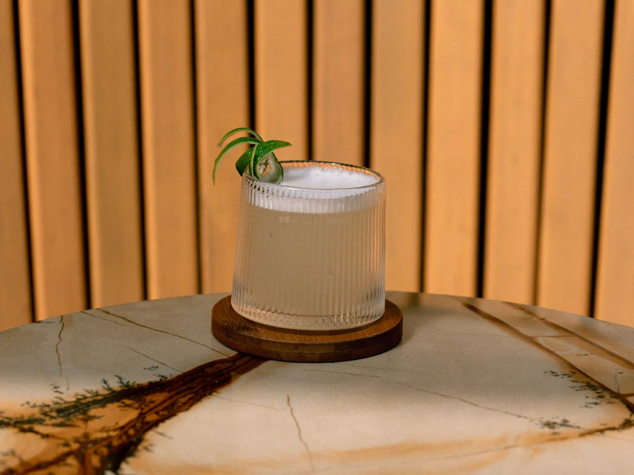 Pisco Cultura Los Andes, óleo de naranja, limón, hielo frappé y albahaca — fresco, cítrico y aromático.