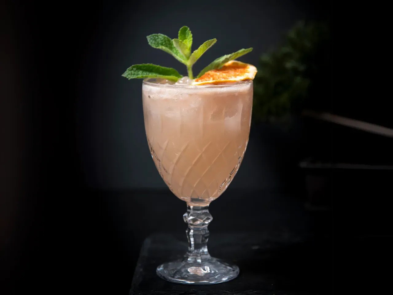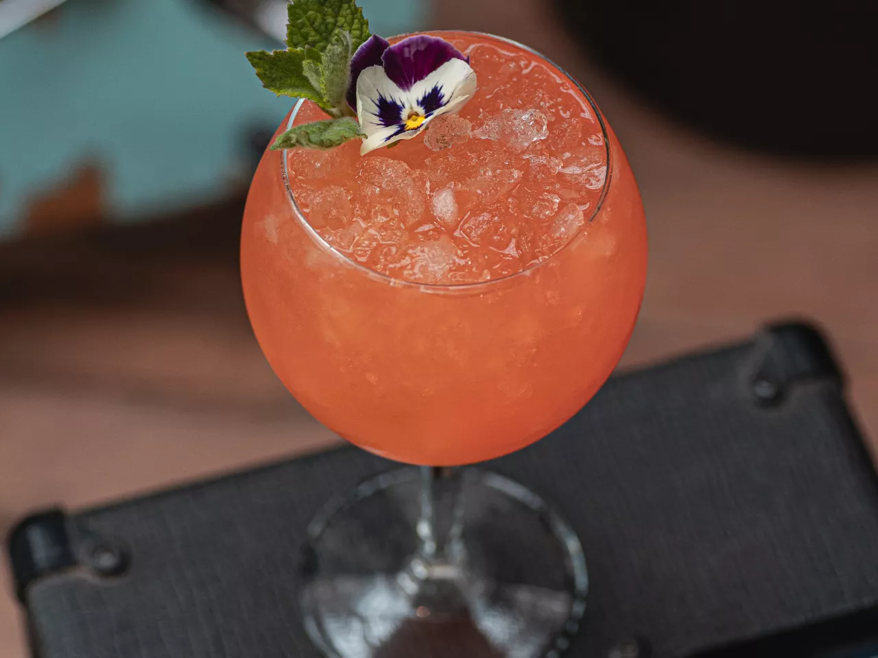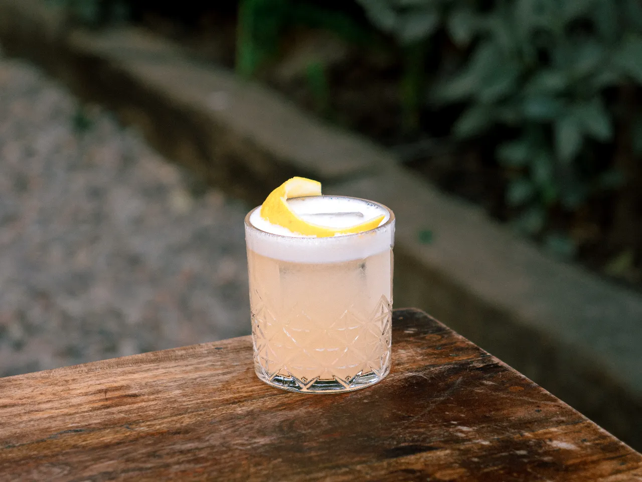 Pisco Cultura Los Andes, óleo de naranja, limón, hielo frappé y albahaca — fresco, cítrico y aromático.