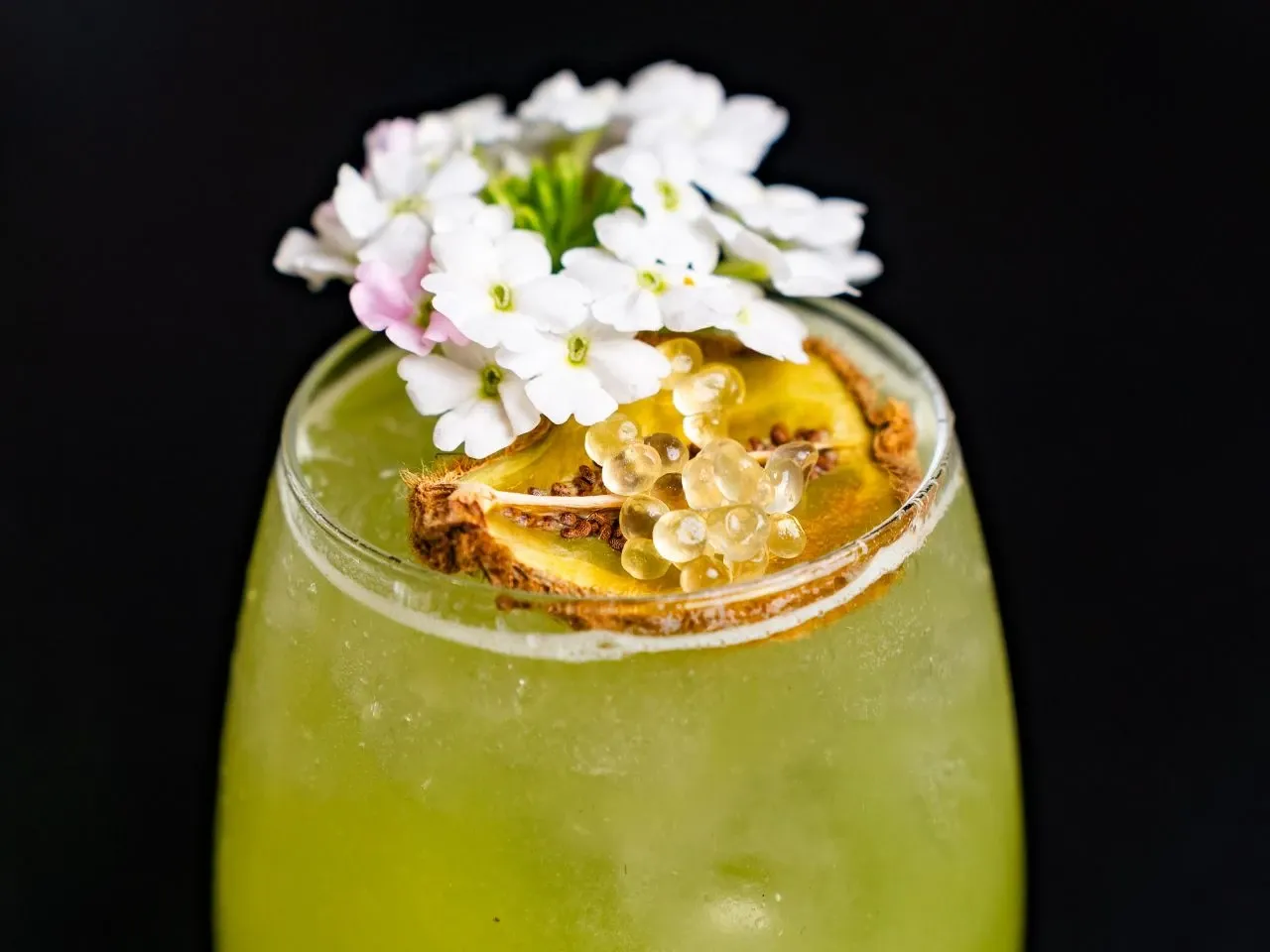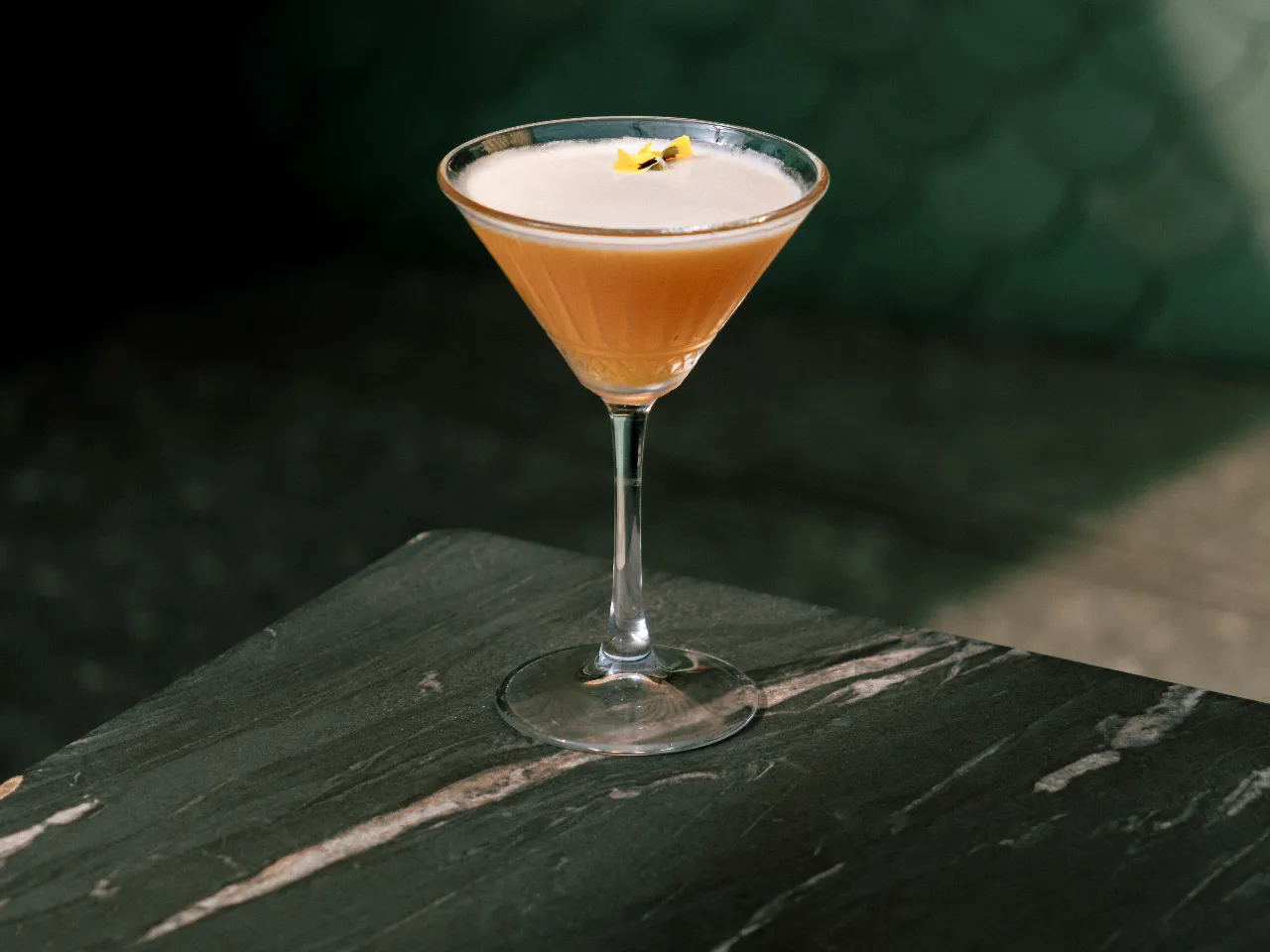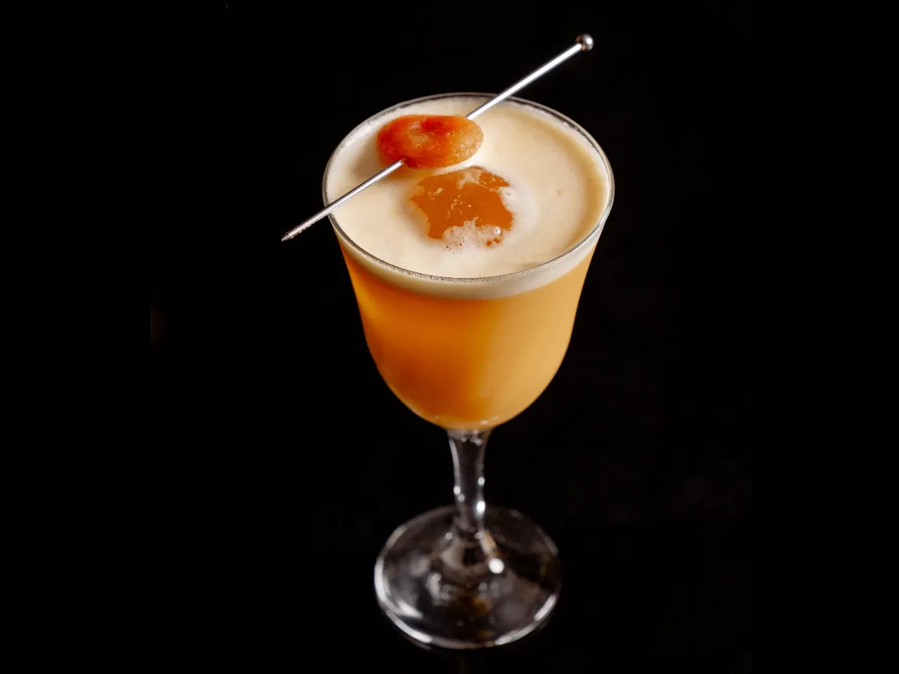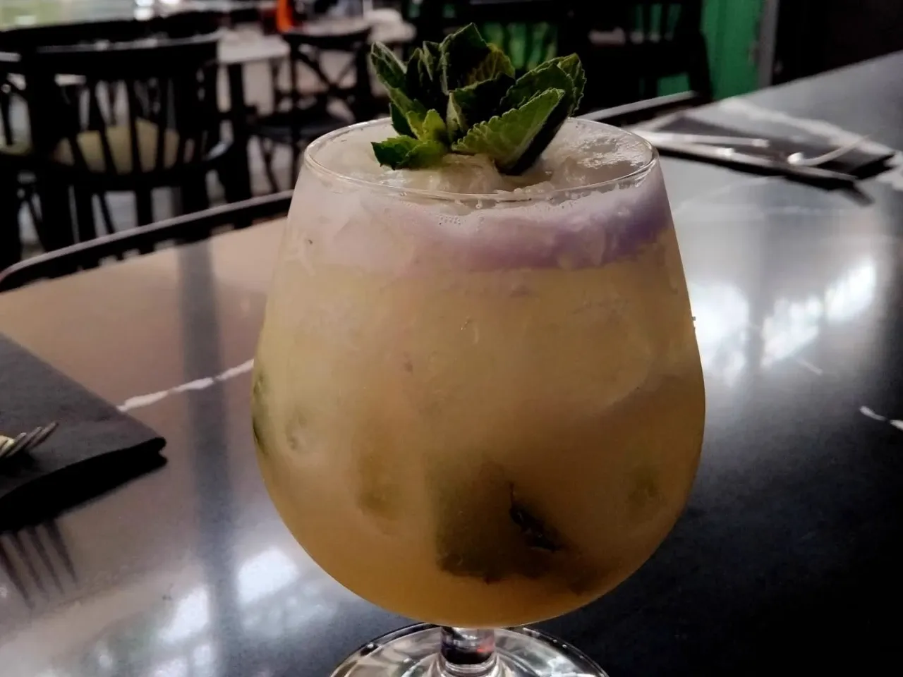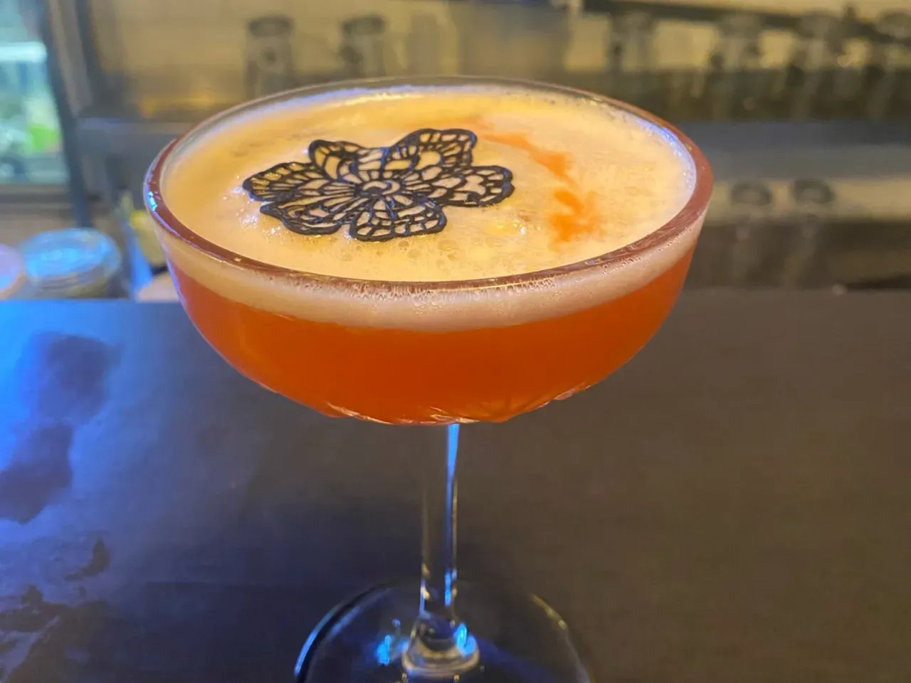 Absolut vodka, zumo de maracuyá, te de jazmín, syrup de la casa, albumina y deshidratado de naranja y flor de menta