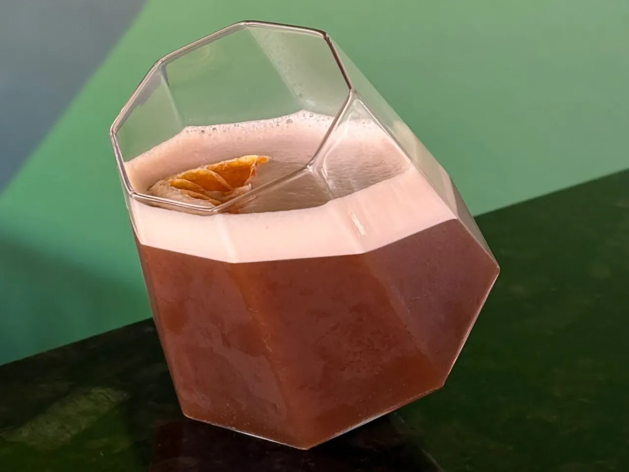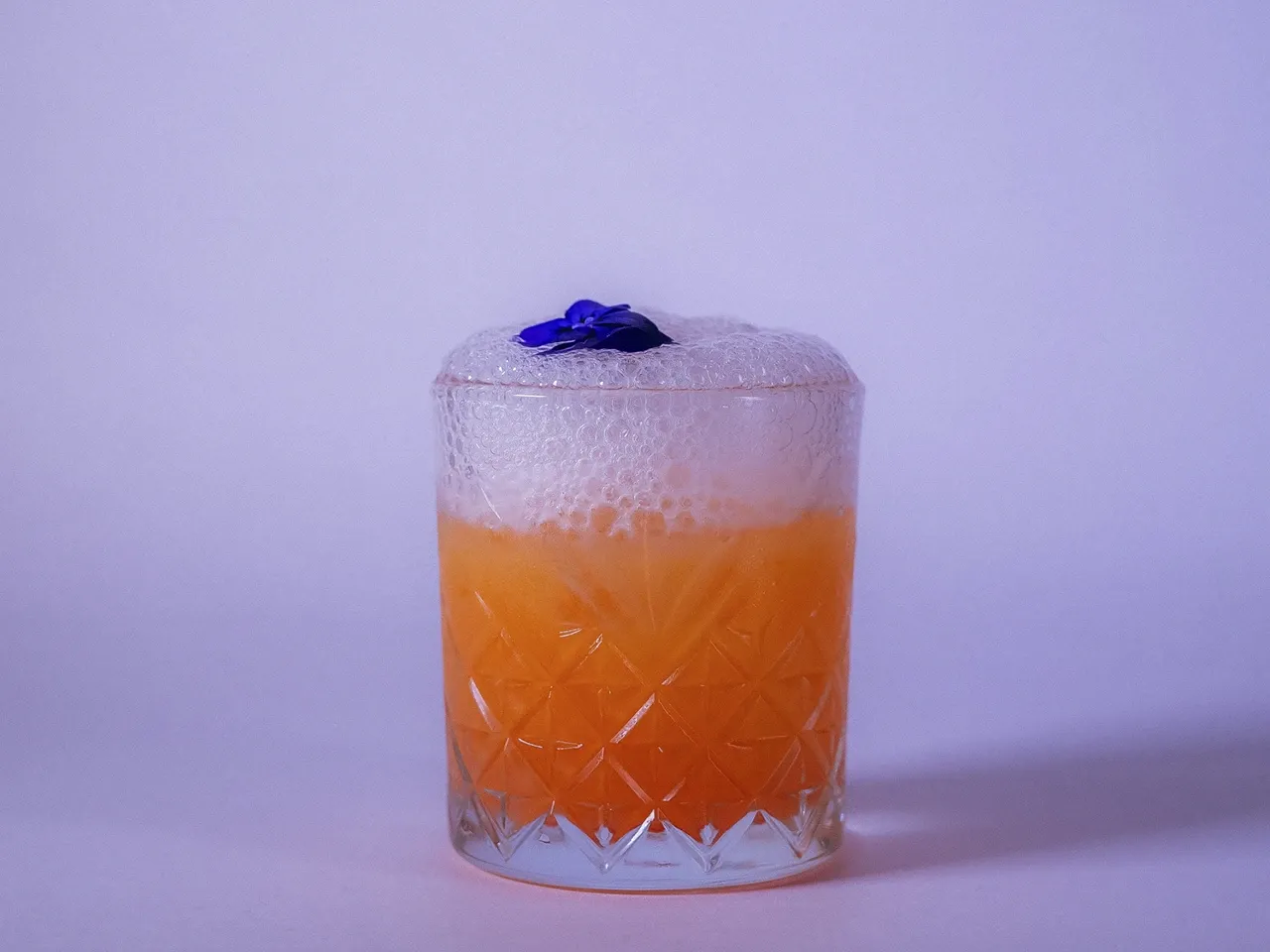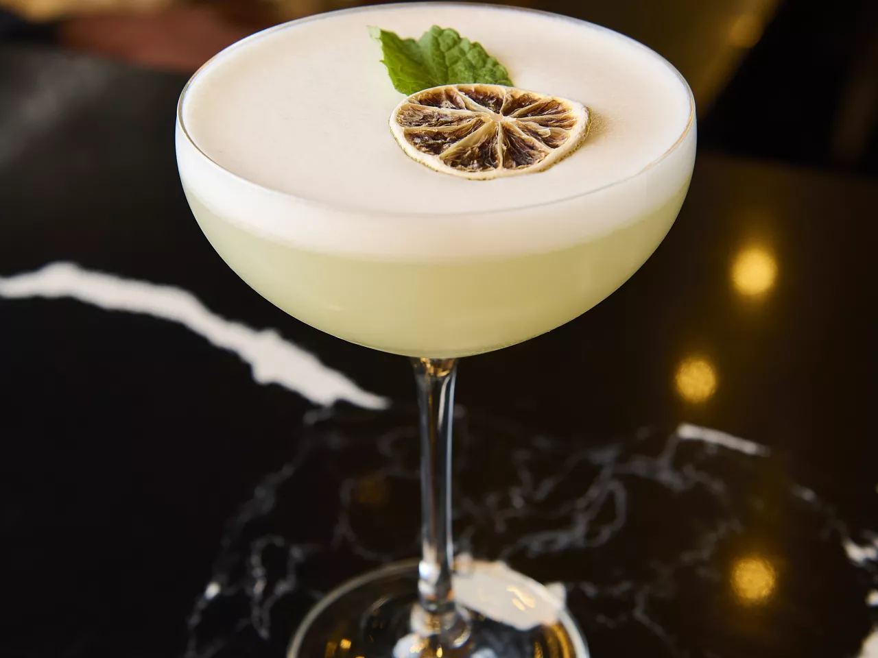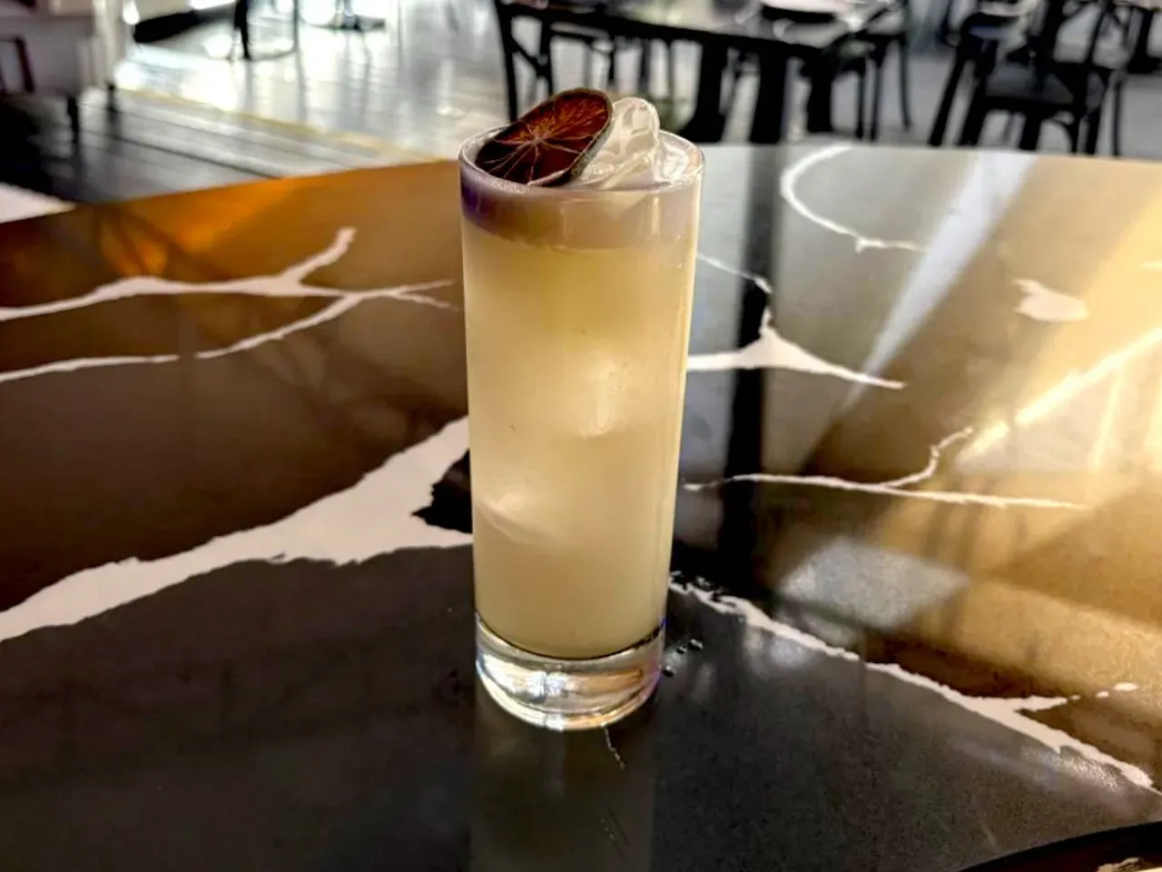 Absolut vodka, zumo de maracuyá, te de jazmín, syrup de la casa, albumina y deshidratado de naranja y flor de menta