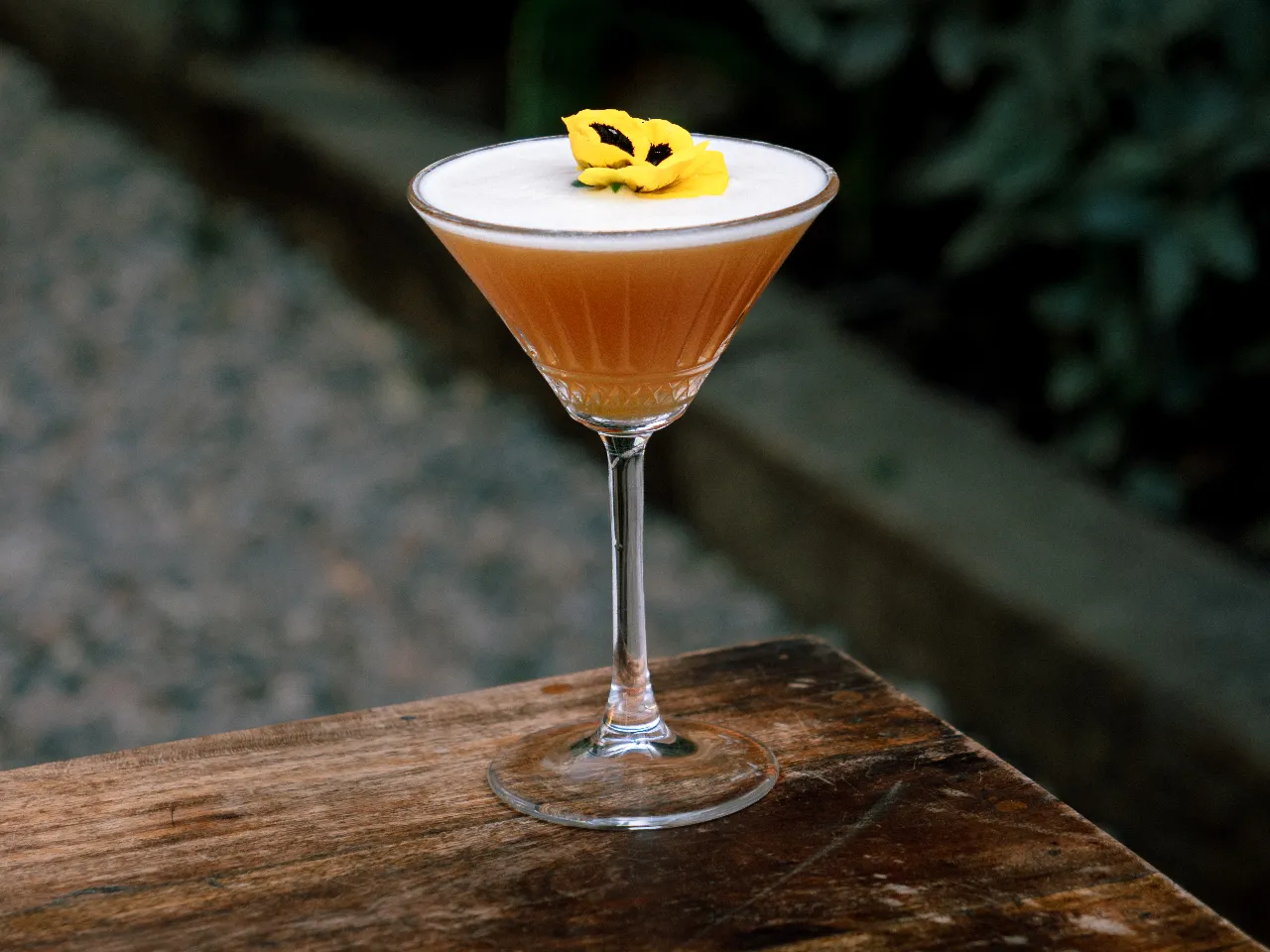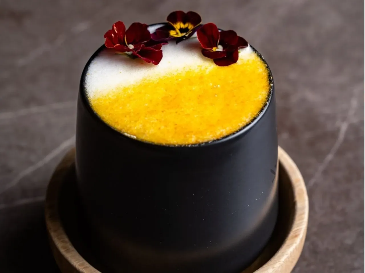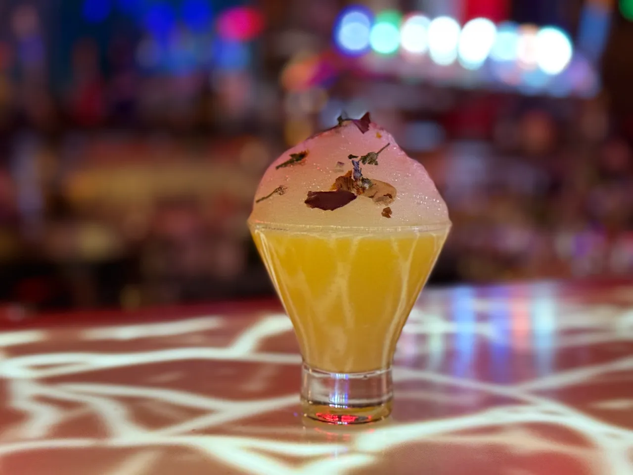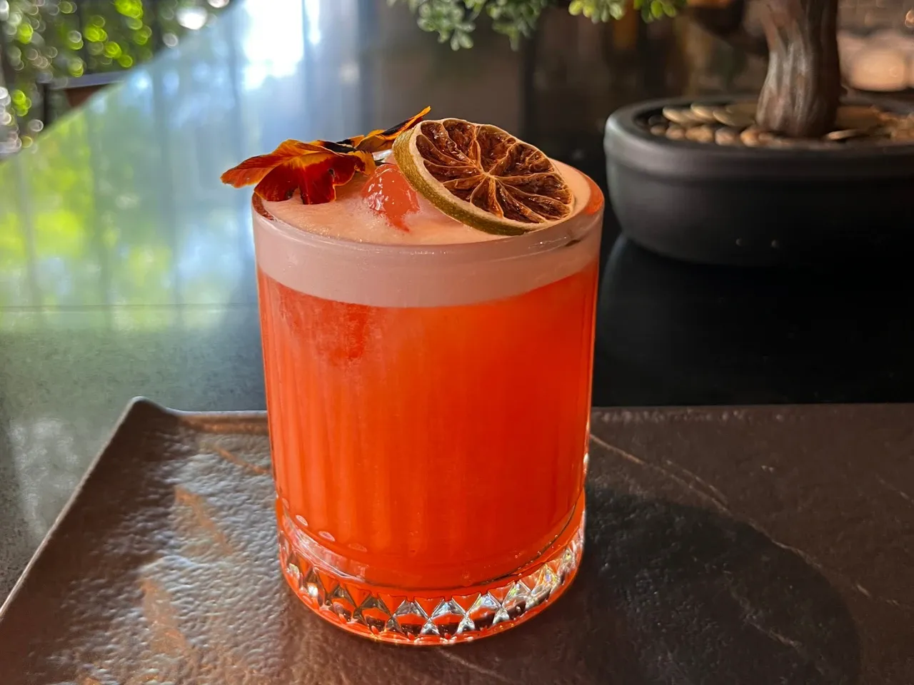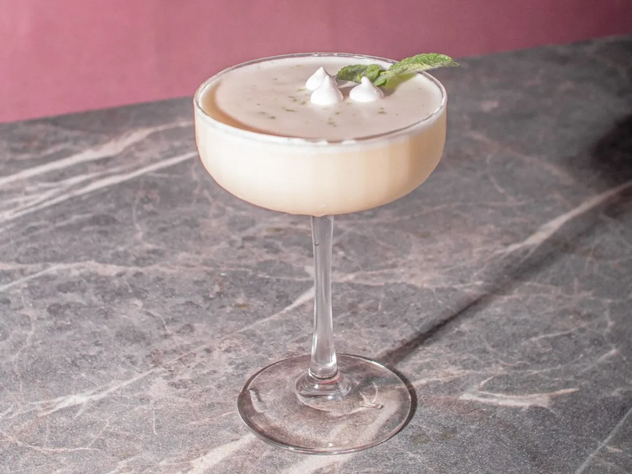 Absolut vodka, zumo de maracuyá, te de jazmín, syrup de la casa, albumina y deshidratado de naranja y flor de menta