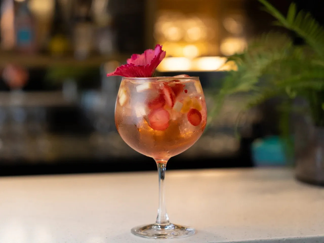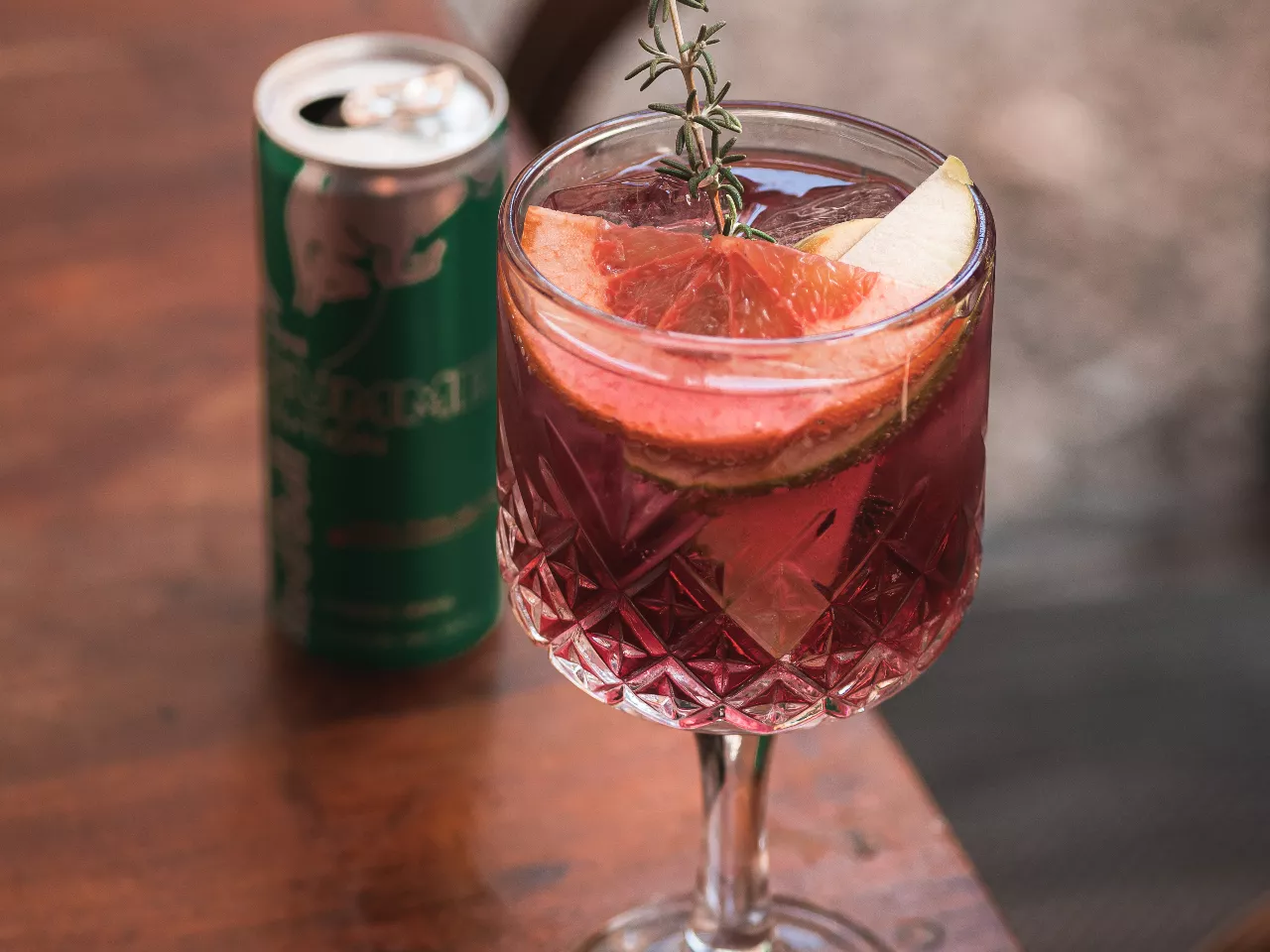 Espumante viña Mar brut, pisco mistral Apple, Redbull fruta del dragón , acompañado de frutas. Manzana verde, pomelo y romero fresco, coronado con canada dry ginger ale .