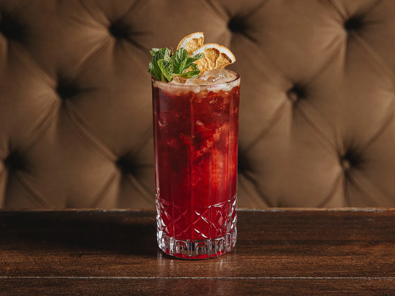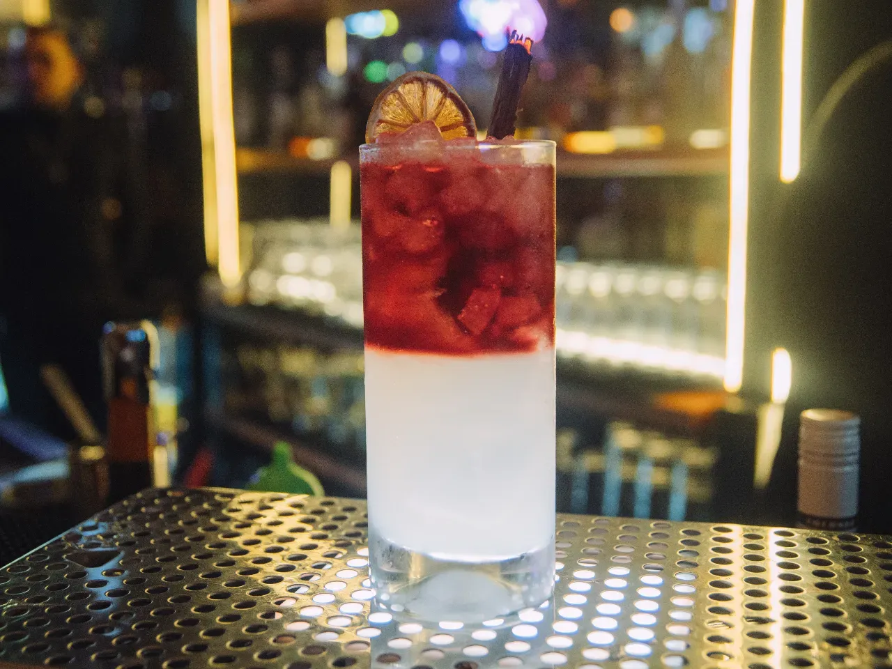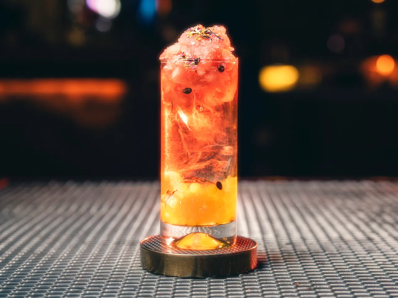¡Temporada de vermut! En este brebaje se entrelazan el clásico Campari, el vermut Carpano rosso, jarabe de té rojo, tónica y un mix de zumo de maracuyá y pomelo.
