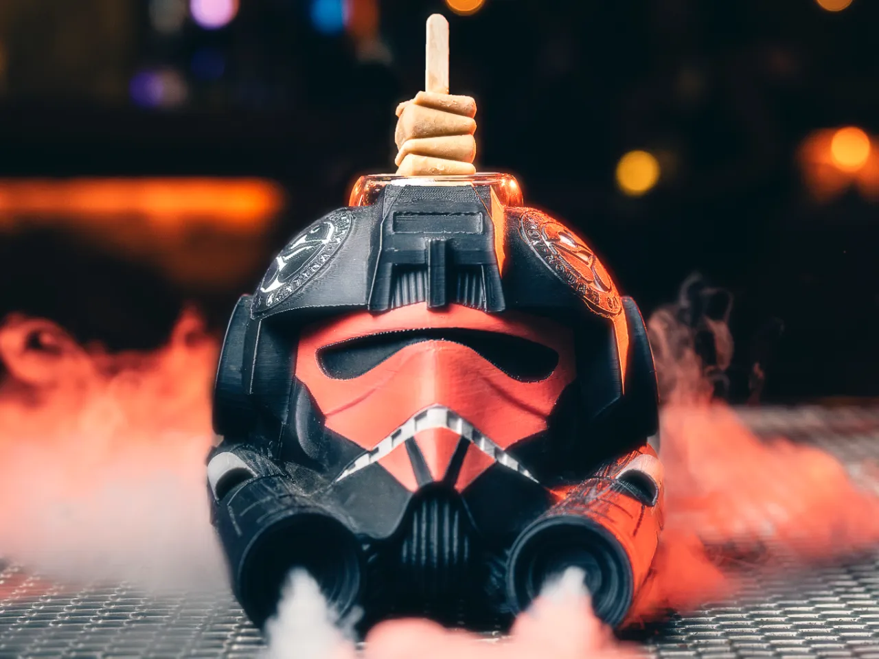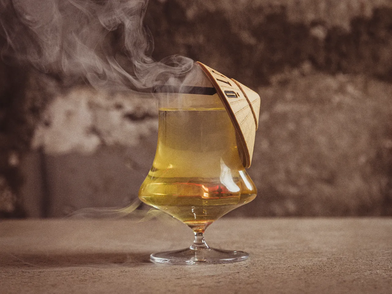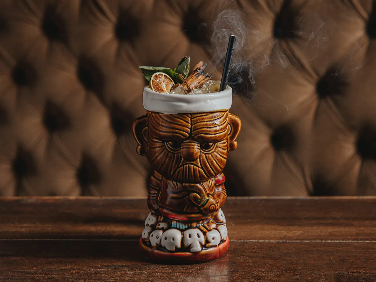 Ron Bacardí Oakheart especial ahumado, mix de cítricos, syrup y menta, ahumado con madera y cáscaras de naranja.
