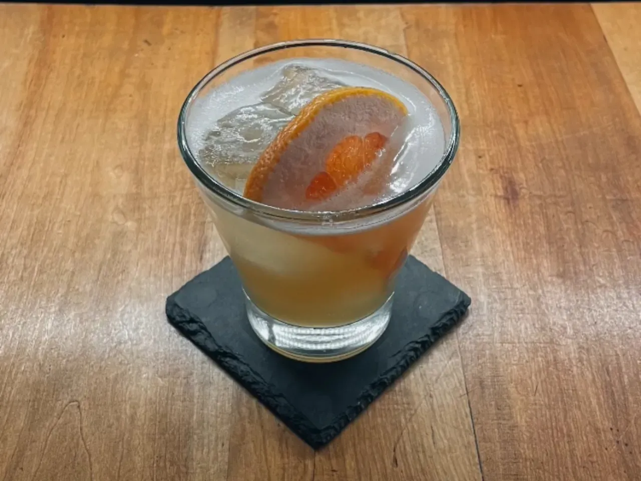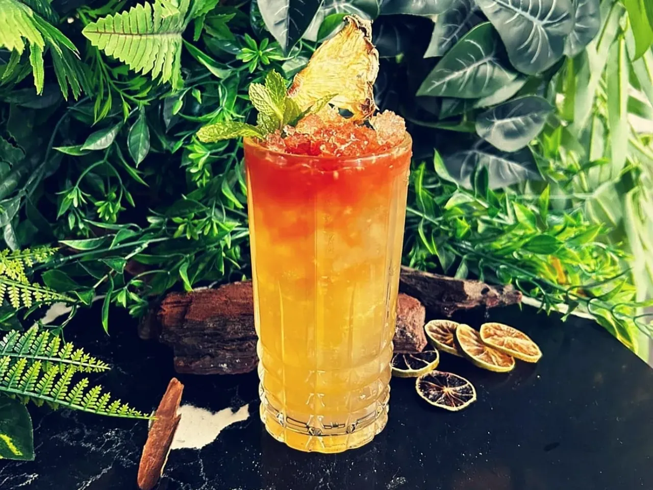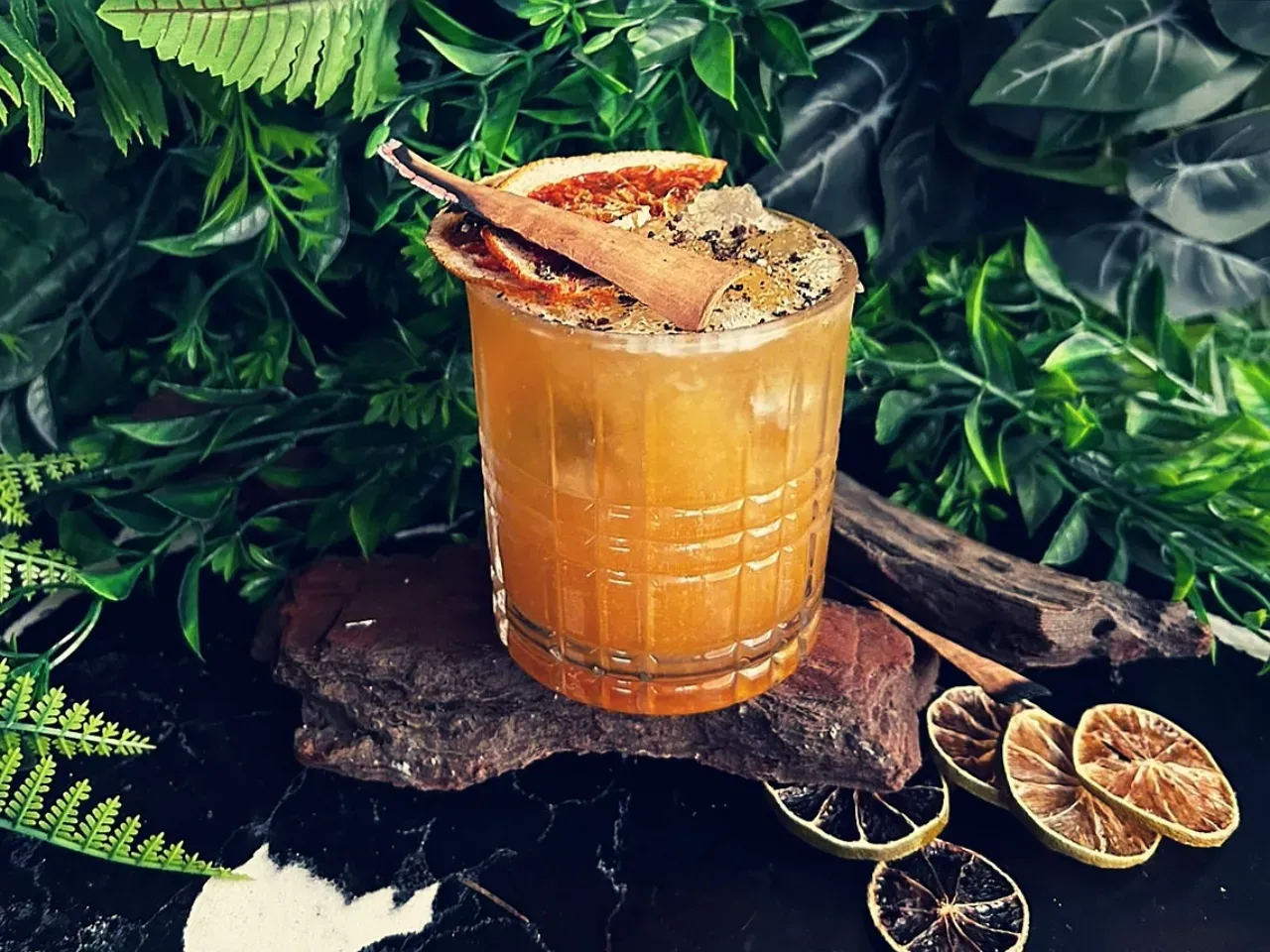 Coctel a base de ron, hierbas salvajes, zumo de pomelo, mix tamarindo/maracuyá y syrup de azúcar rubia y canela.