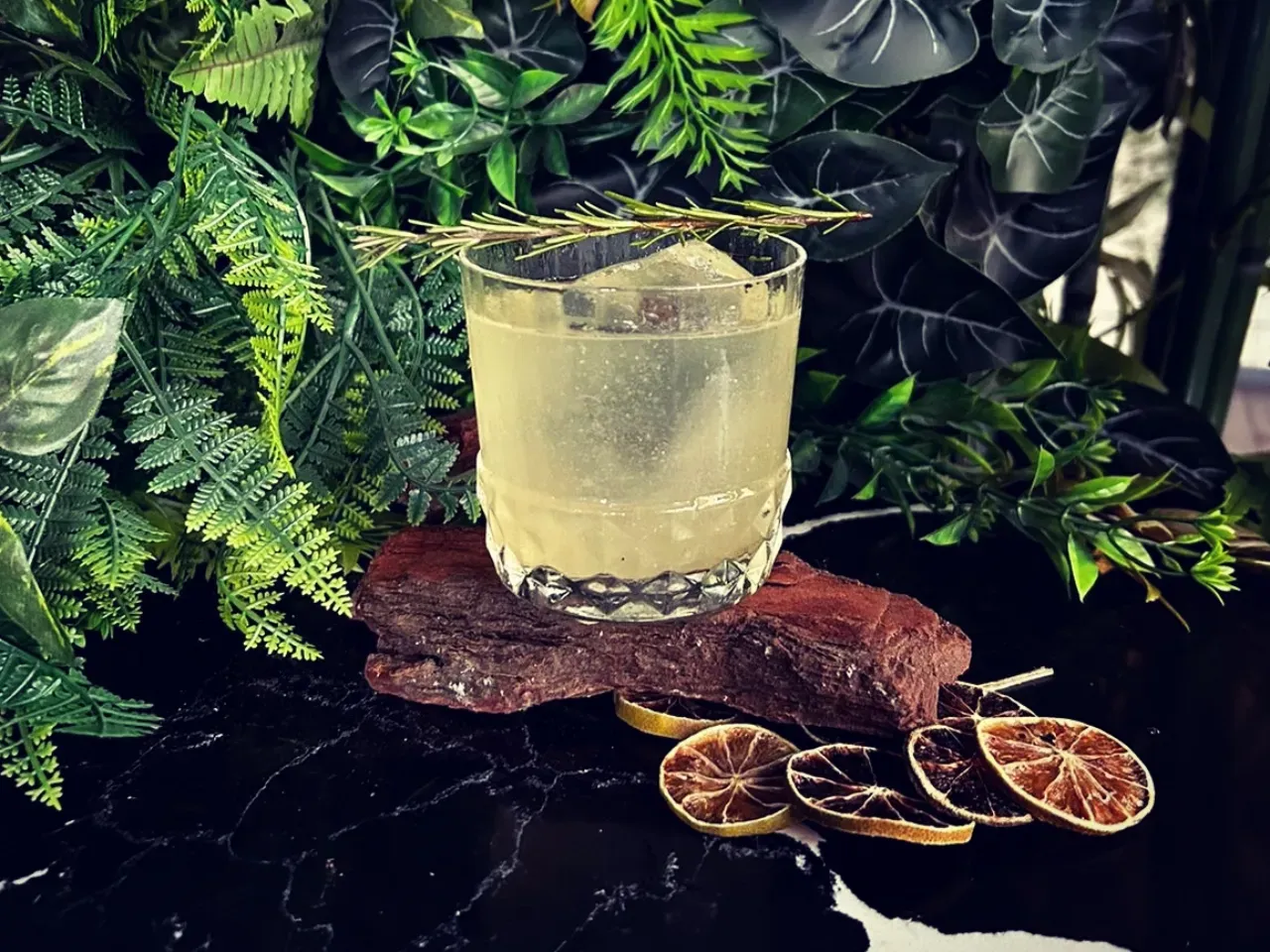 Whisky, sake, limón, albahaca, romero y syrup