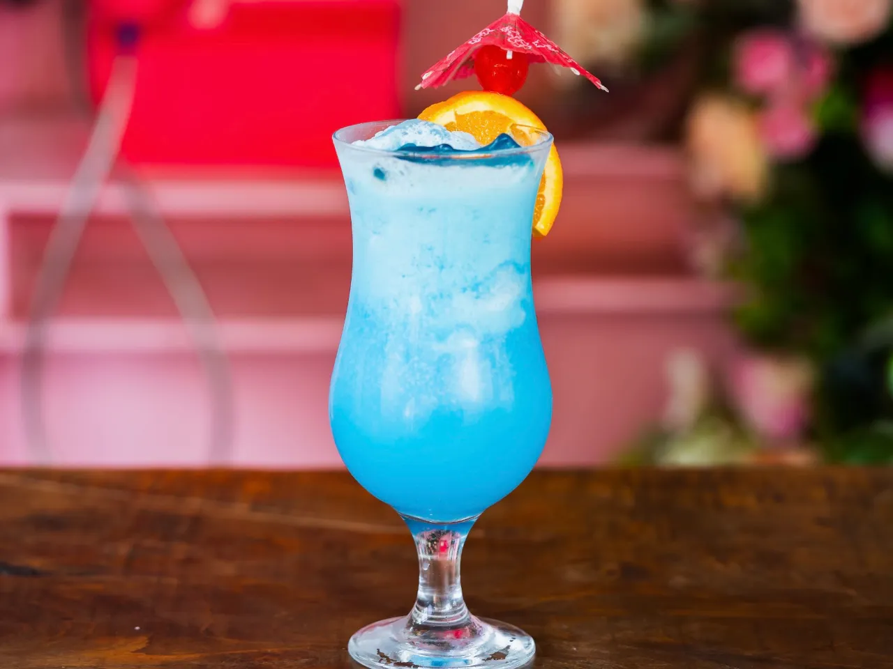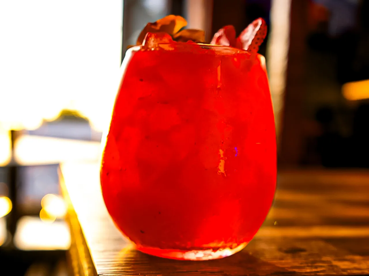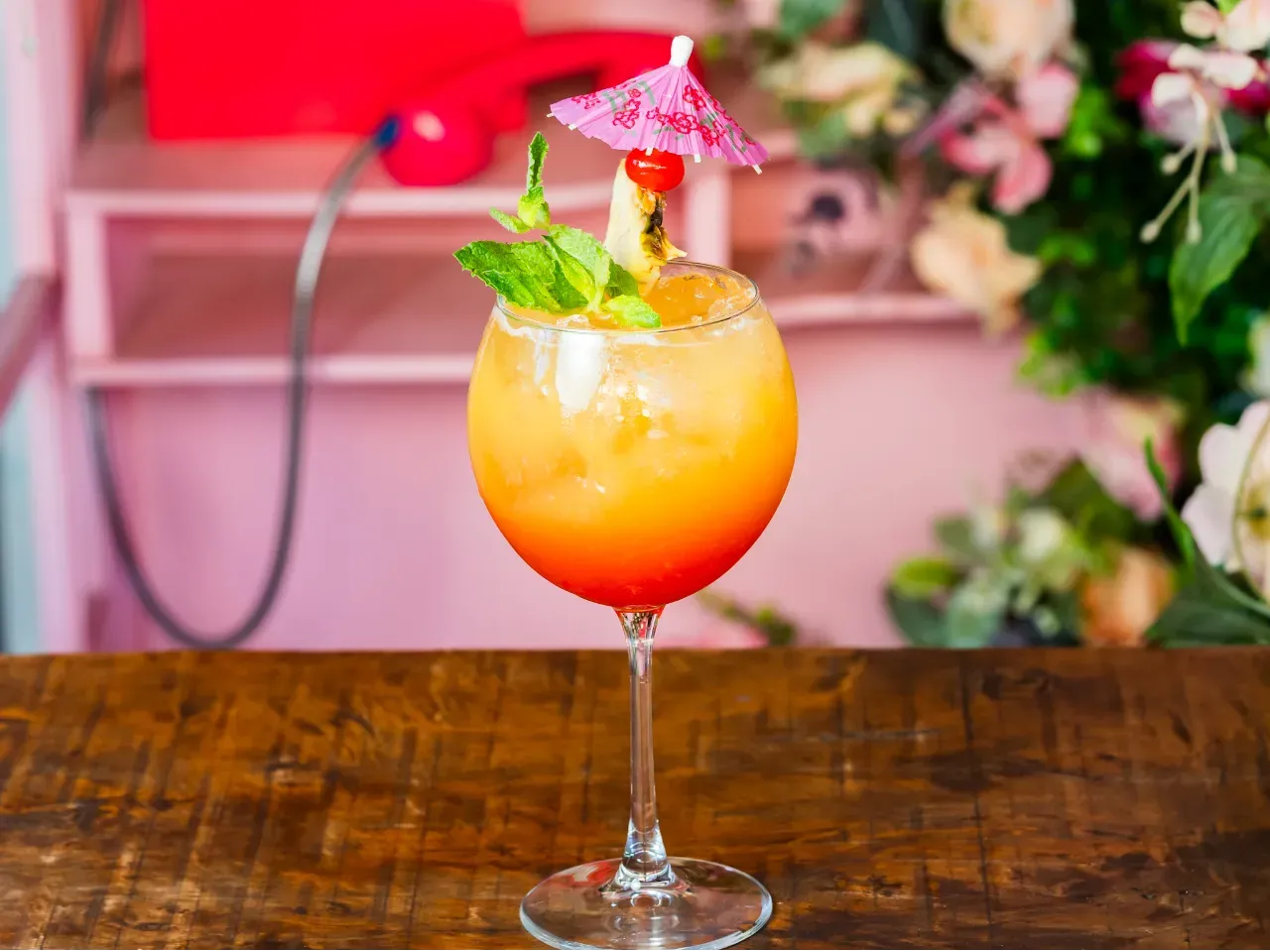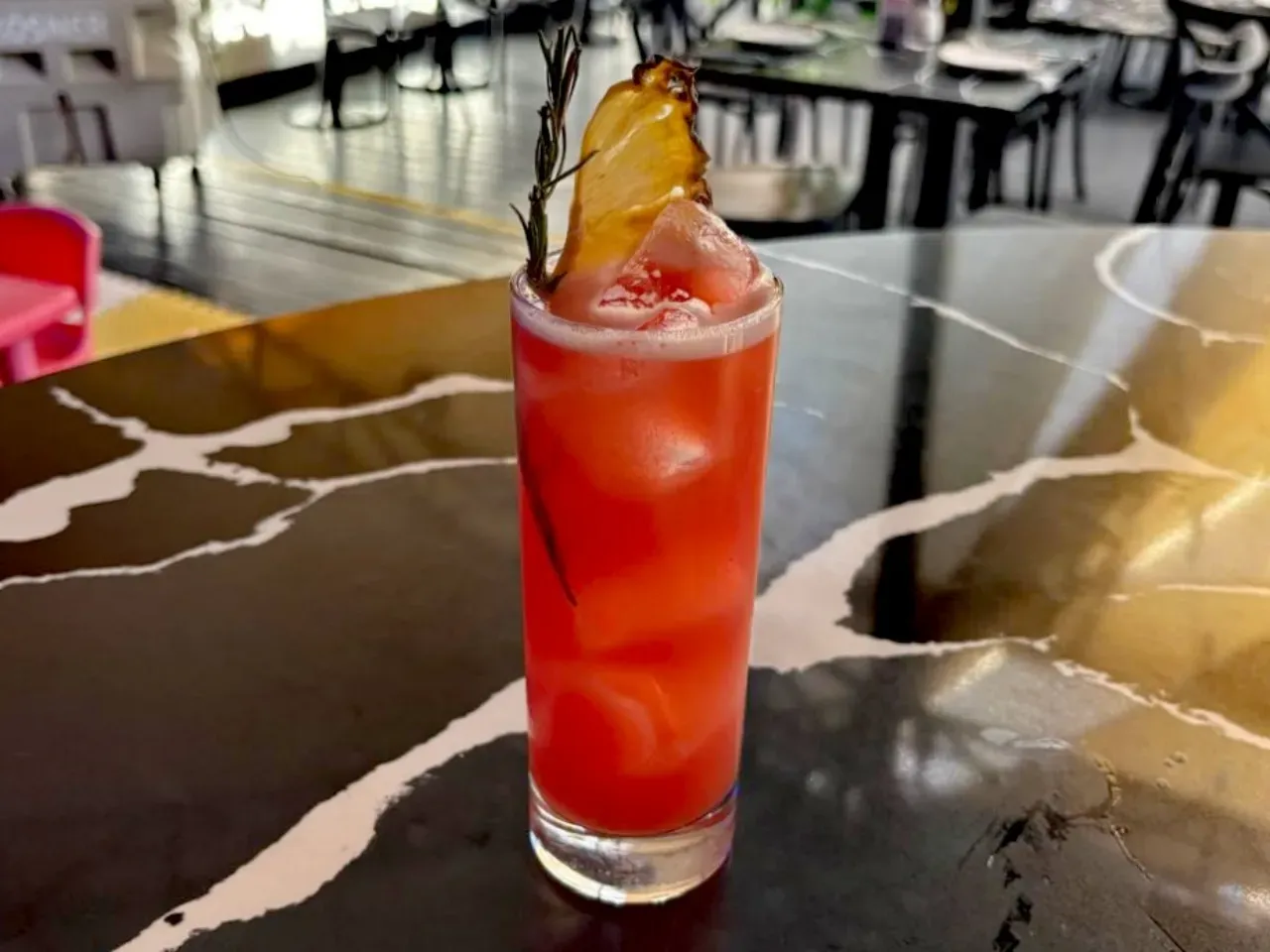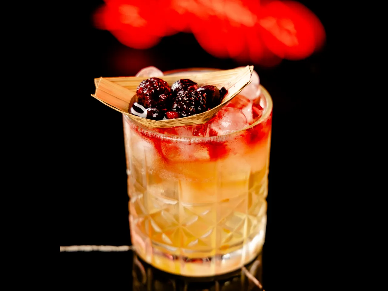 Ron bacardi añejo, campari , jugo de piña, syrup, zumo de limón y reducción infusionada de Flor de Jamaica.