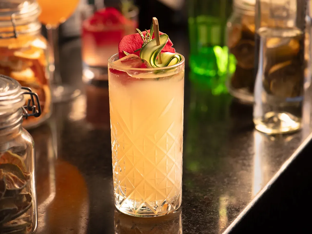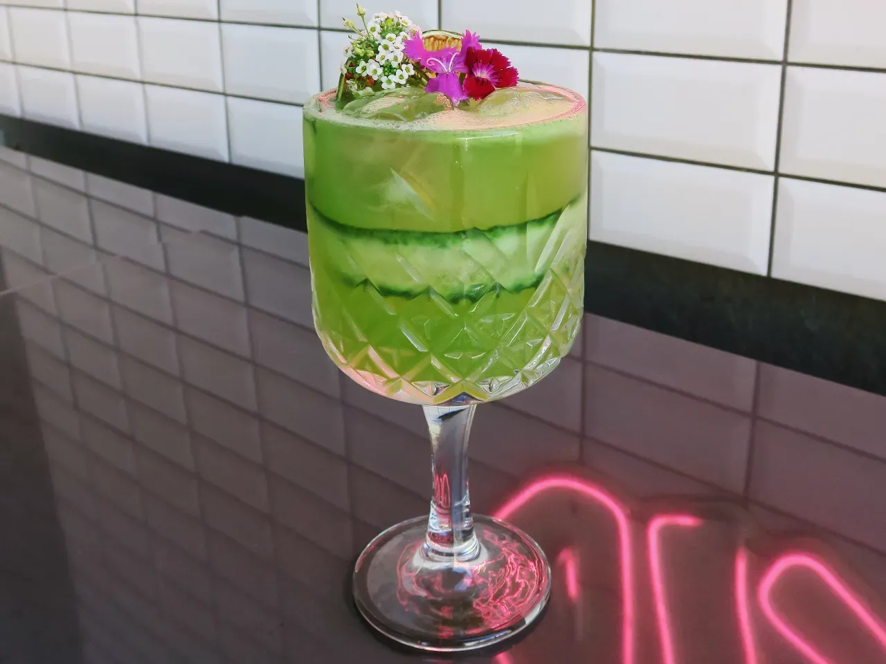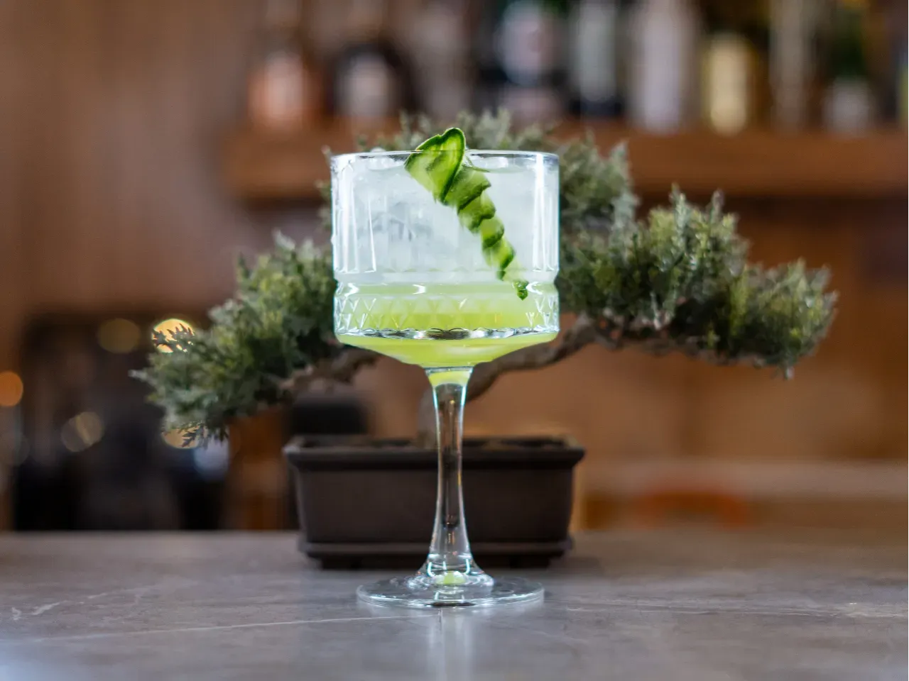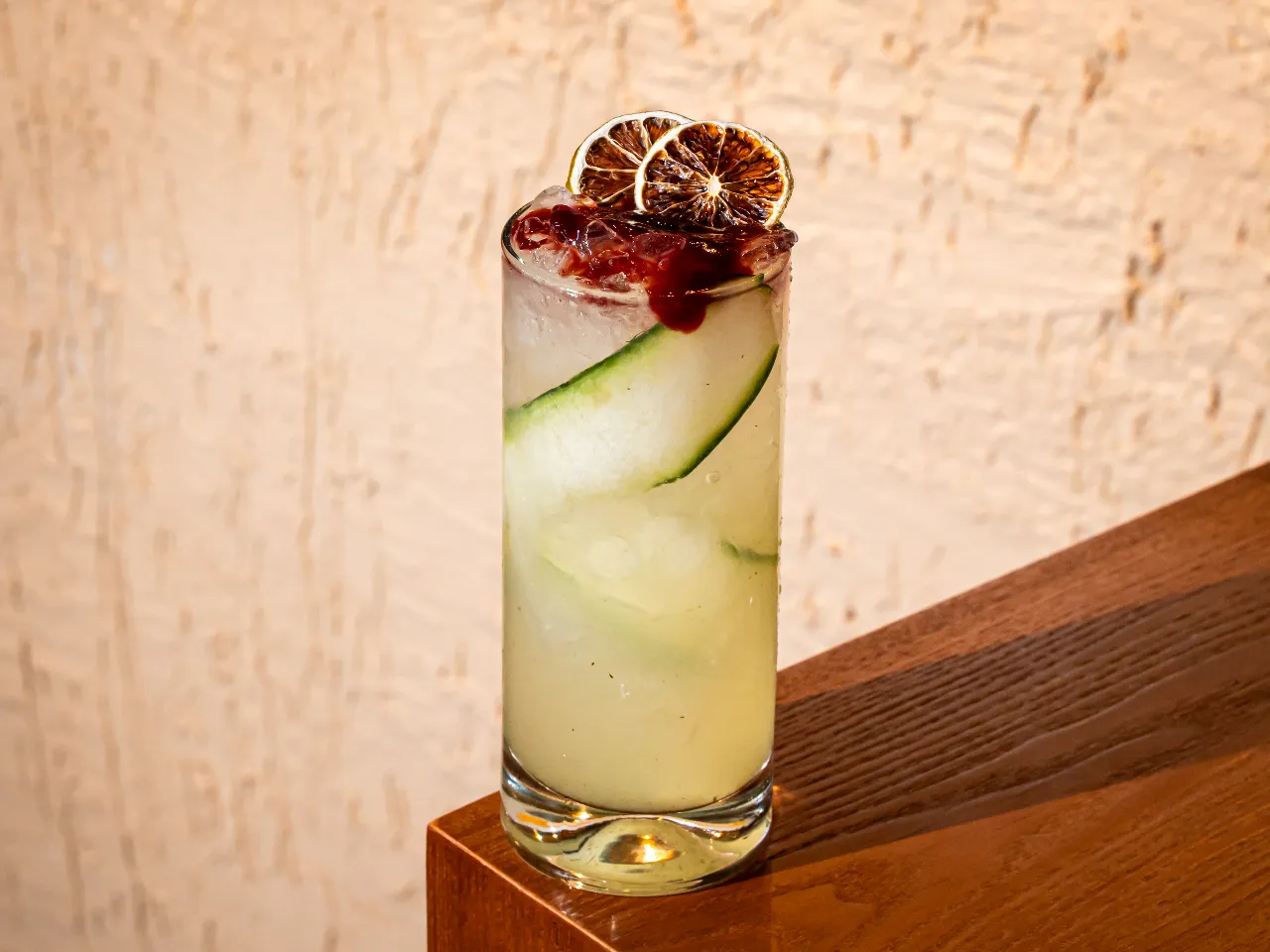 Gin macerado en cranberry y shēng de arándanos, agua fresca de pepino, terminado con yuzusoda. Equilibrio perfecto entre acidez y frescor.