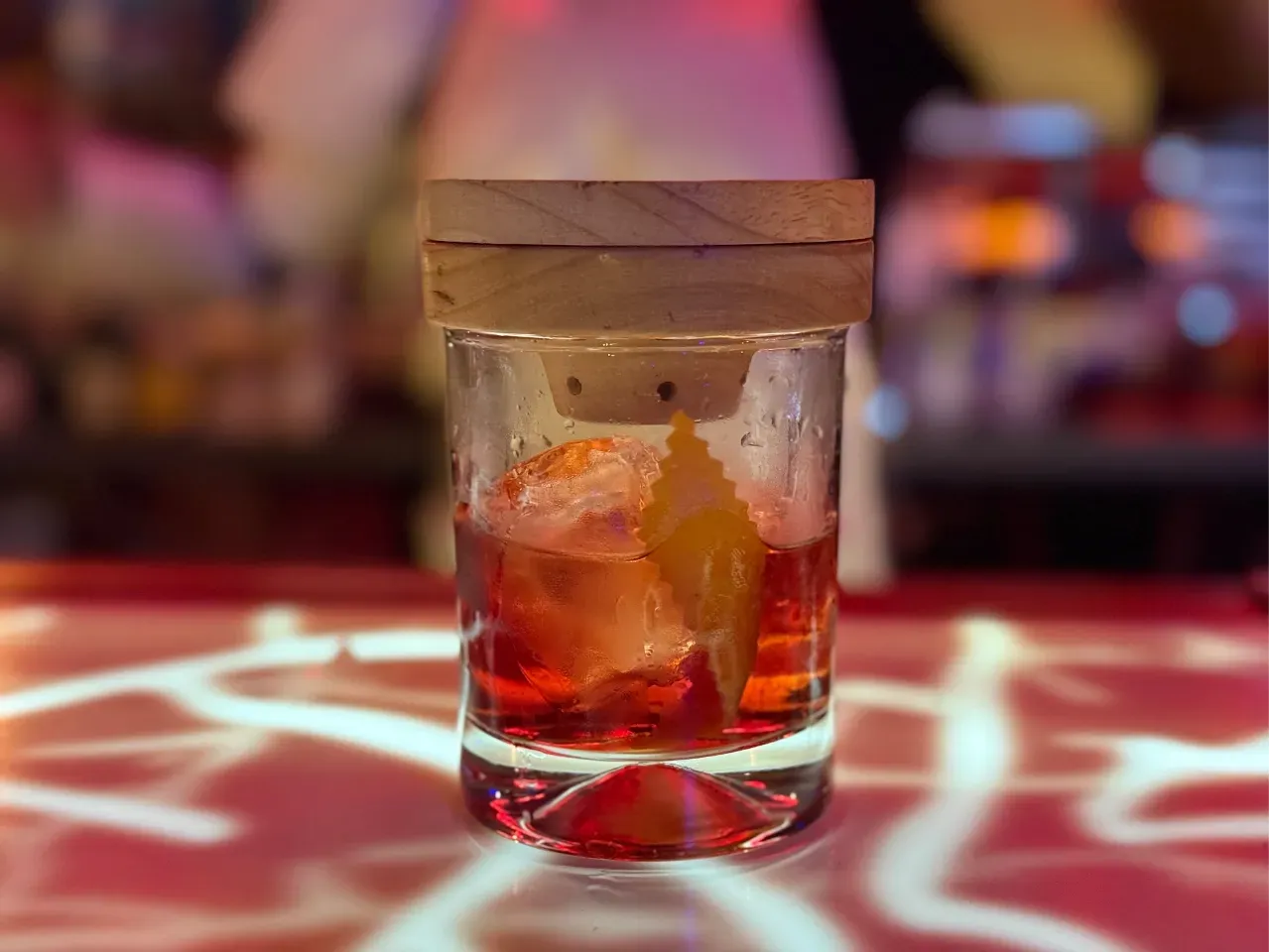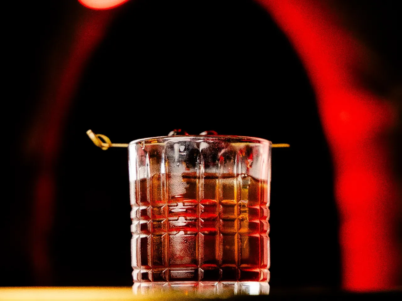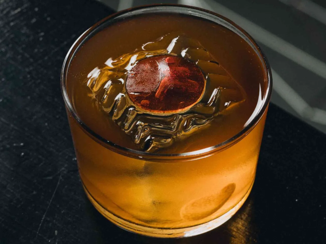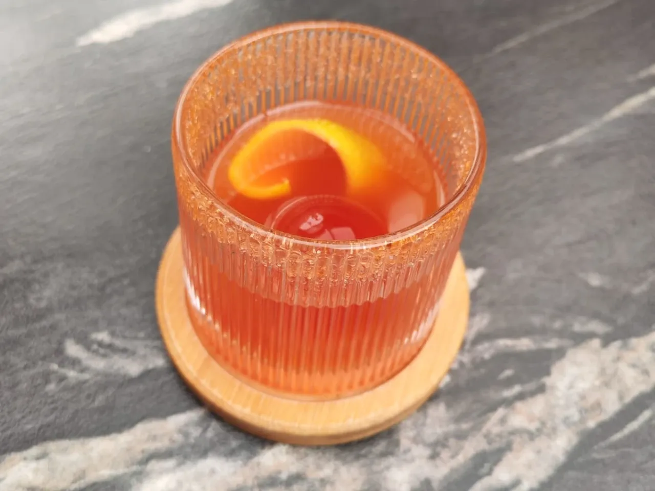 A base de whisky escocés Singleton 12 años, syrup de miel, campari, dash de angostura.