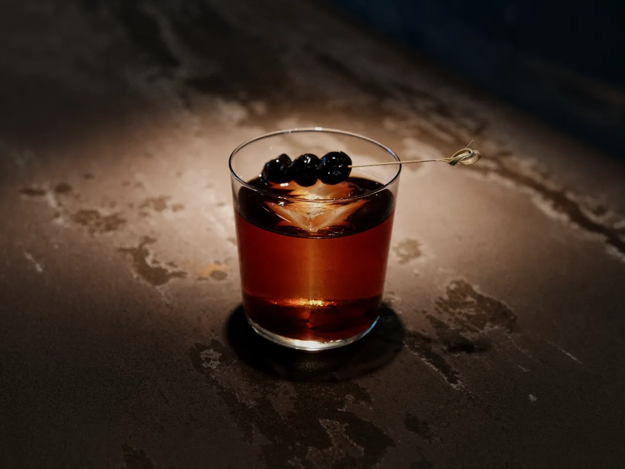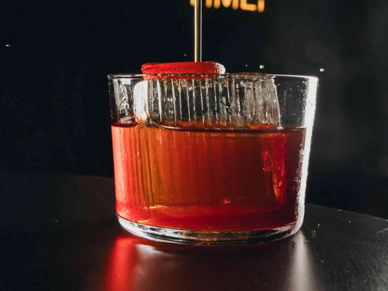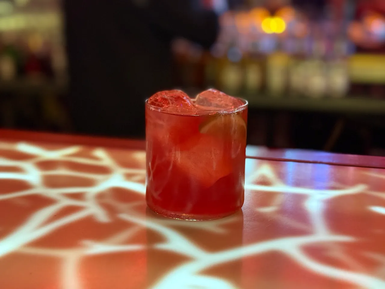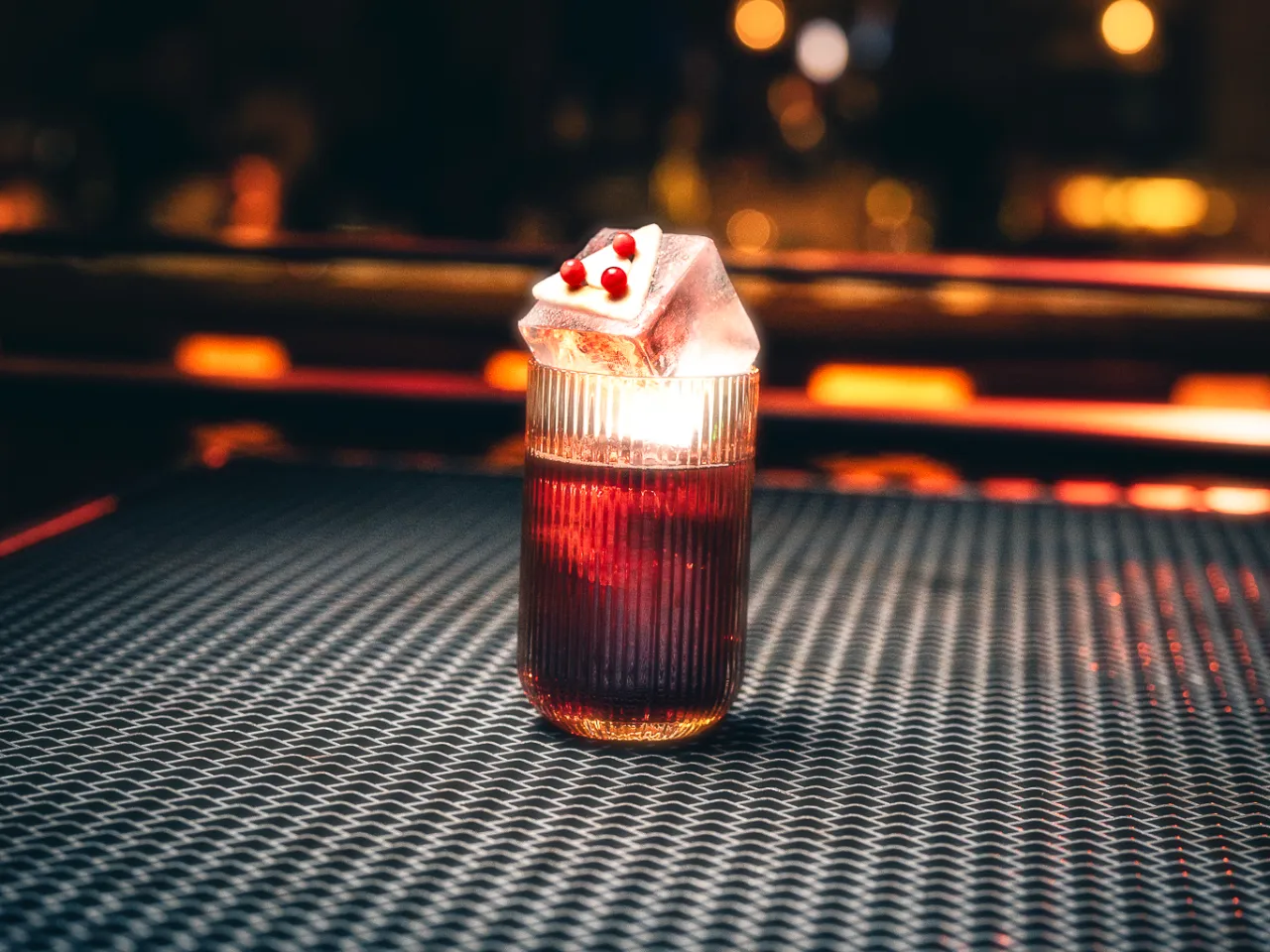 A base de whisky escocés Singleton 12 años, syrup de miel, campari, dash de angostura.
