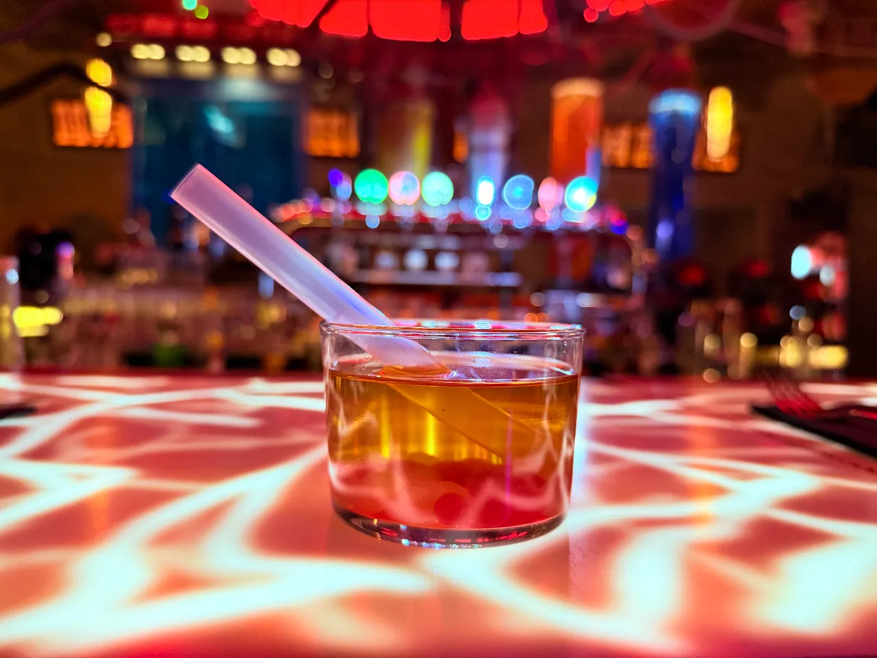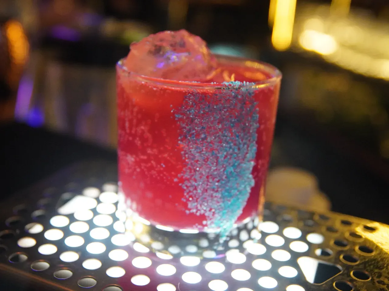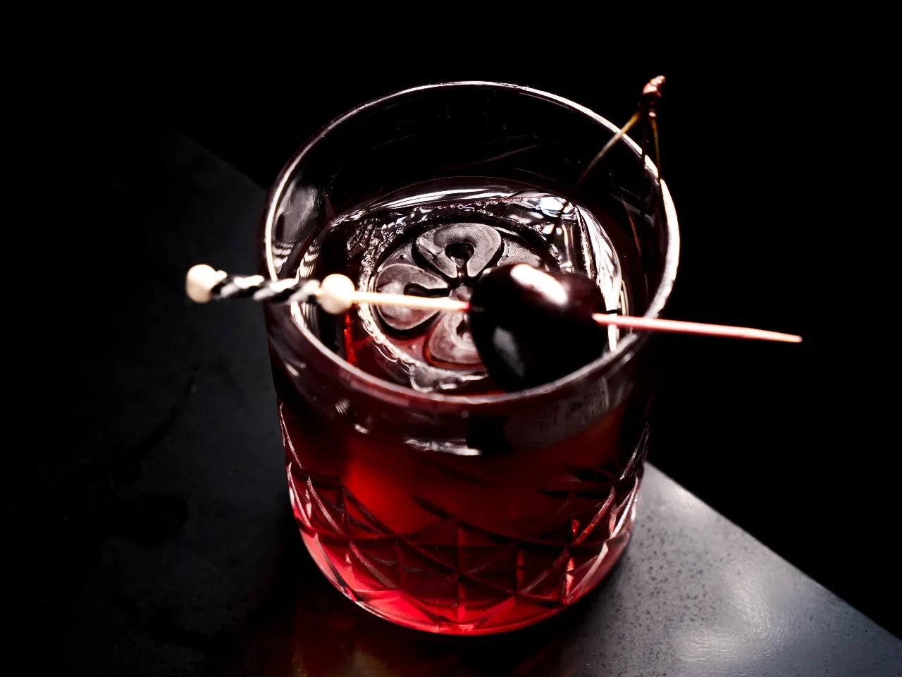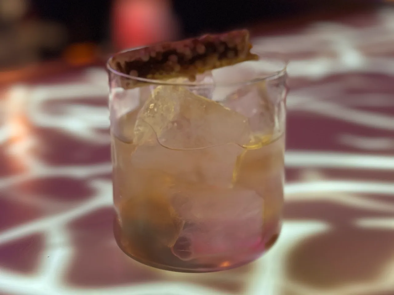 A base de whisky escocés Singleton 12 años, syrup de miel, campari, dash de angostura.
